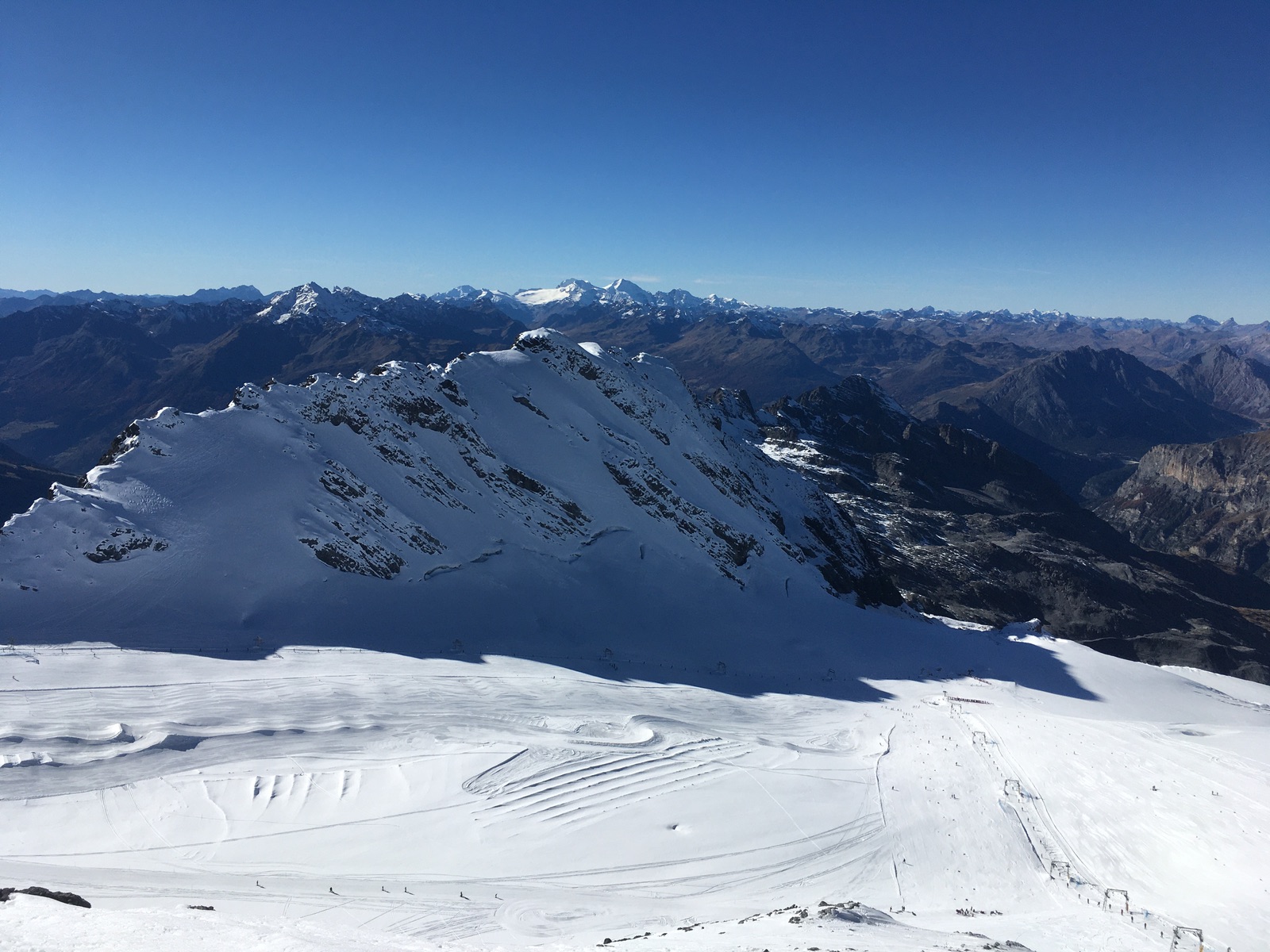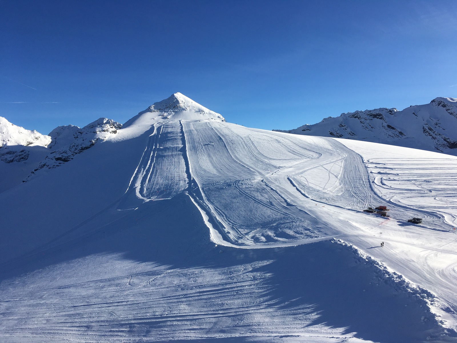 Blick vom Trincerone auf die untere Trainingspiste (da waren gerade die französischen Skicrosser da):