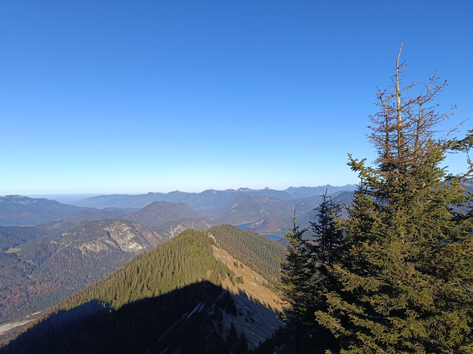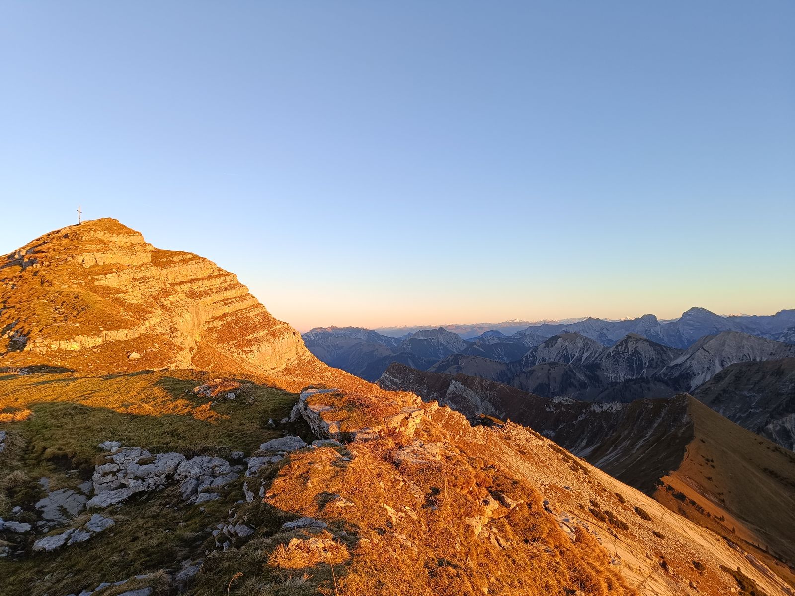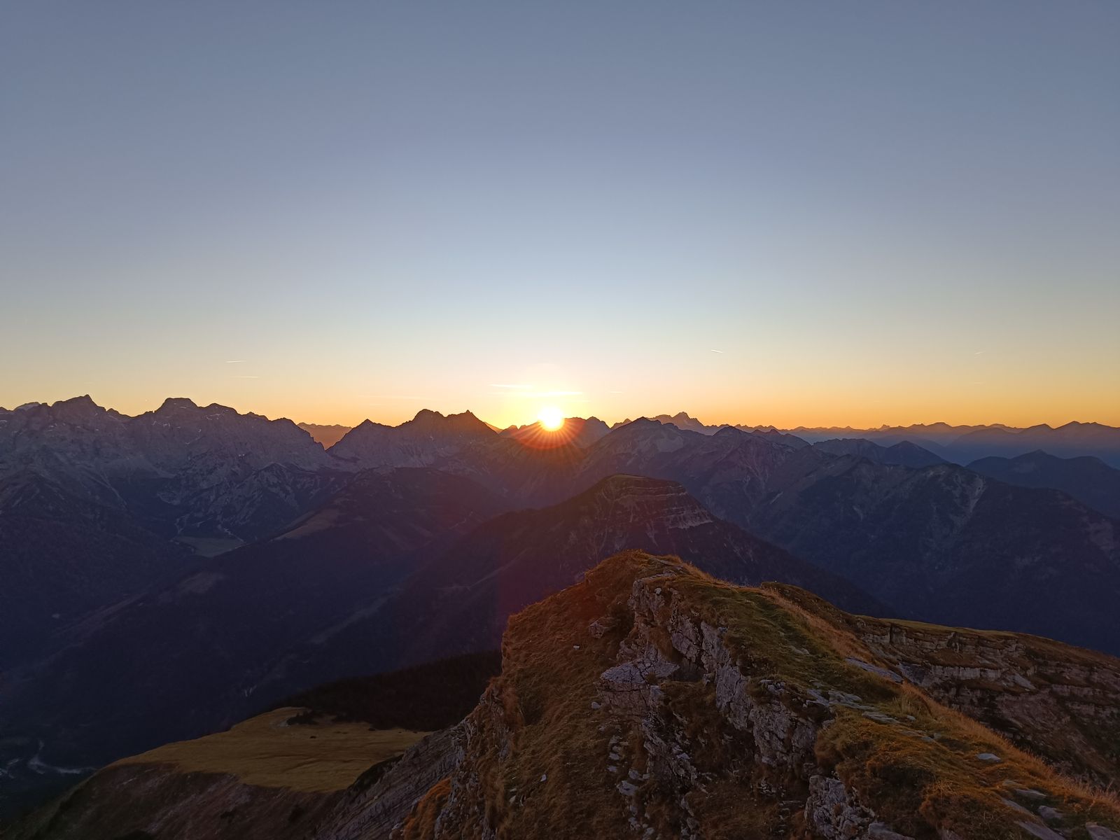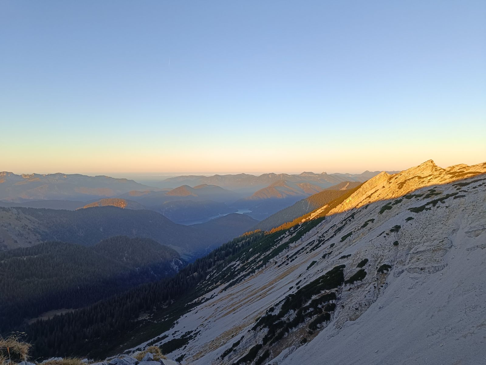Am Montag bin ich nach der Arbeit am frühen Nachmittag zur Tölzer Hütte aufgebrochen, um dort im Winterraum zu übernachten. Aufstieg über den Reitsteig im Stuhlbachtal, noch schnell das Grasköpfl mitgenommen und dann zum Schafreuther-Gipfel, den ich just zum Sonnenuntergang um 16.45 Uhr erreichte.