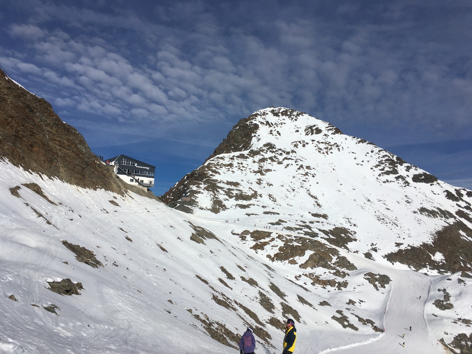 Samstag ging es auf die Schaufelspitze - wohl die klassische Skitour im Herbst / Frühwinter am Stubaier Gletscher. Geöffnet waren die Pisten bis zum Gamsgarten (ca. 2.627 m). Ich bin aber von der Talstation zu Fuß hoch über den Wanderweg bis zur Mittelstation Fernau (dabei Achtung auf die Eisgallen am Weg) und dann weiter auf der Gamsgartenpiste, wo man mit einigen Malen abschnallen schon hoch kam. Natürlich kann man auch mit den Bergbahnen hochfahren, was die wenigen erspähten anderen Tourengeher wohl auch gemacht haben. Ab dem Gamsgarten bei sehr viel Betrieb am Pistenrand bis zur Bergstation der Schaufelspitzbahn - bemerkenswert, wie sich hier in den letzten Jahren das Gelände durch den Gletscherrückgang geändert hat. Zuletzt bin ich die Südflanke ziemlich steil hoch und die letzten ca. 30 Hm sicherheitshalber zu Fuß zum Gipfelkreuz. Am Nachmittag war dann die Flanke teilweise leicht aufgefirnt, teilweise hart - aufgrund alter Spuren allerdings kein großer Genuss. Die geöffneten Pisten weisen schattseitig eine zumeist sehr harte Schneedecke auf, häufig ist es sogar Eis. Mit den alten Tourenski nicht so toll, aber die guten Skier würde ich angesichts der Steine im freien Gelände lieber nicht nehmen.