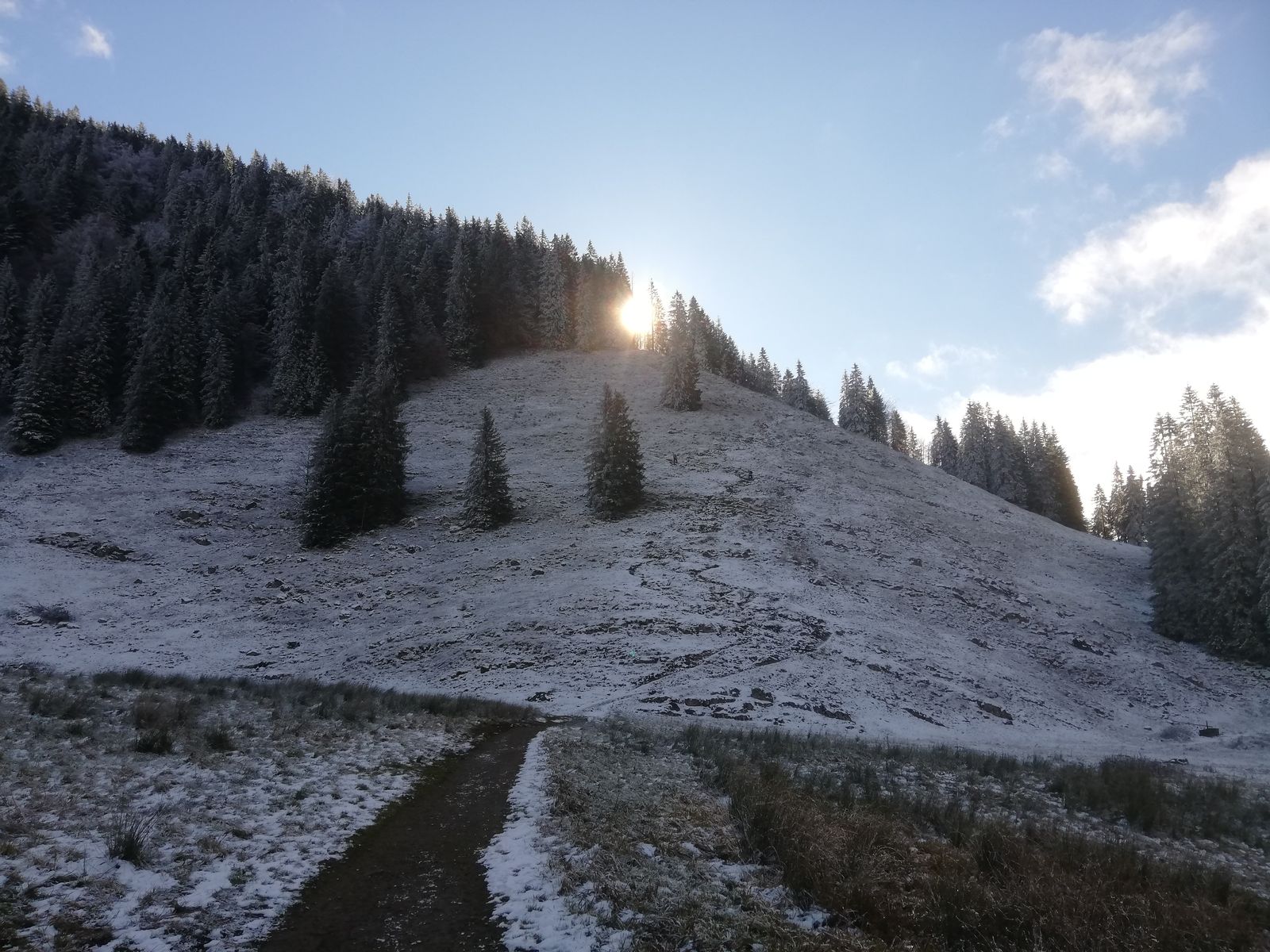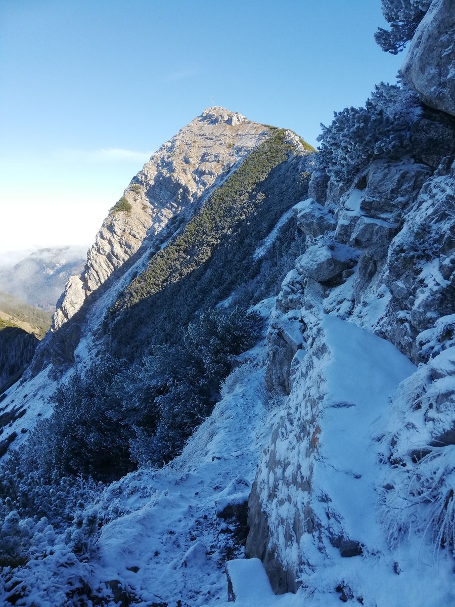 Aufstieg vom Spitzingsattel auf Weg 643 über Schönfeldhütte (geschlossen) und Tanzeck zur Aiplspitz. Ca. 1cm Schneeauflage vom Sattel bis man den Wald verlässt und auf den schattseitigen (und felsigen) Wegstücken nach dem Tanzeck. Dort deshalb auch etwas rutschig. Ansonsten ist der Neuschnee wieder weg.