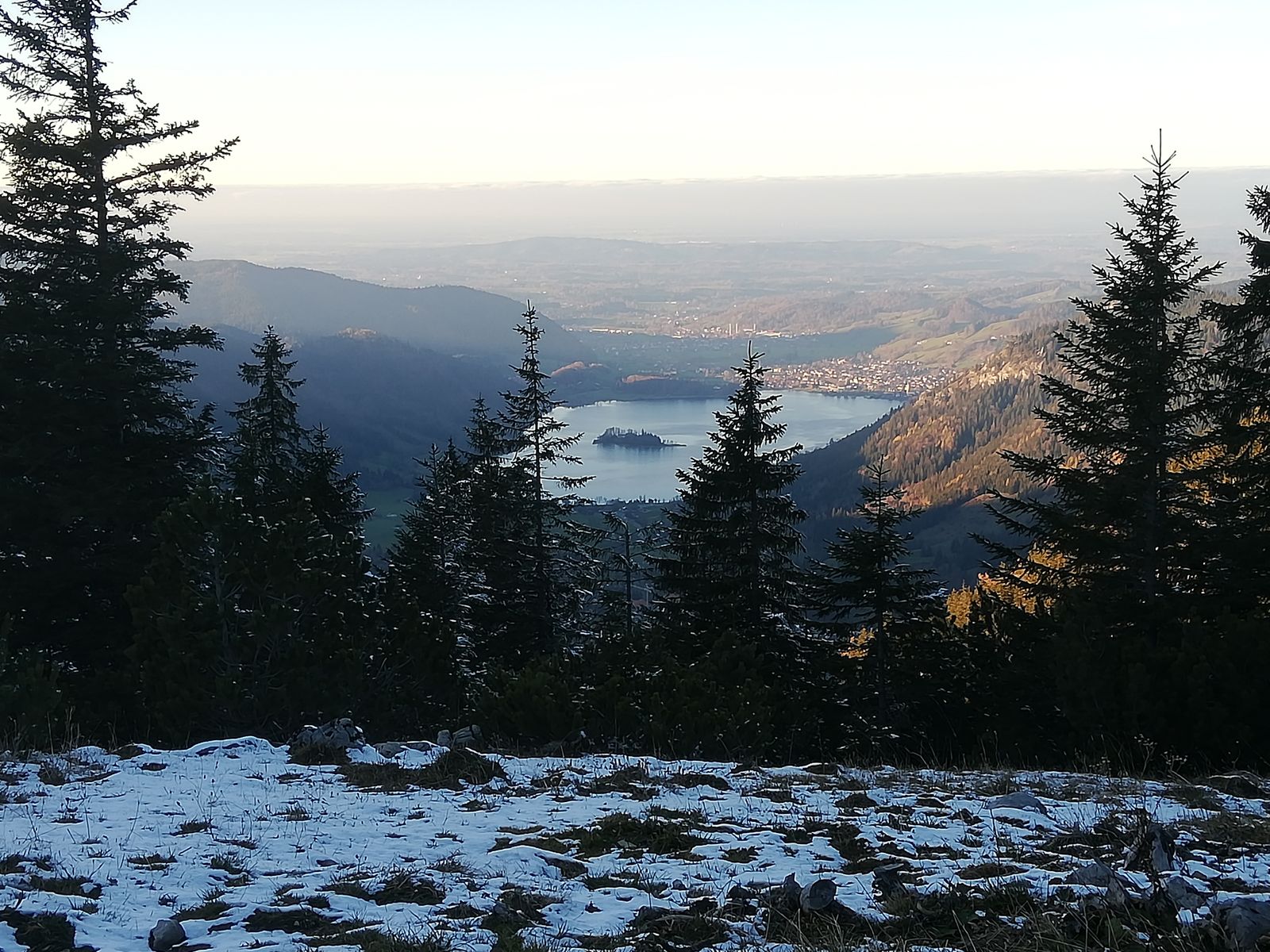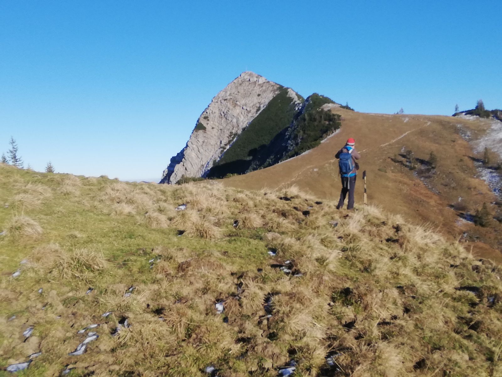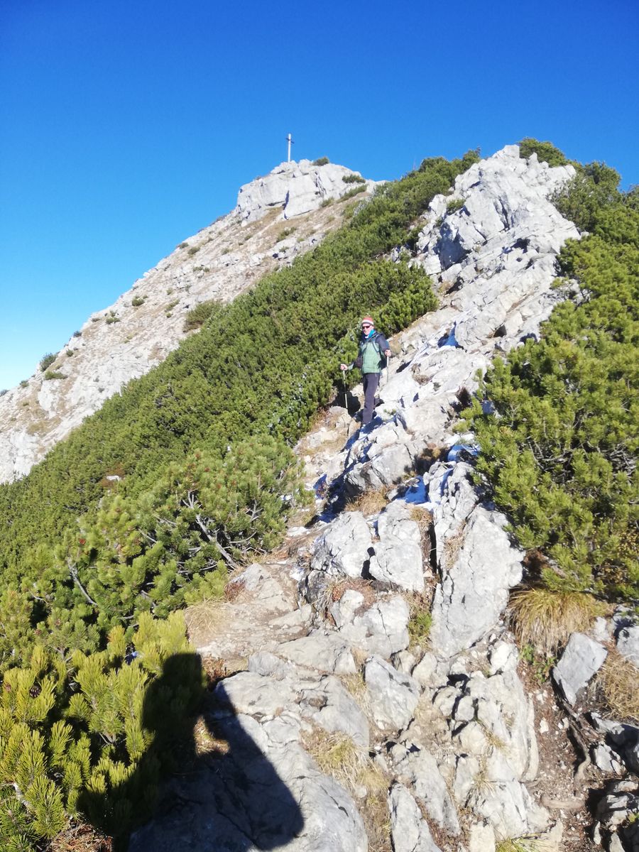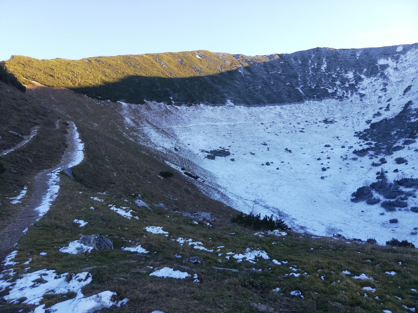 Abstieg über Nordgrat zur Jägerbauernalm und später auf dem - aufgelassenen, aber einfachen - Waldsteig, der durch die Westflanke des Berges direkt zum Spitzingsattel führt. Hier Schnee am Nordgrat und im gesamten Waldstück unterhalb der Alm, ebenfalls nur ein cm, aber halt ein bisschen rutschig.