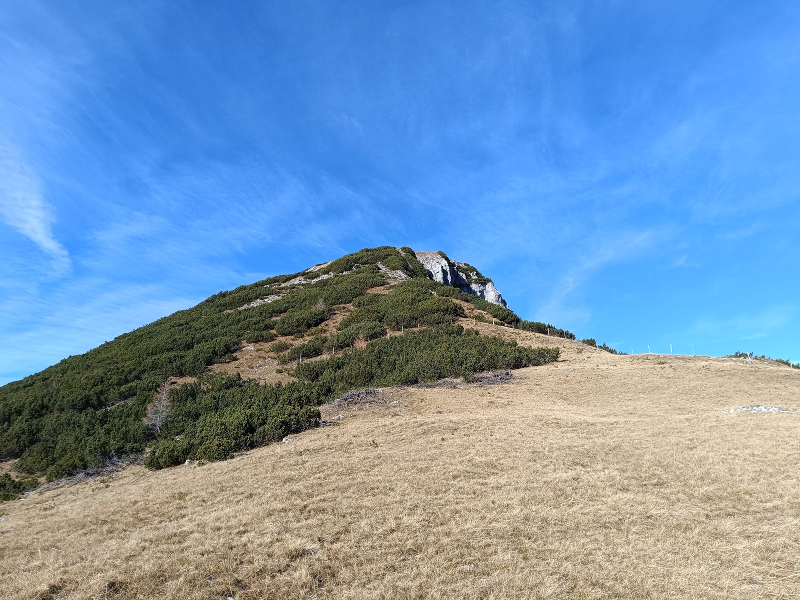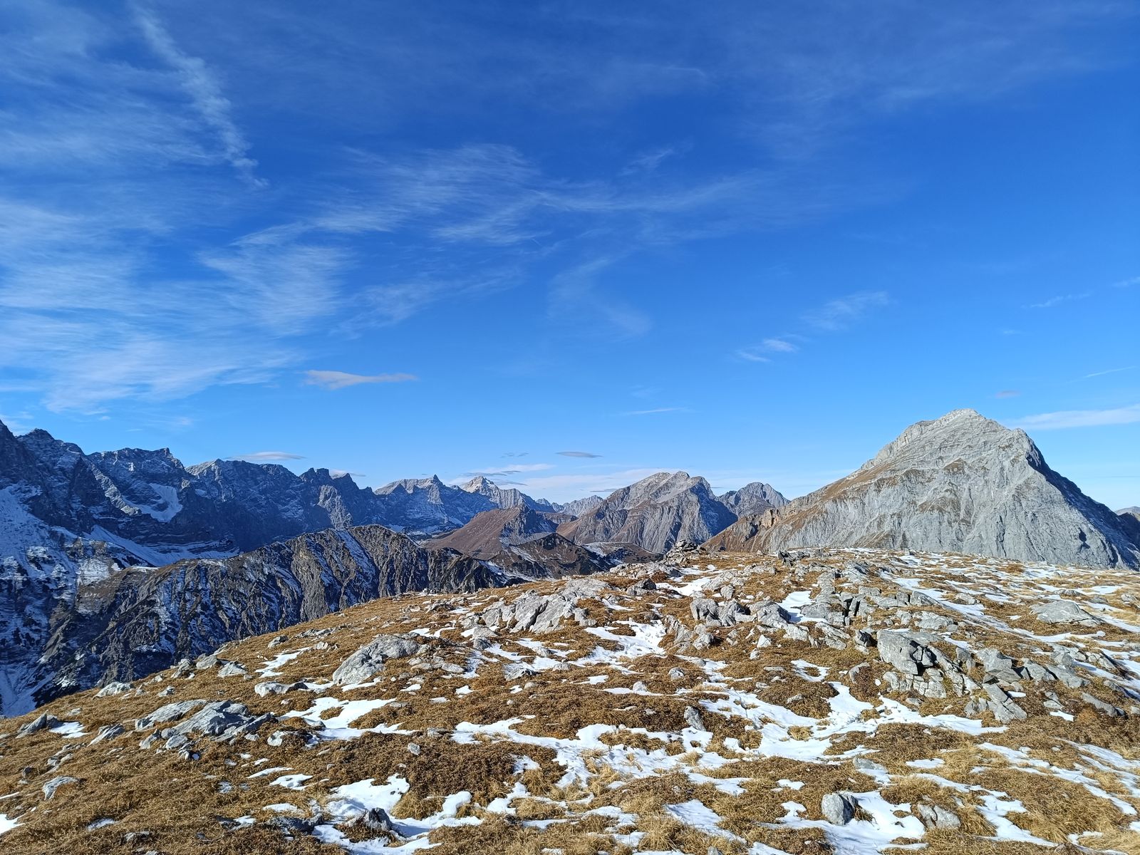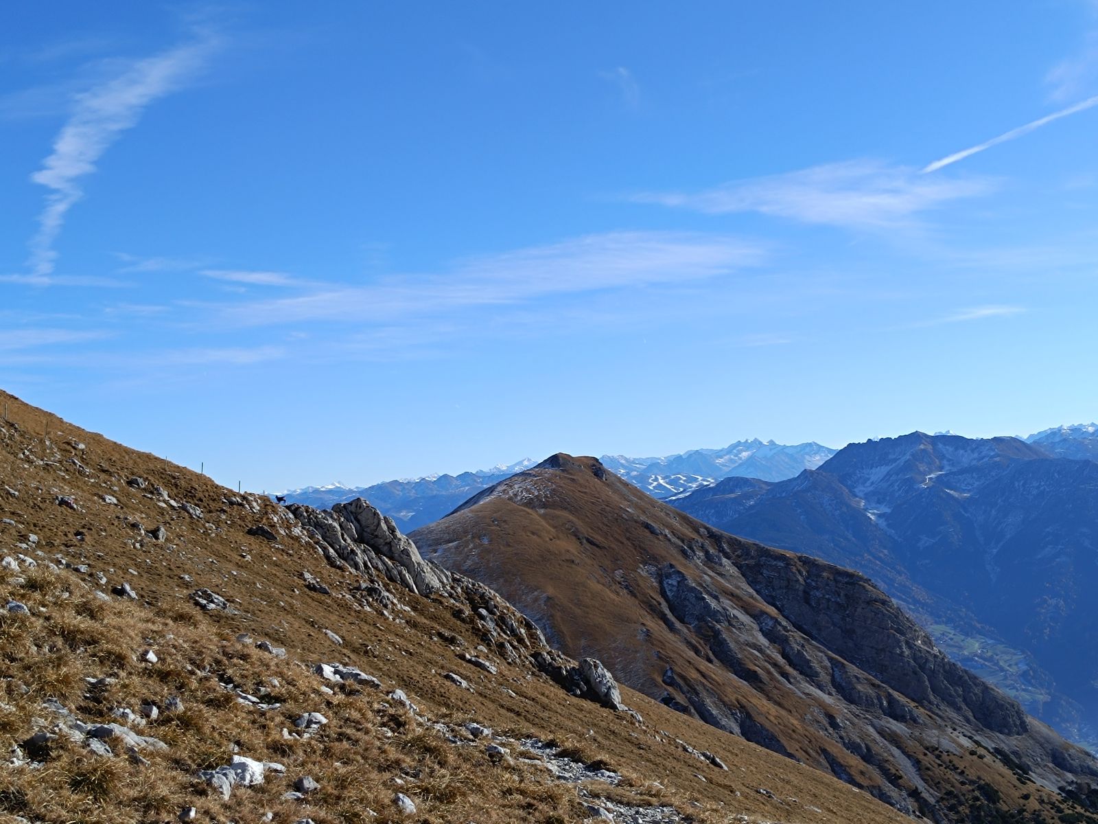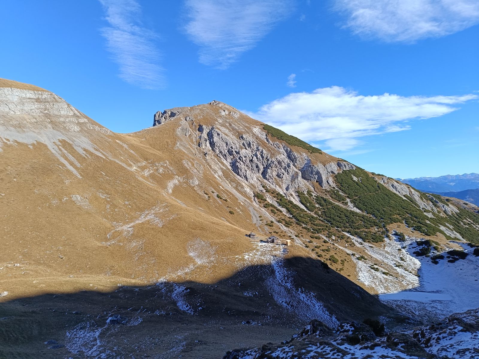 Die Wahl fiel dabei heute auf folgende Rundtour: Vom PP über die Forststraße zur Stallenalm und auf sehr schönem Steig zum Rizuelhals. Hier weglos durch die gut sichtbare Latschengasse zum weitläufigen Gipfelplateau mit toller Aussicht. Ebenfalls weglos in der Nordwest-Flanke hinab zur Naudersalm. Nun in einigem auf und ab auf gutem Steig bis zur Ochsenkaralm, wobei vom Sattel vor der Alm noch weglos der Hahnkamp mitgenommen werden kann. Schließlich via Kloster Georgenberg zum PP zurück. Dank Süd- bis Südost-Exposition eine sehr sonnige Angelegenheit und daher ideal im Herbst. Die Anforderungen gegen dabei trotz der weglosen Abschnitte nicht über T3 hinaus. Bei gutem Wetter ist auch die Orientierung kein Problem. Schnee hat heute ebenfalls keine Rolle gespielt. 1600 Hm, 20km, 7-9 Stunden.