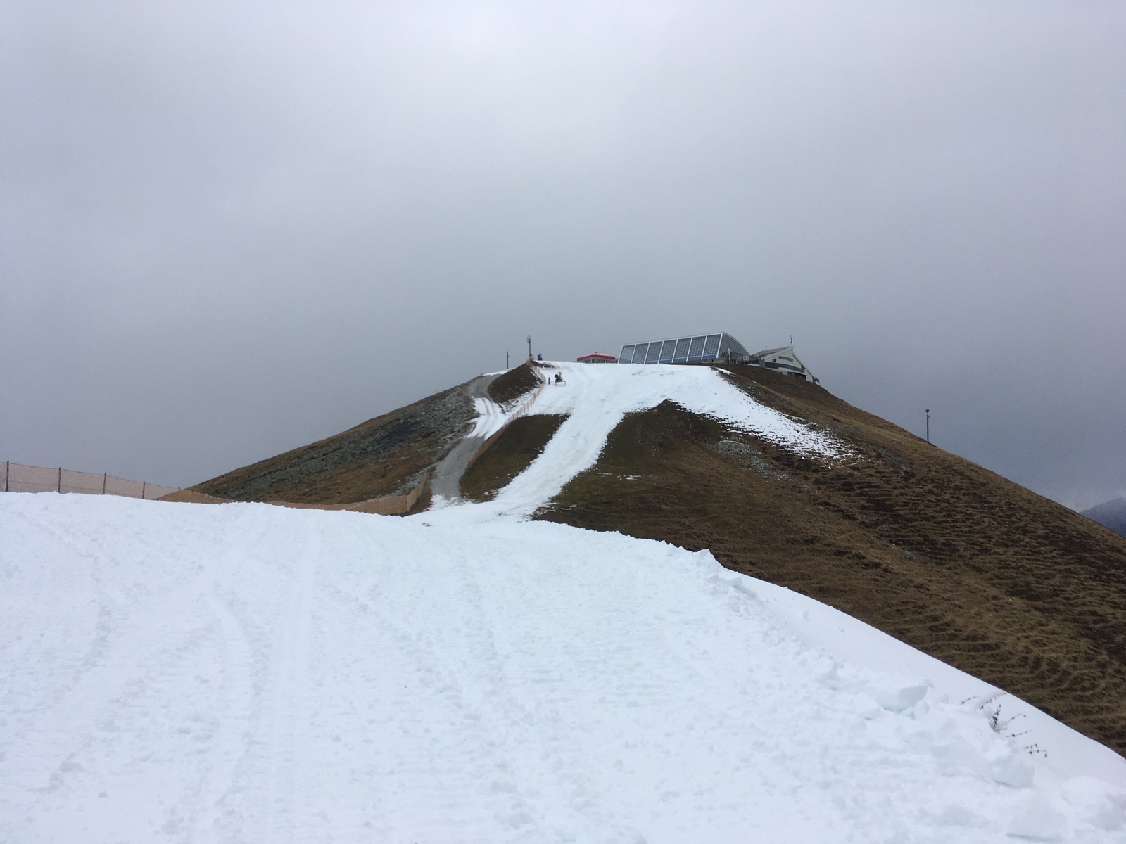Die Skier kann man direkt bei der Talstation anschnallen und muss bis zum (geschlossenen) Gipfelrestaurant auch nicht abschnallen. Allerdings liegt nur wenig Schnee. Meistens gibt es auf der "Damen" eine schmale angewalzte Spur, an mehreren steilen Hängen ist die aber unterbrochen, weil noch zu wenig Schnee liegt. Die Abfahrt ist in der besagten Spur durch die groben Spuren der Pistenraupe eher ruppig, häufig ging es nebendran in einem Kunstschnee-Harsch-Bruchharsch-Eis-Stein-Gemisch. 3x ist es aber wirklich schneearm, hier ging es auch mit alten (dringend zu empfehlenden) Tourenski nur gerade so herunter.