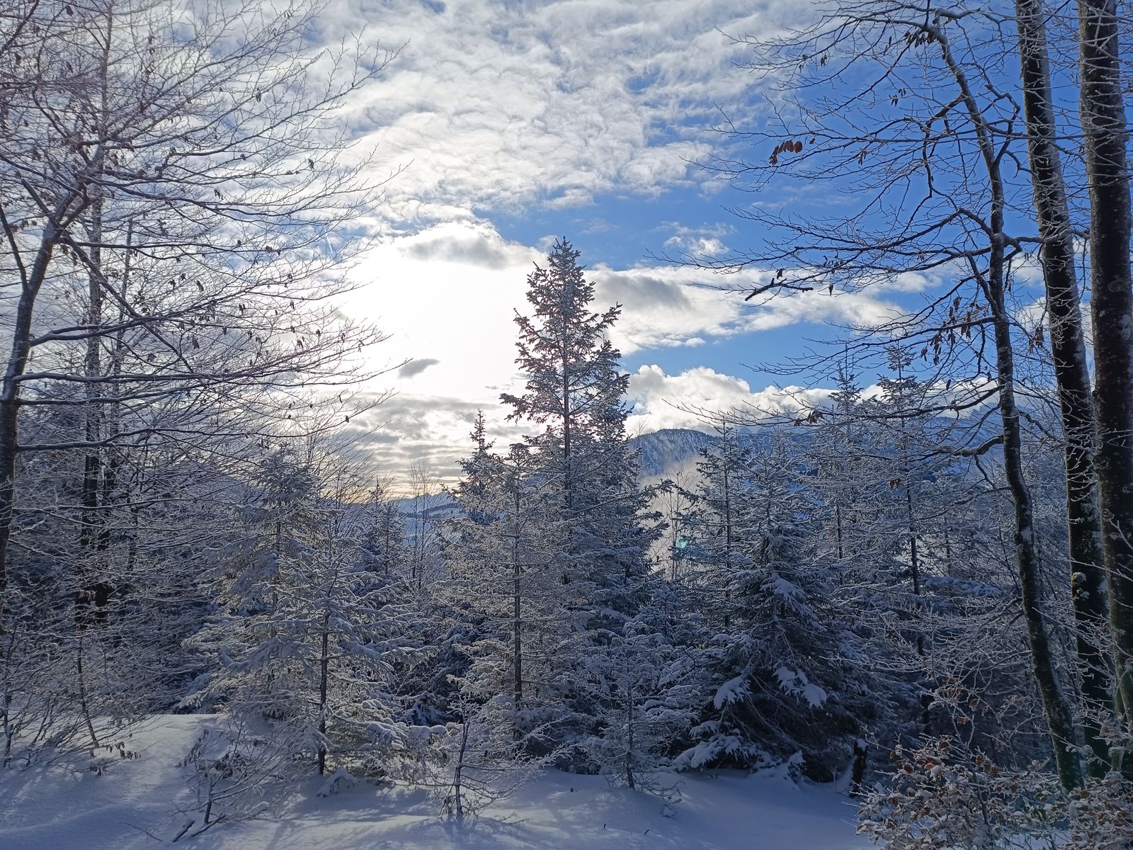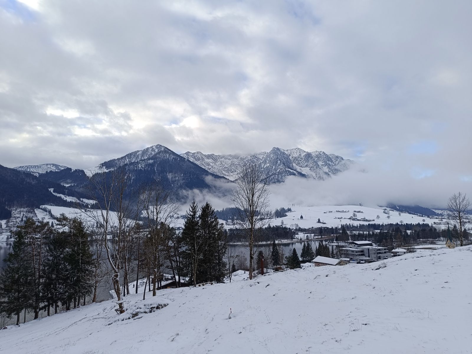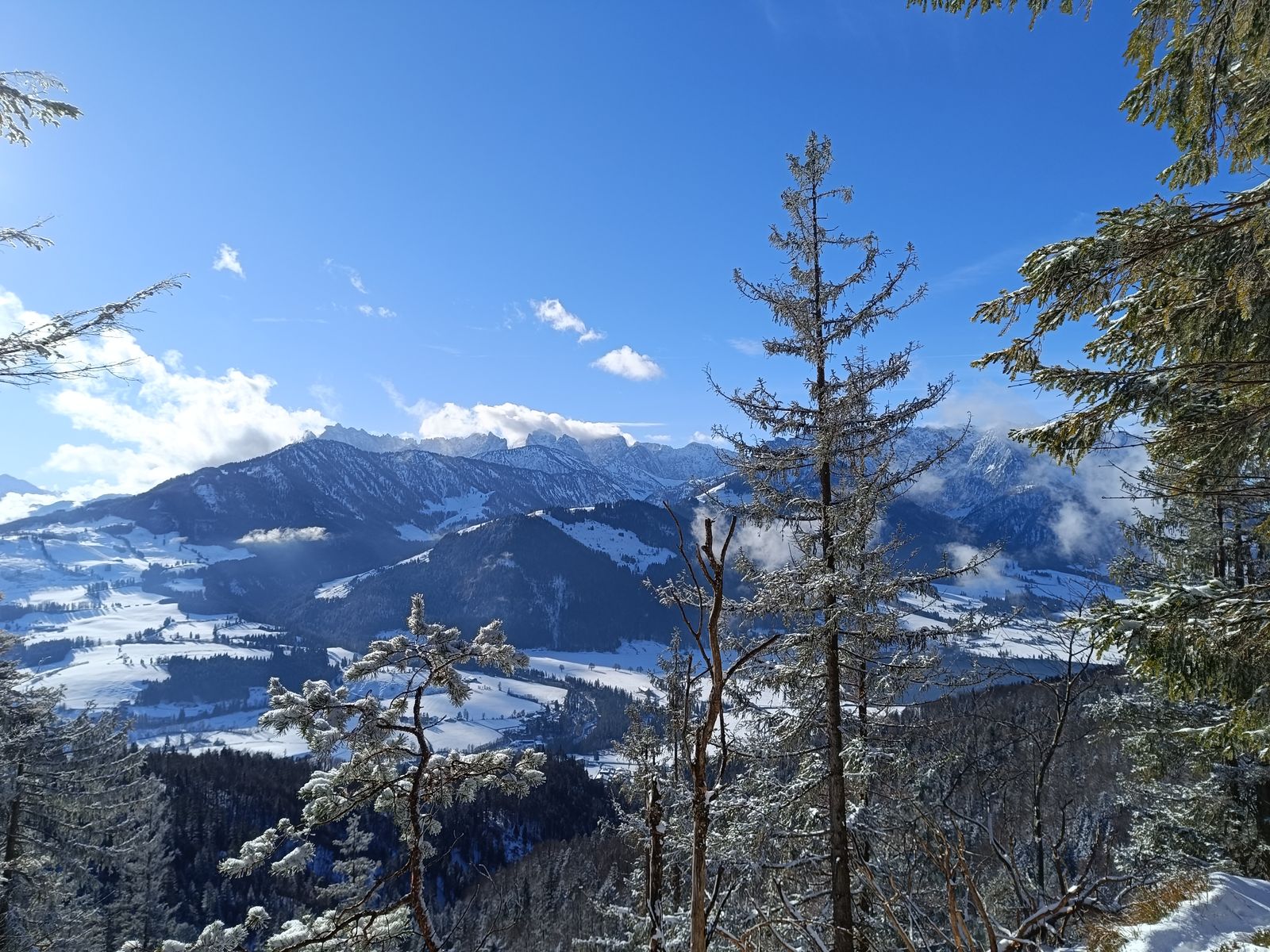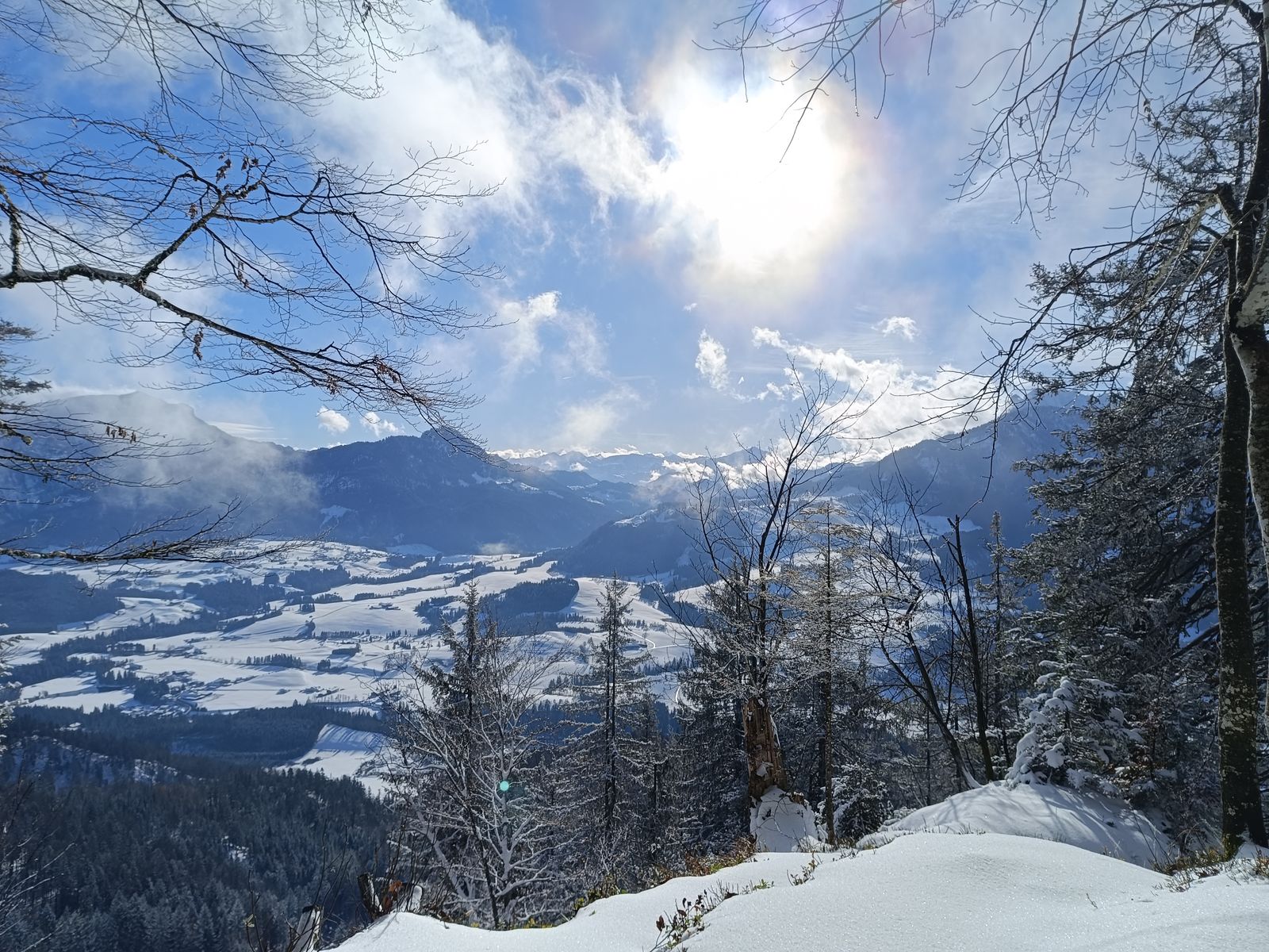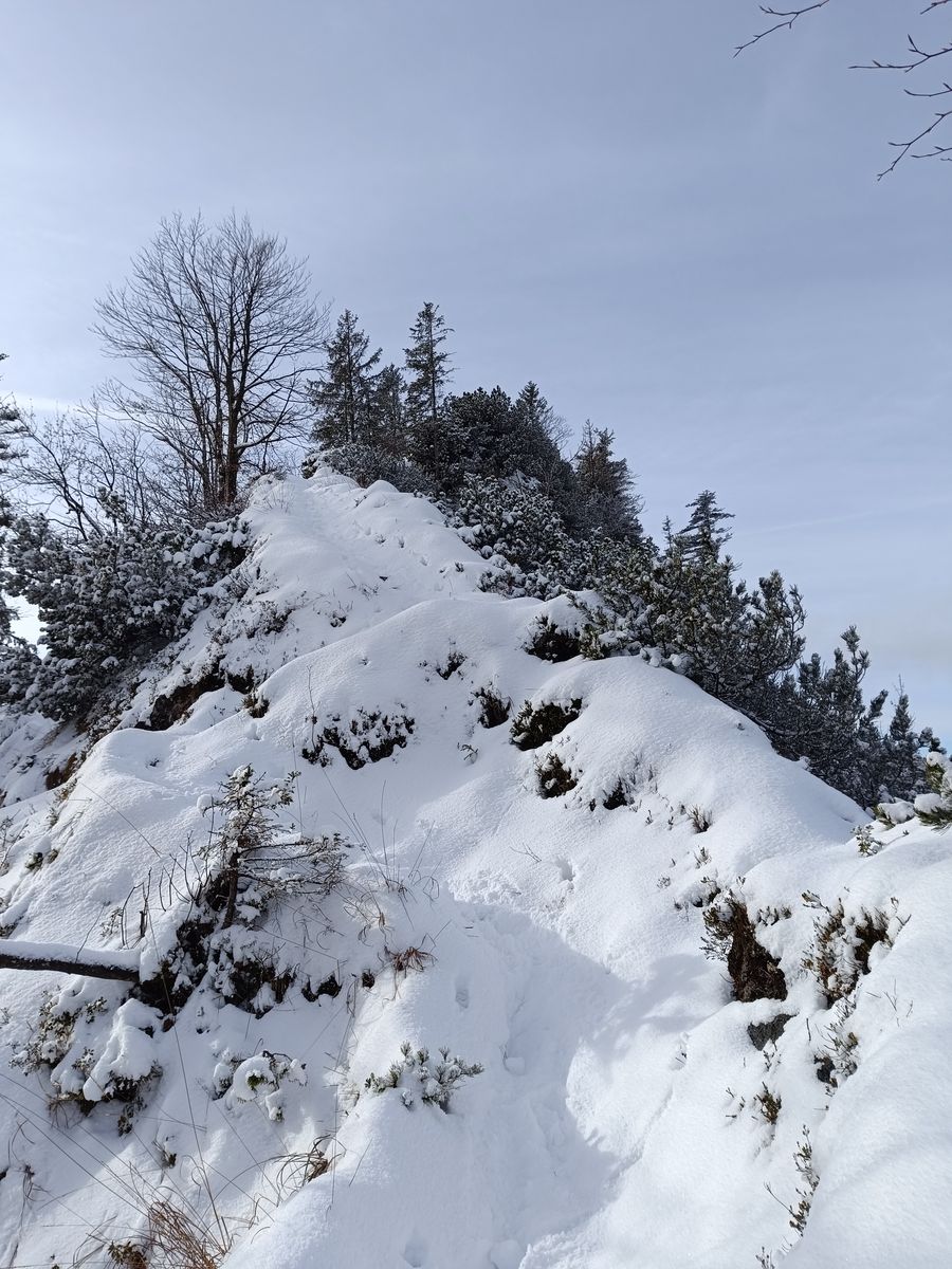 Also hab ich die schöne Rundtour auf die Harauer Spitze am Walchsee gemacht, wo ich dann auch ganz alleine unterwegs sein durfte. Hoch bin ich über den reizvollen Waldsteig und runter via Ottenalm (geschlossen) auf der Forststraße. Diese ist tief geräumt worden - also noch nichts mit Rodeln hier. Es lagen 5-15 cm Schnee. Von der Ausrüstung her sind Gamaschen sinnvoll; Grödel hab ich nicht gebraucht. Für Schneeschuhe liegt natürlich noch zu wenig Schnee.