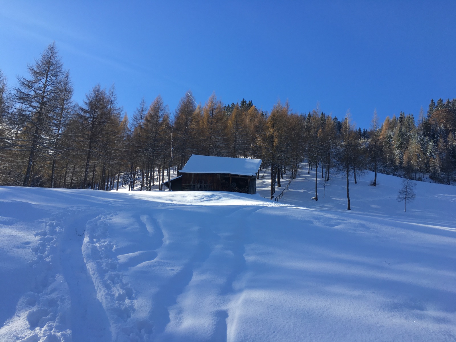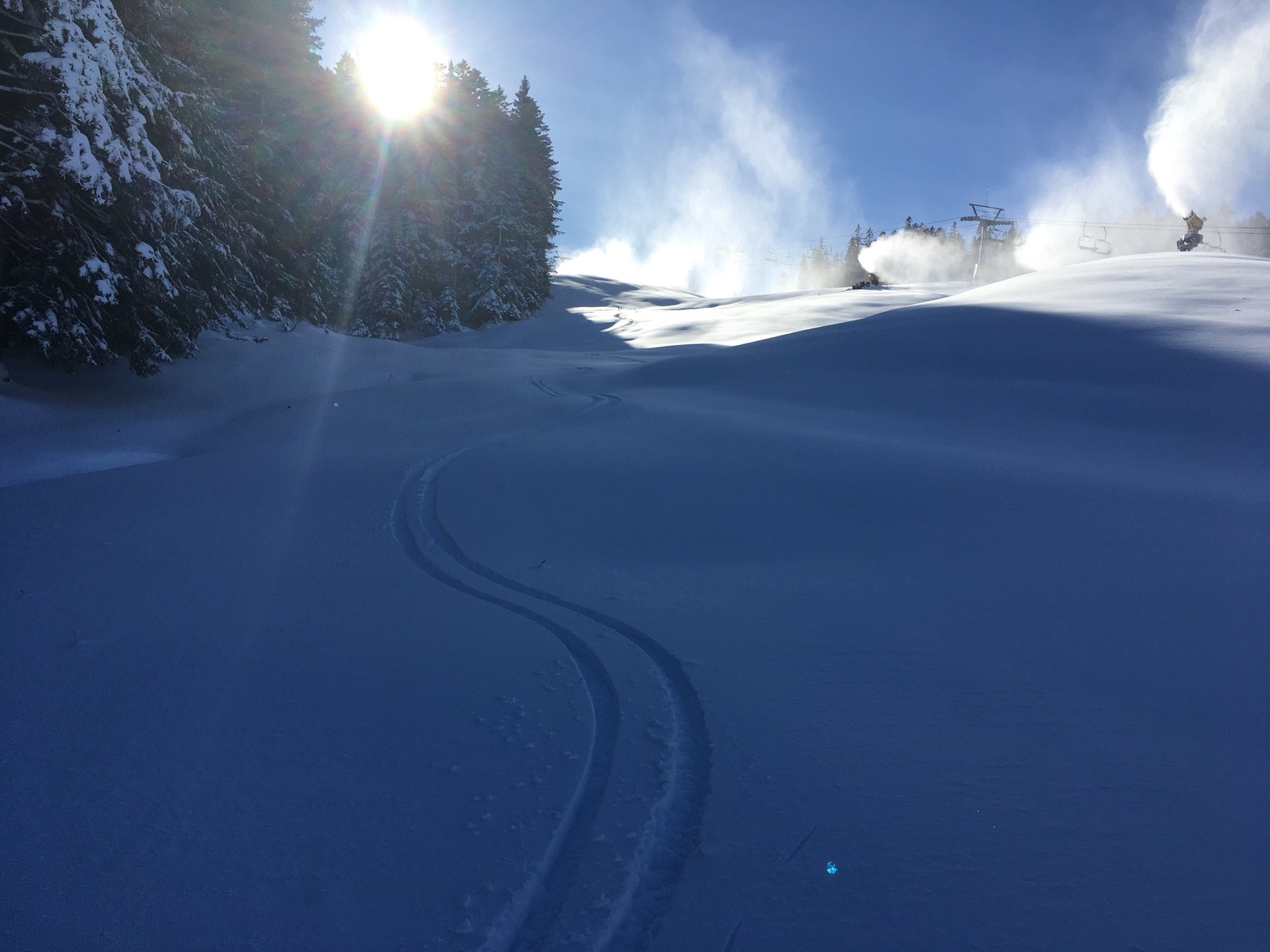 Am Pistenrand abseits der mit Maschinenschnee eingedeckten Stellen gute Abfahrt: