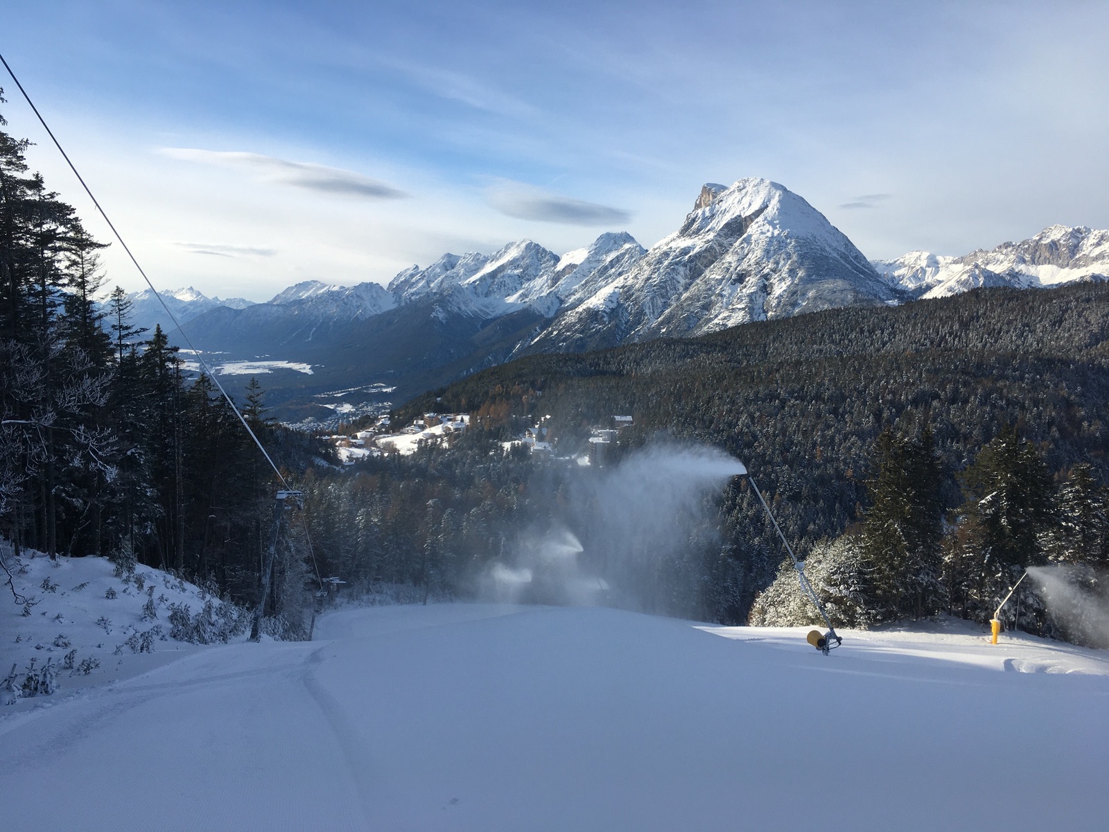 Überraschend gut! Eigentlich hatte ich ja eher bescheide Verhältnisse in Seefeld erwartet, nachdem es dort laut LWD Tirol nicht sehr viel geschneit hatte. Tatsächlich ist die Schneelage aber (noch?) deutlich besser als erwartet und es konnten alle (leider eher kurzen) Pisten aufgestiegen und wieder abgefahren werden, ohne dass es zu nennenswertem Stein- oder Grundkontakt kommt. Ein bisschen beeinträchtigt ist die Tour dadurch, dass im Skigebiet die Beschneiung auf Hochtouren läuft. Am besten hält man sich am Pistenrand - da wo die Schneekanonen / - lanzen nicht hinkommen, lag richtig guter Pulver. Bei der letzten Abfahrt war dann sogar schon mal angewalzt worden, entsprechend sehr gute Abfahrt, auch da, wo Maschinenschnee lag.