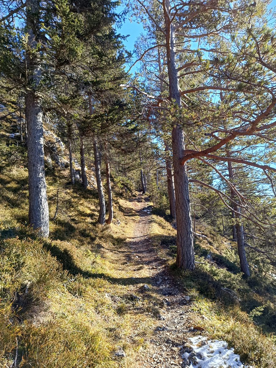 Schneelage: Bis Hundsalmjoch schneefrei, aber auf der gesamten Überschreitung bis Höhlenstein fast durchgehend wenige Zentimeter. Aufgrund der pulvrigen Konsistenz aber keine Grödel nötig - rutschig ist es teilweise aber schon.