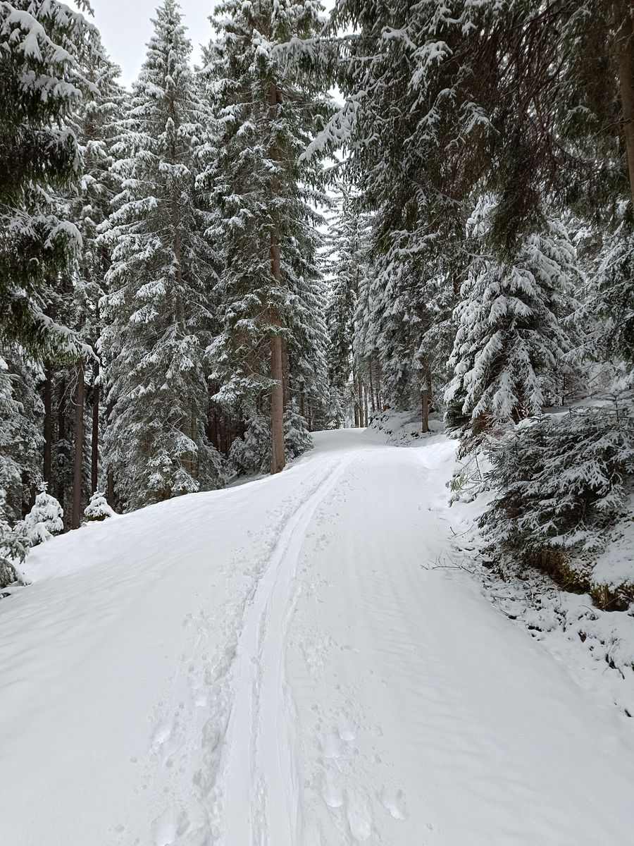 1-4: Auf der Forststraße und im Gelände genug Schnee für den Aufstieg.