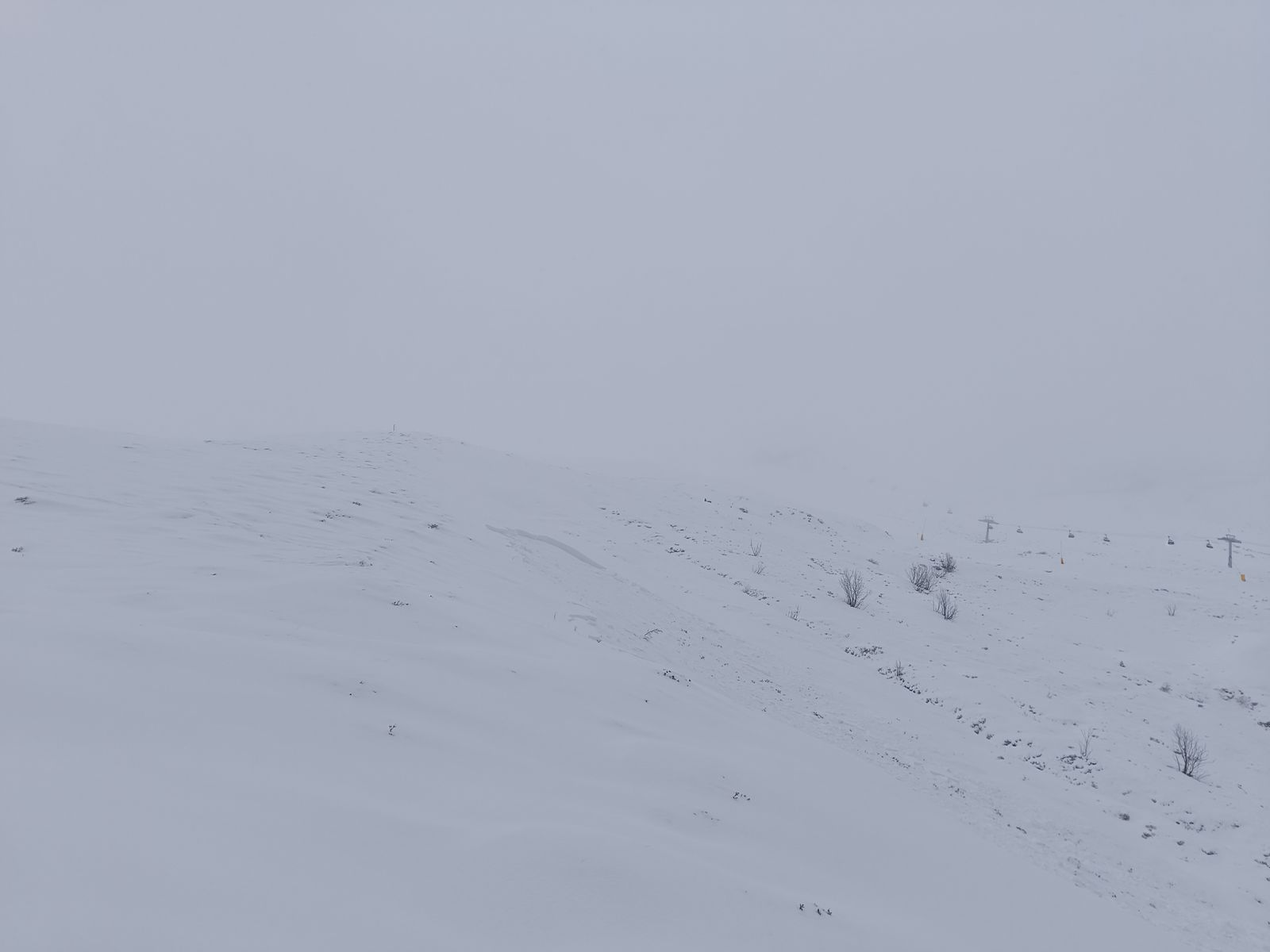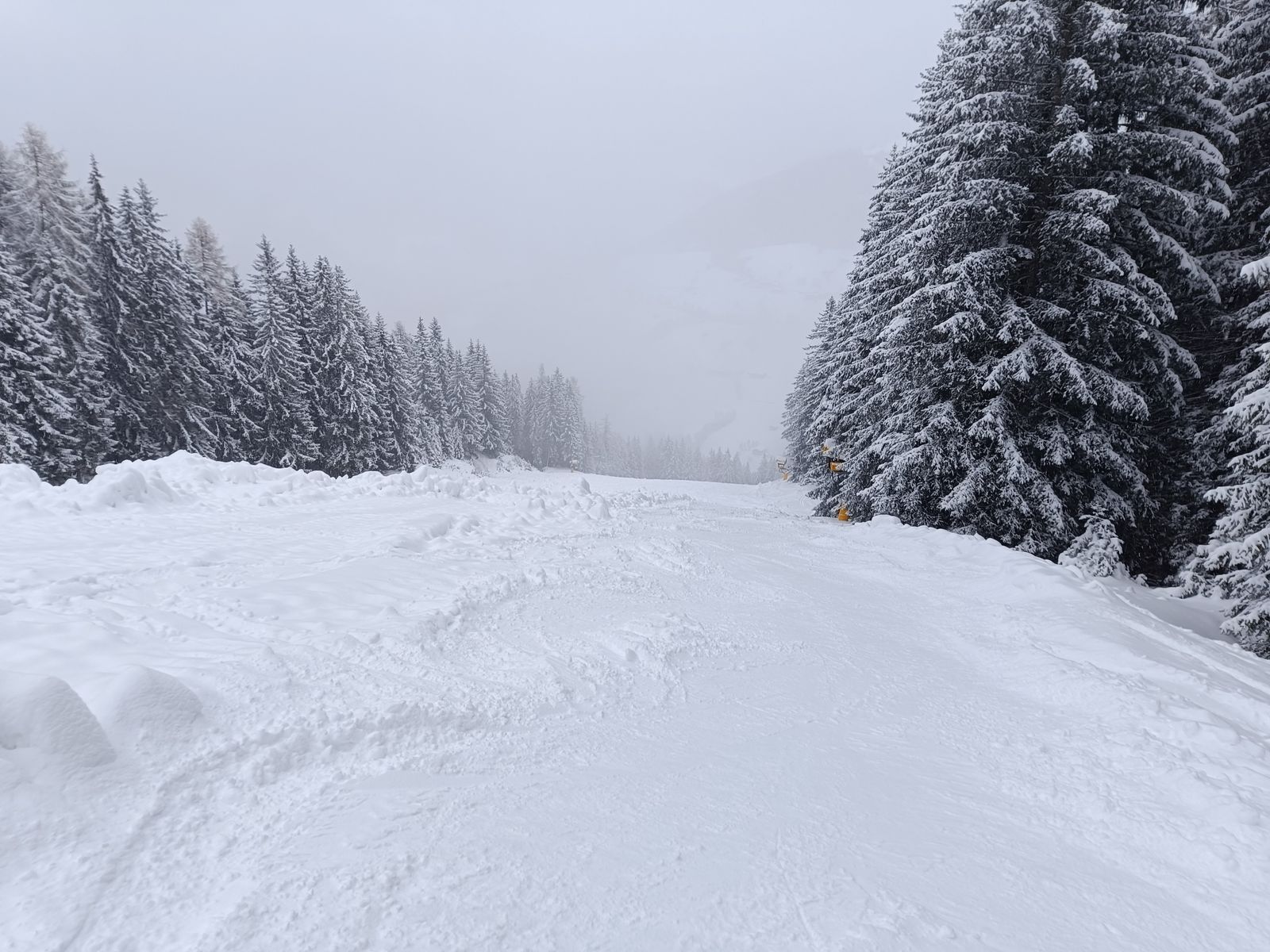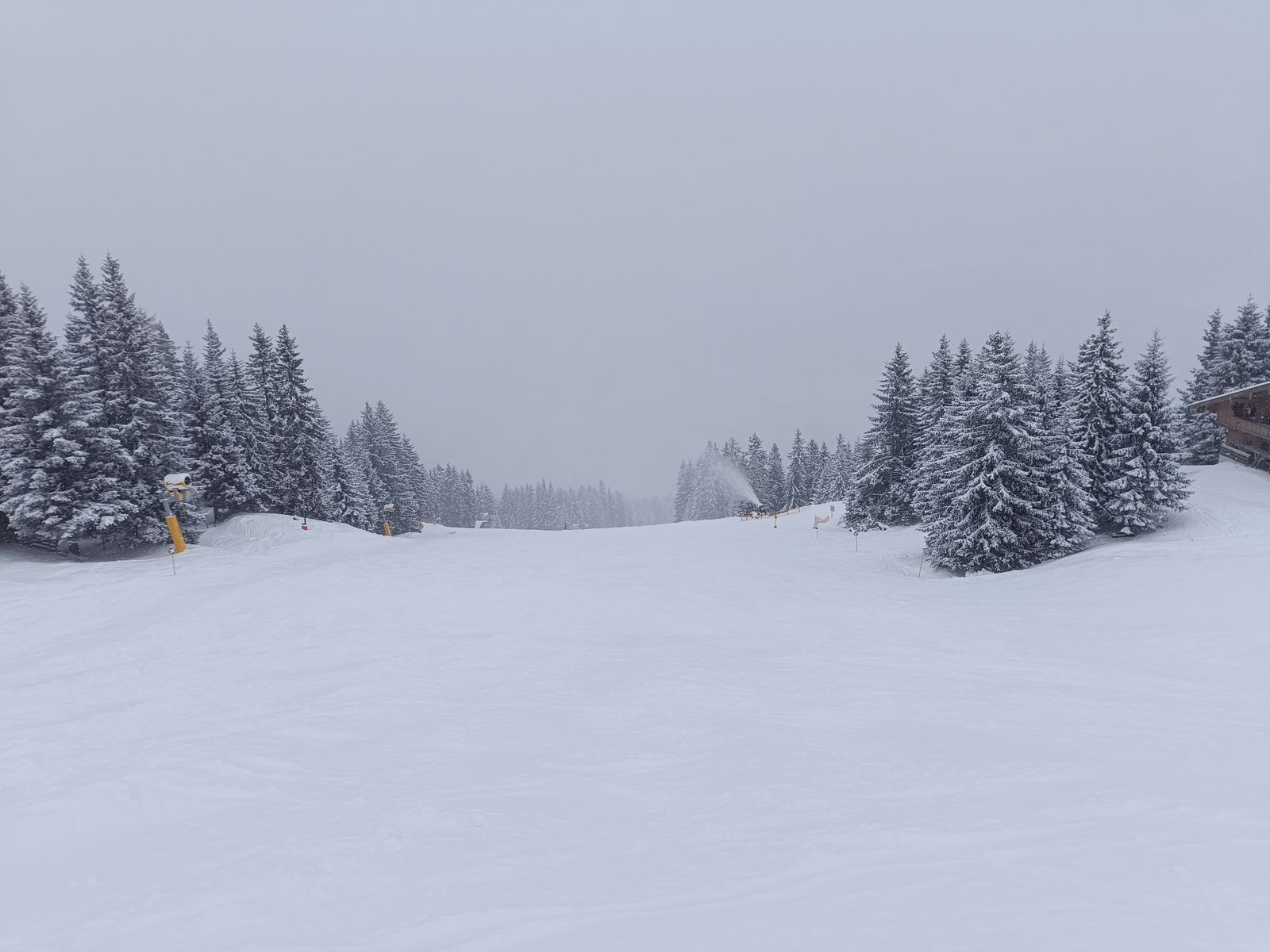 Nach einer Zwischenabfahrt zur Talstation der Hornbahn, bin ich hoch zur Bergstation der Pöglbahn, um von dort über die Pisten ins Tal zu kommen. Zu meiner Überraschung (hätte ich vorher mal schauen sollen...) war der untere Teil der Pöglabfahrt aber noch nicht geöffnet. Es war bereits beschneit, und umgeackert, aber noch nicht planiert. Zwar kein Genuss, aber dank einer ausgefahrenen Schneise gut machbar.