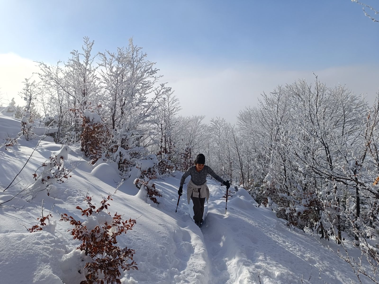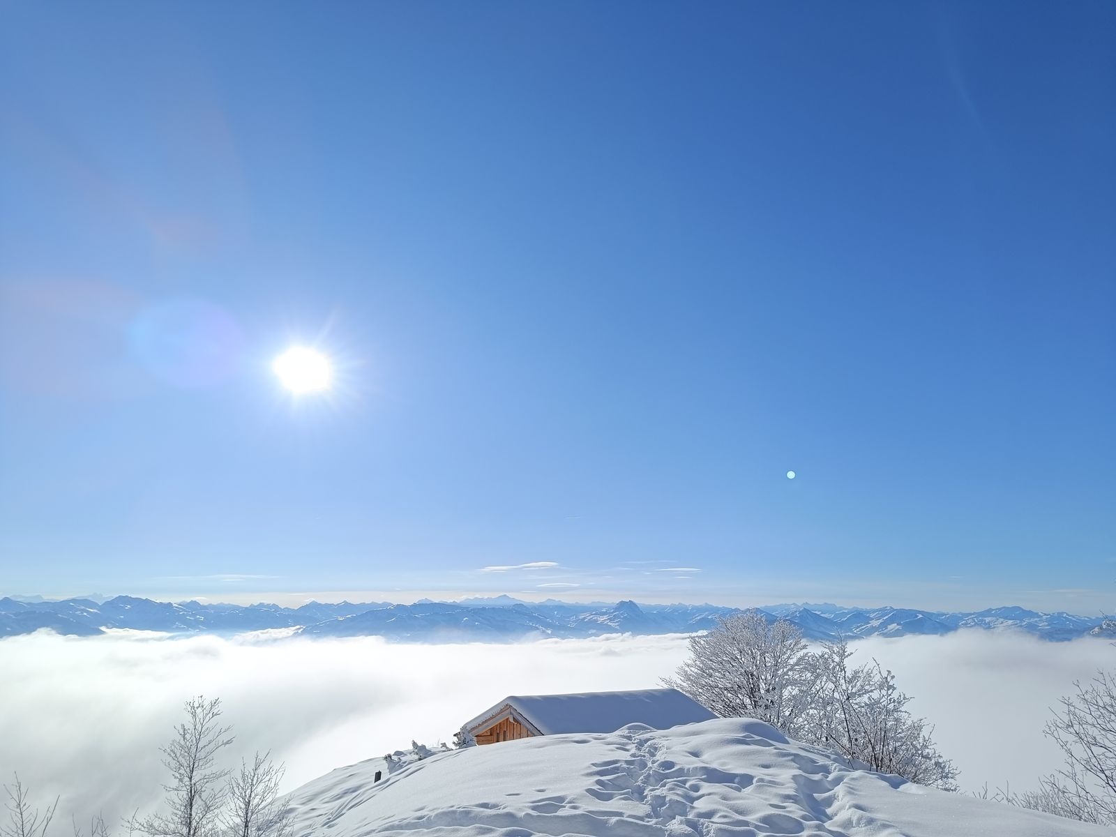 Wir hatten heute das große Glück, dass sich die Obergrenze des Hochnebels knapp unterhalb der Ackerlhütte befand und wir so die mitgebrachten Feinerles (warme Suppe, Punsch, Gebäck) in der Sonne genießen konnten.