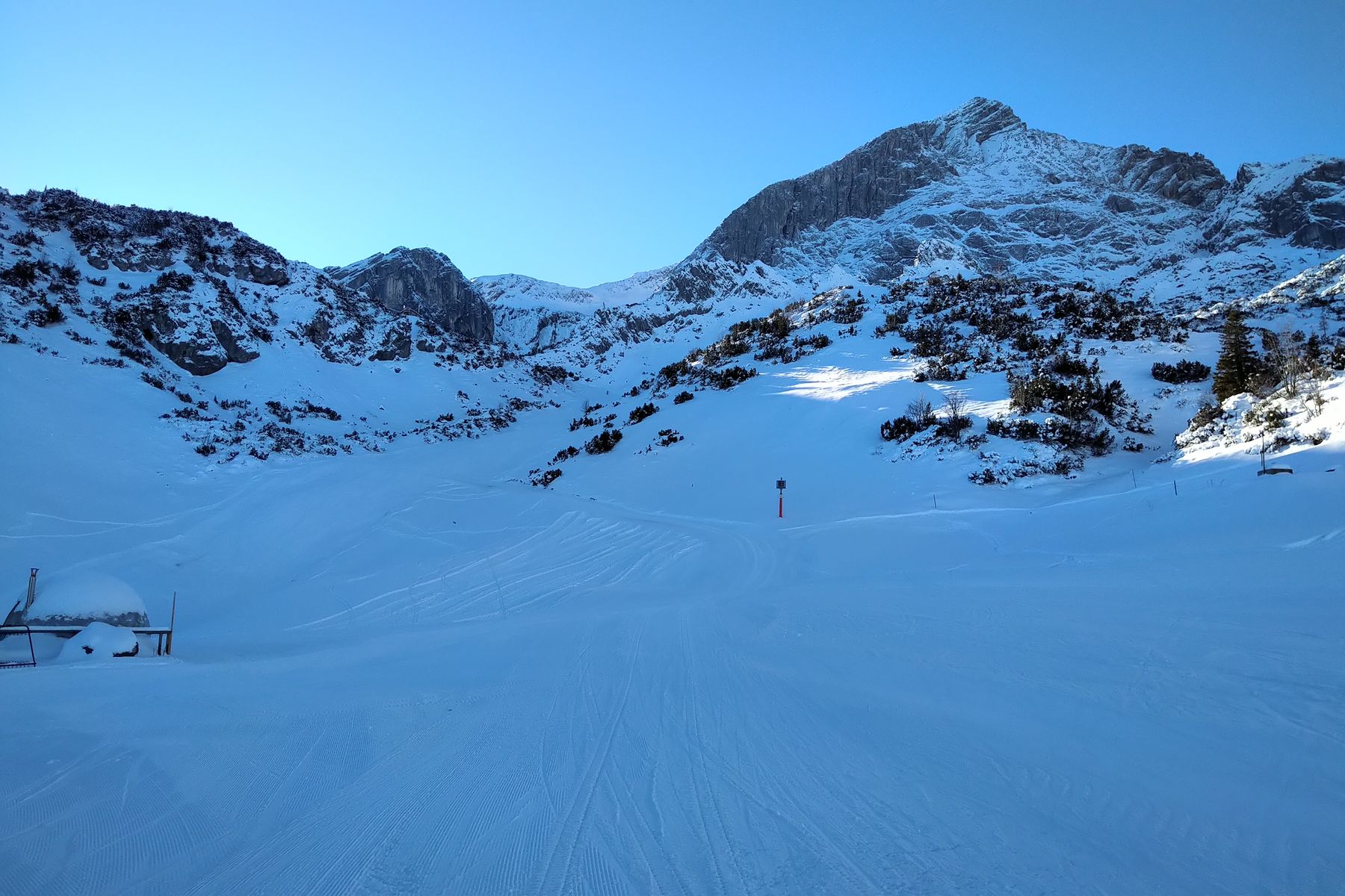 Bei der Hochalm gute Pistenverhältnisse, daneben muss man schon genau hinschauen bzgl. versteckten Steinen: