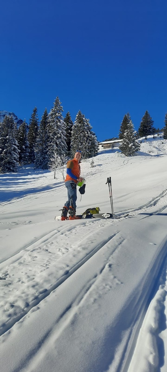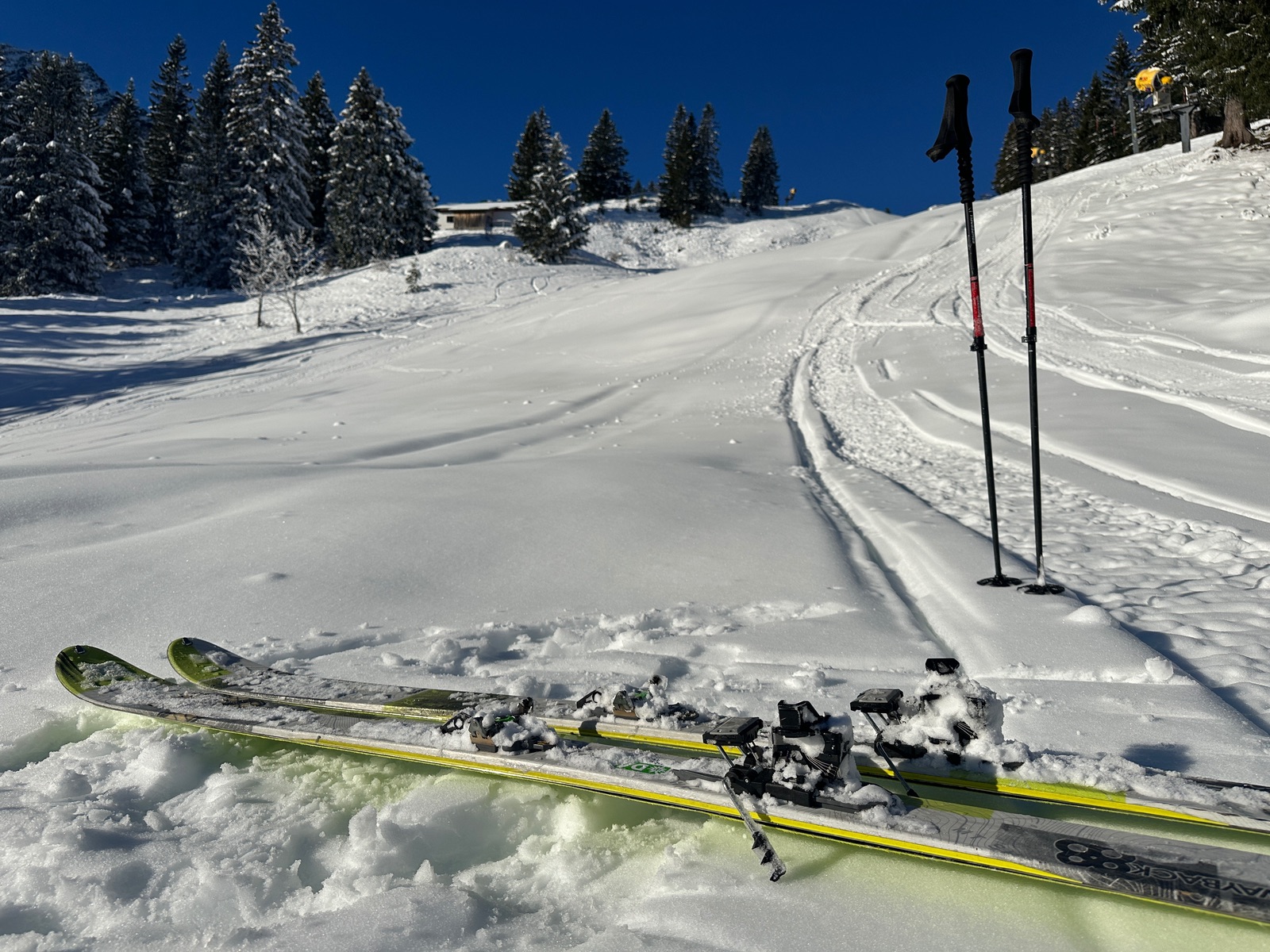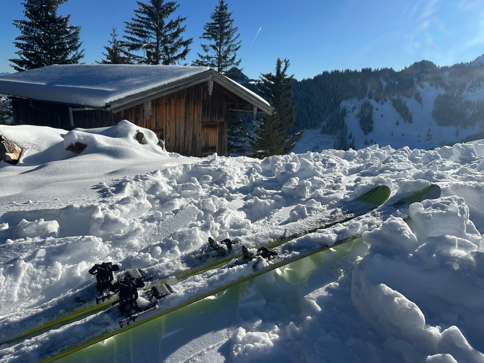 Wir fuhren bis fast runter, zur Sonnen-Schatten-Grenze, fellten wieder an und stiegen auf bis zur Bergwachthütte. Dann die Abfahrt zurück, teils mit schönem Pulver.