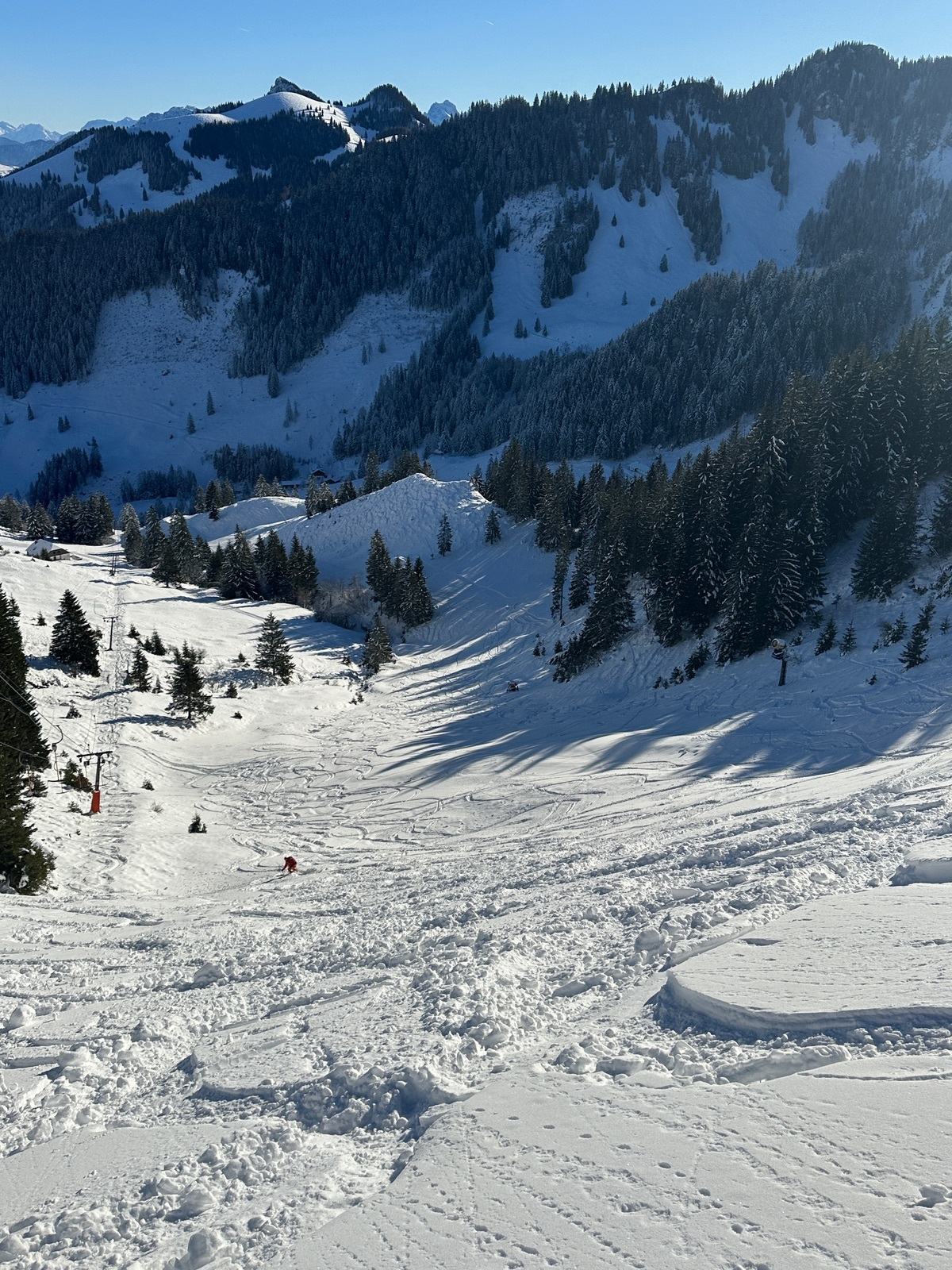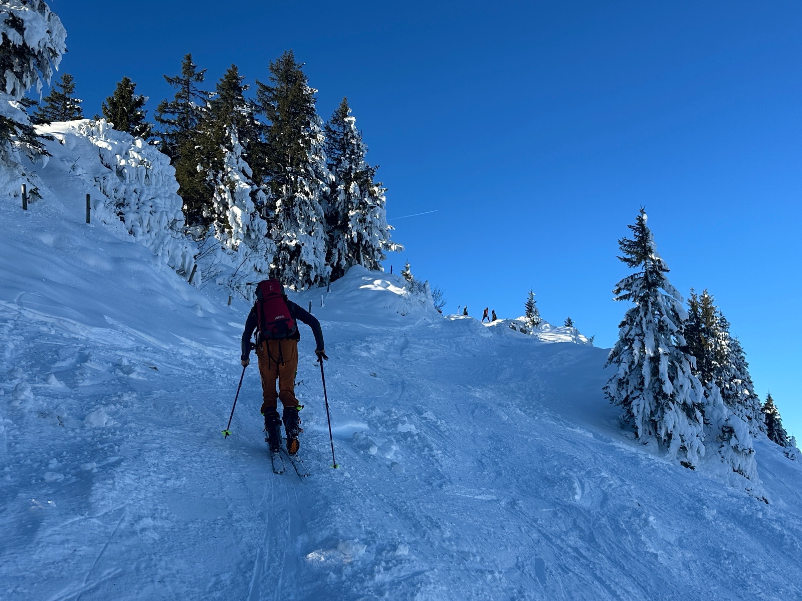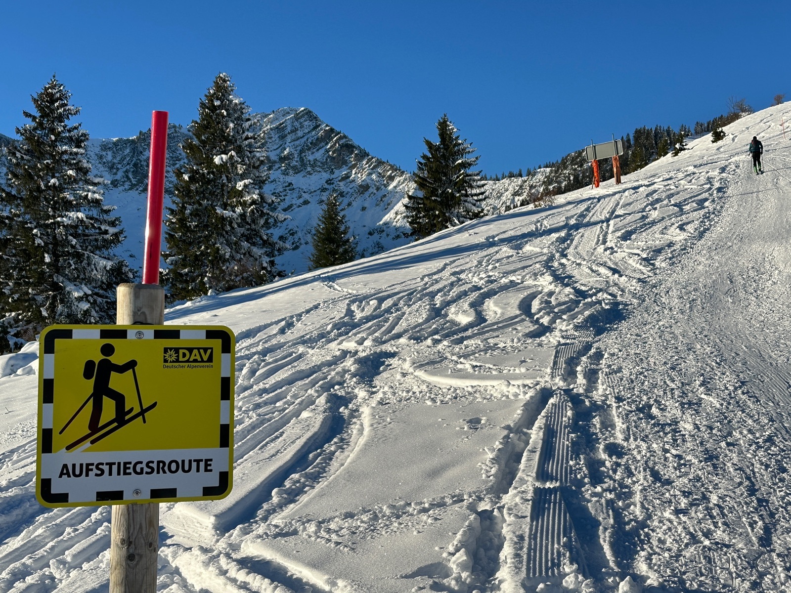 Wir fuhren bis fast runter, zur Sonnen-Schatten-Grenze, fellten wieder an und stiegen auf bis zur Bergwachthütte. Dann die Abfahrt zurück, teils mit schönem Pulver.