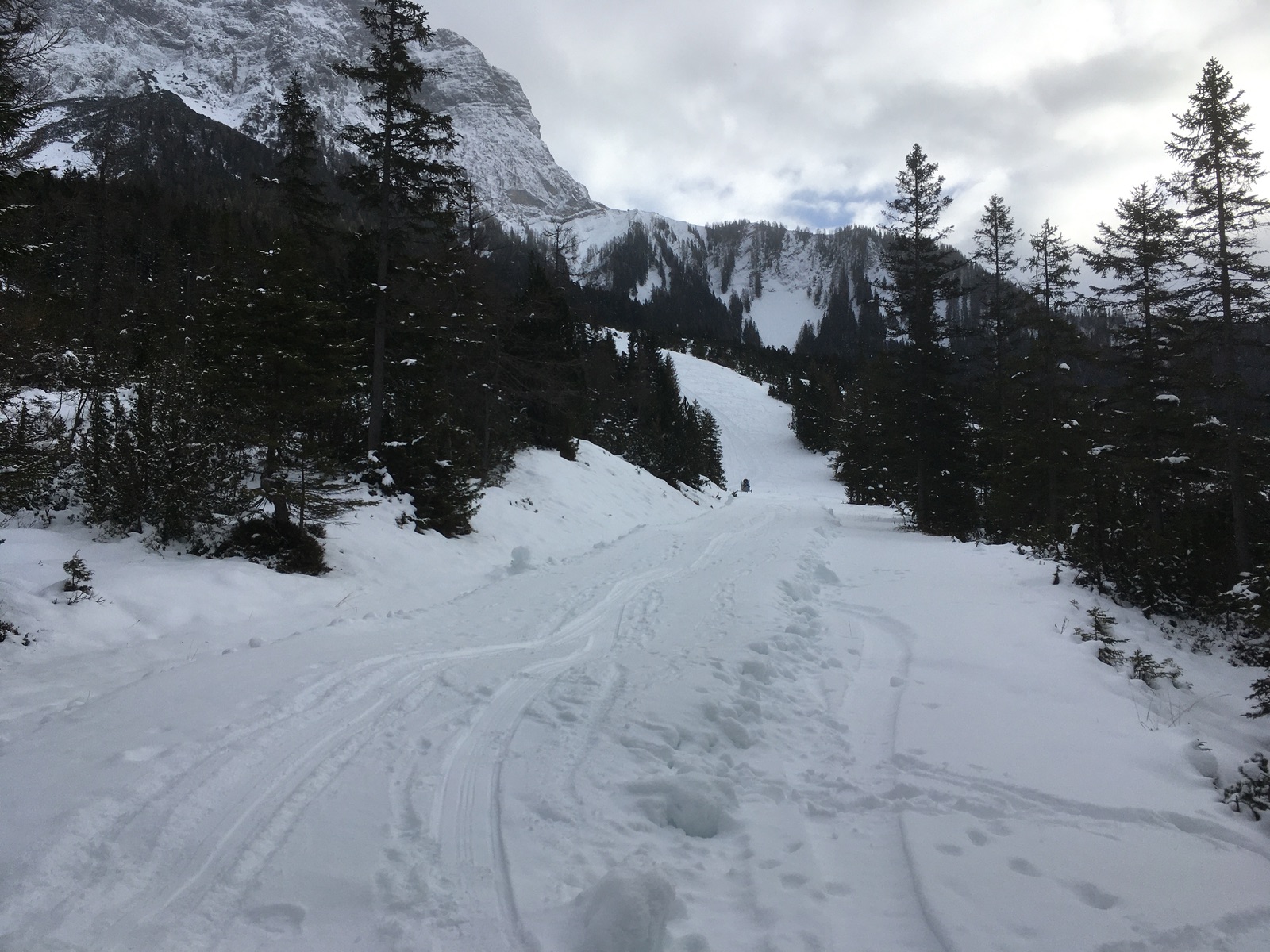 Heute auf Abstecher ins Gamskar oberhalb Ehrwald, eigentlich eine bekannte Firntour. Von der Tiroler Zugspitzbahn-Talstation über die nur mäßig eingeschneite Skiabfahrt hoch zum Beginn des Kares und dann die Schotterreiße hoch, so weit es irgendwie sinnvoll erschien (bis auf gut 1.700 m bei der "Drehung" des Kares). Das Kar selber bot zwar wunderbaren Pulverschnee, ist aber mangels flächendecker Unterlage leider steinig. Und da ich eigentlich etwas ganz anderes geplant hatte, waren die guten Skier im Einsatz, nicht die Steinski. Also mit Steinski hätte man sicherlich Spaß haben können, so versuchte ich nur, möglichst vorsichtig hinunterzurutschen, konnte Felskontakt aber leider nicht ganz vermeiden. Als dann schon das "rettende" Pistengebiet erreicht war, gab es aber zu meiner Überraschung auf der Gamskar-Piste die größten Belagschäden. Auch hier liegt wunderbarer Pulver, aber leider gibt es auch einige Steine auf der Piste. Die Auflösung dazu habe ich dann von einem einheimischen Tourengeher erfahren: Im August hat eine Mure den Gamskar-Schlepplift im oberen Teil zerstört und auch die Piste teilweise verschüttet (ausführlicher Bericht im Internet im "Alpinforum"). Da der Lift heuer nicht mehr in Betrieb geht (wer weiß, ob jemals wieder bzw. ein Neubau kommt), wurde auch nicht beschneit und planiert. Kein Wunder, dass ich da auf Steine gekommen bin ...