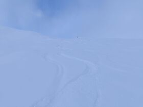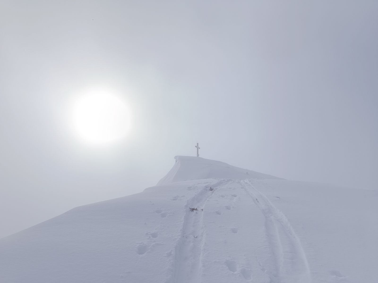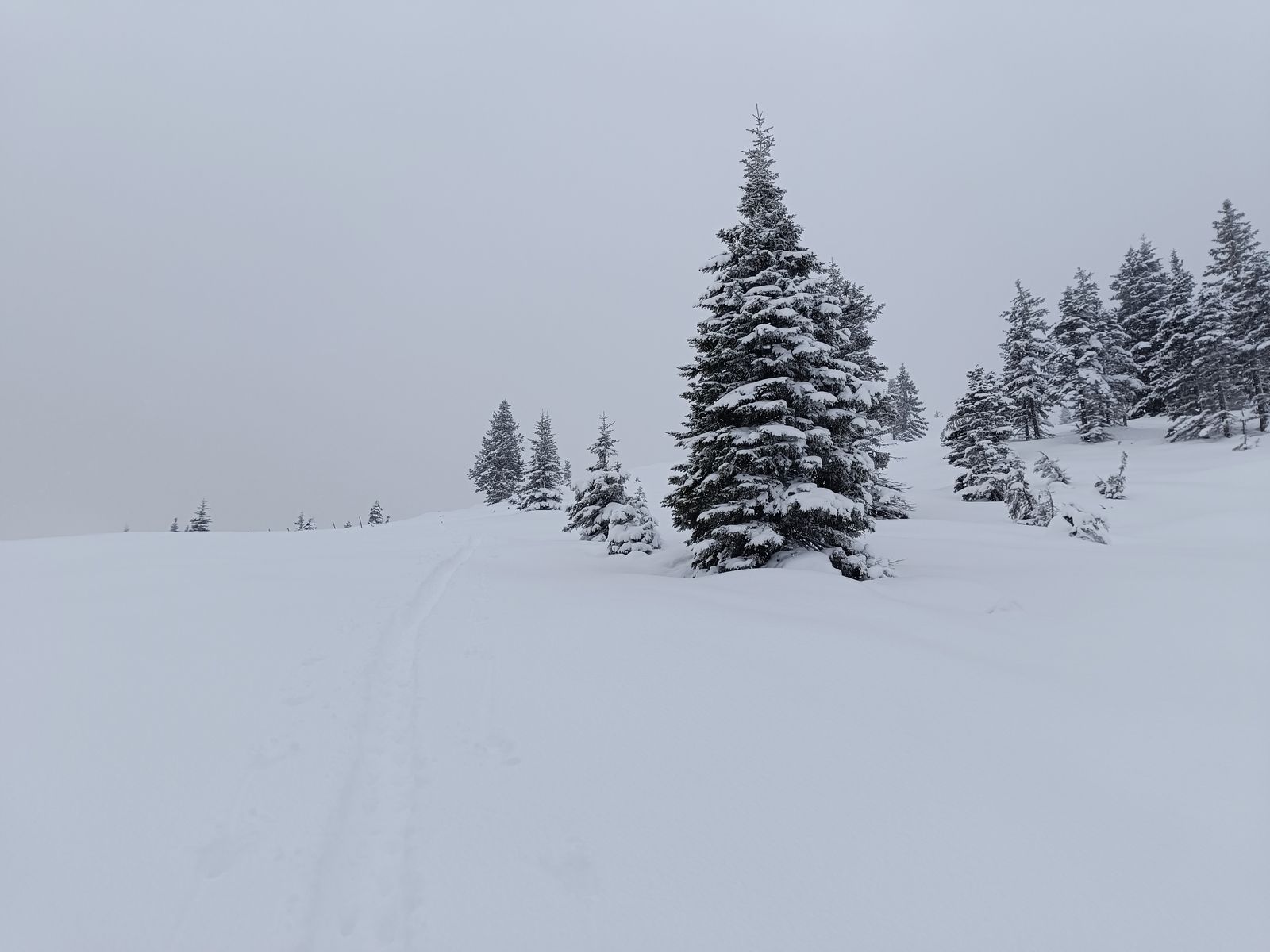 Verhältnisse: Gut und damit deutlich besser als erwartet. Im Mittel hat es so 15cm Neuschnee gegeben und die Ostabfahrt hat auch eine (harschige) Unterlage. Die Schneehöhe dürfte insgesamt bei 30-40cm liegen, am meisten hat es ostseitig. Allerdings wird der sehr fluffige Pulver bei Erwärmung schnell zusammengehen. Ich hab heute die Steinski dabei gehabt, was auch sehr sinnvoll war, obwohl ich letztlich gut durchgekommen bin.