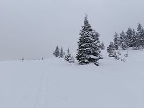 Ich bin vom PP auf der nicht geräumten Fahrstraße zum Loassattel und von dort zum Gamsstein. Da der Anstiegsweg skifahrerisch mehr als zweitrangig ist, bin ich auf der Ostseite Richtung Hochfügen bis zu den Almen auf etwa 1700 Meter abgefahren und dann gleich nochmal hoch. Nach einer zweiten Abfahrt bin ich über die Forststraße, die von Hochfügen zum Loassattel führt aufgestiegen und anschließend zum Auto zurück. Gespurt war auch schon - danke dem/der Unbekannten! Zu sehen habe ich ihn/sie nicht bekommen, weil es sehr nebelig war und erst aufgerissen hat, als ich das zweite Mal am Gipfel war.