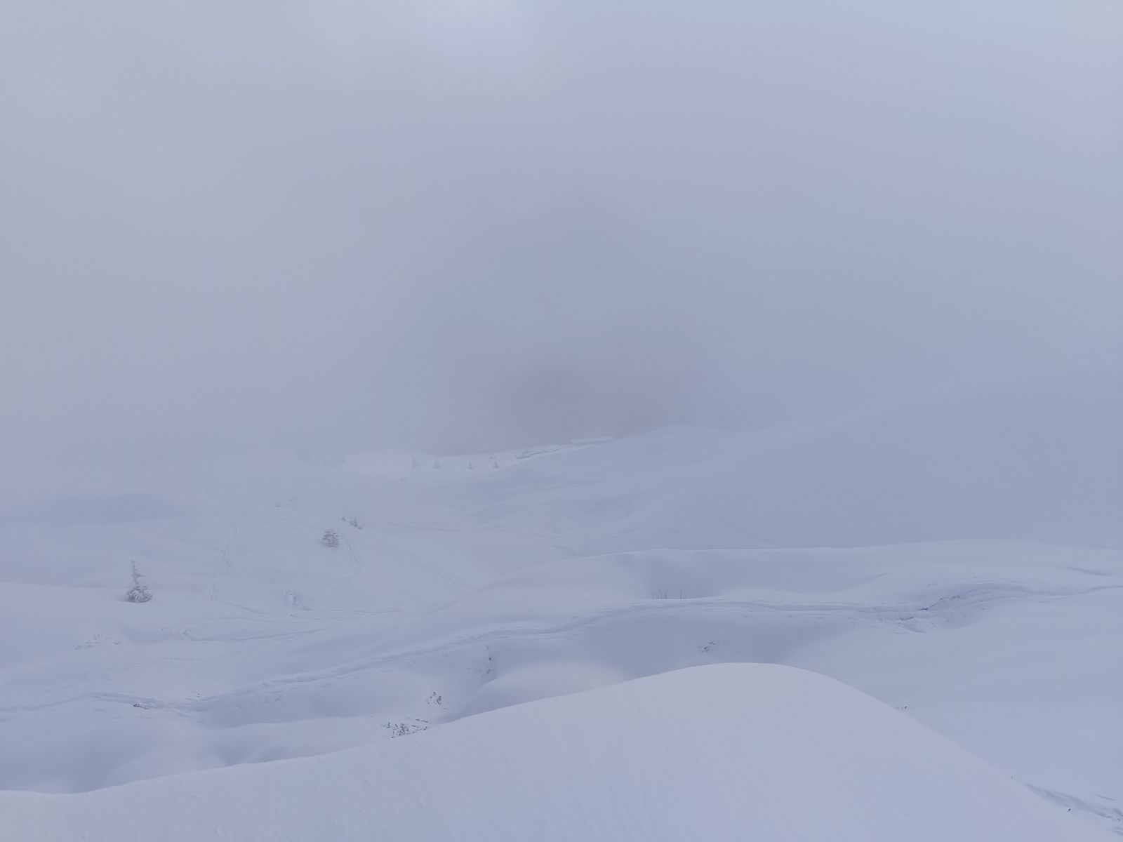 Bei schlechter Sicht wie heute muss man in der Abfahrt gut aufpassen, bei dem stark kupierten Gelände nicht blöd in ein Loch zu plumpsen.