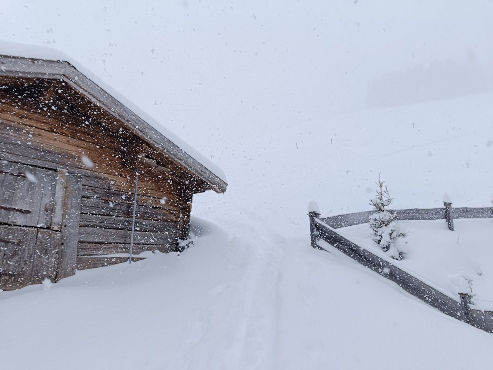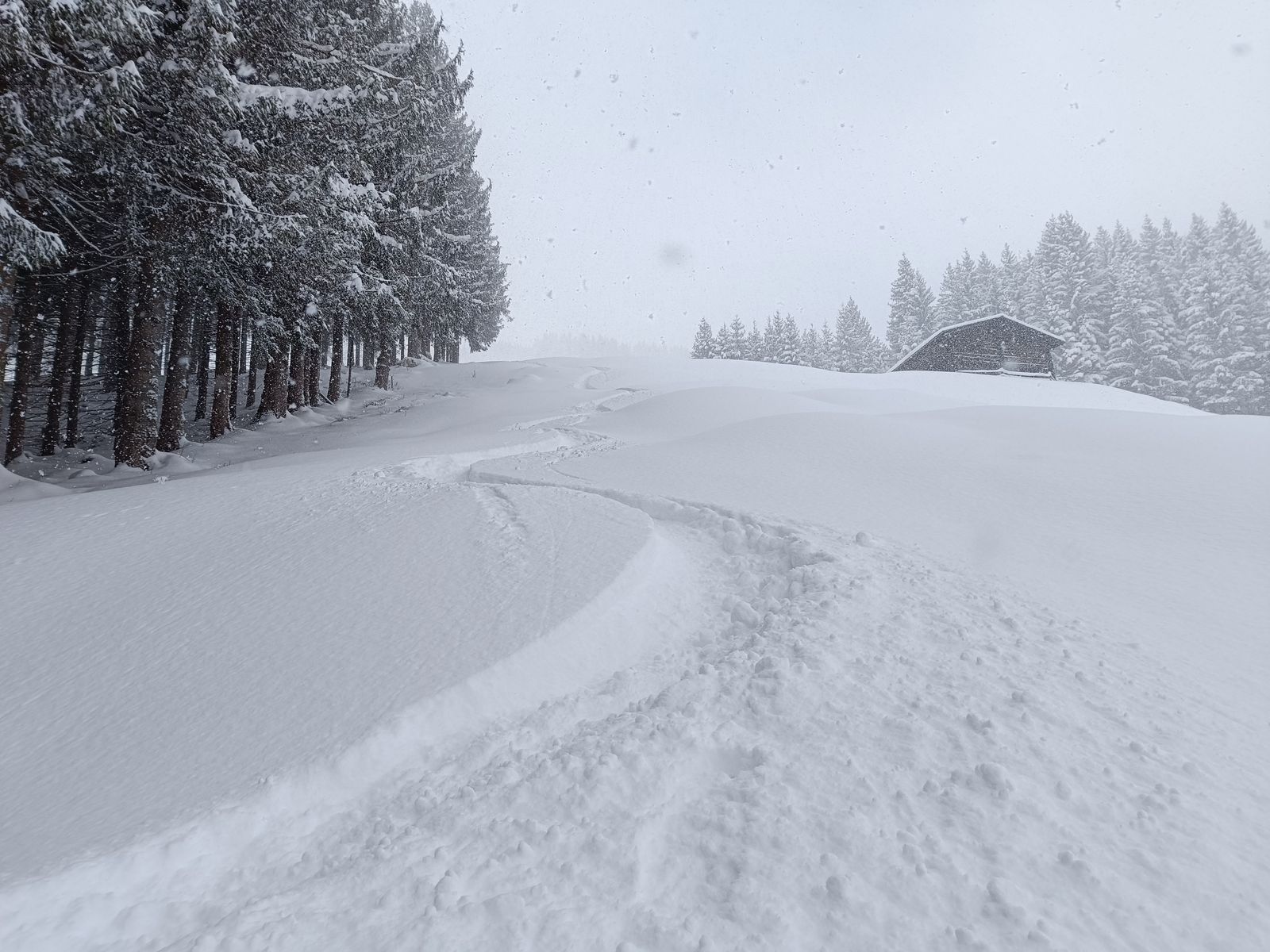 Die Schneelage ist so, dass es (mit Toleranz für Bodenkontakt) unten gerade so zum Abfahren reicht (10-15cm), nach oben hin aber schnell mehr wird. Oberhalb von 1100 Metern würde ich im Mittel so 50-60cm schätzen. Da aber wenig Unterlage vorhanden ist, kommt es hin und wieder zwangsläufig zu Steinkontakt. Mit defensiver Fahrweise lassen sich gröbere Schäden aber vermeiden. Ich bin auf der üblichen Route über die Untere Schwaigbergalm aufgestiegen. Wegen der schlechten Sicht ist meine Spur sicher nicht super ideal, aber ich bezweifle fast, dass die morgen noch zu sehen sein wird.