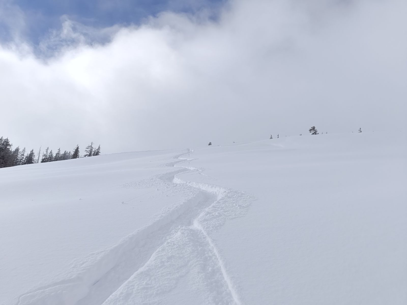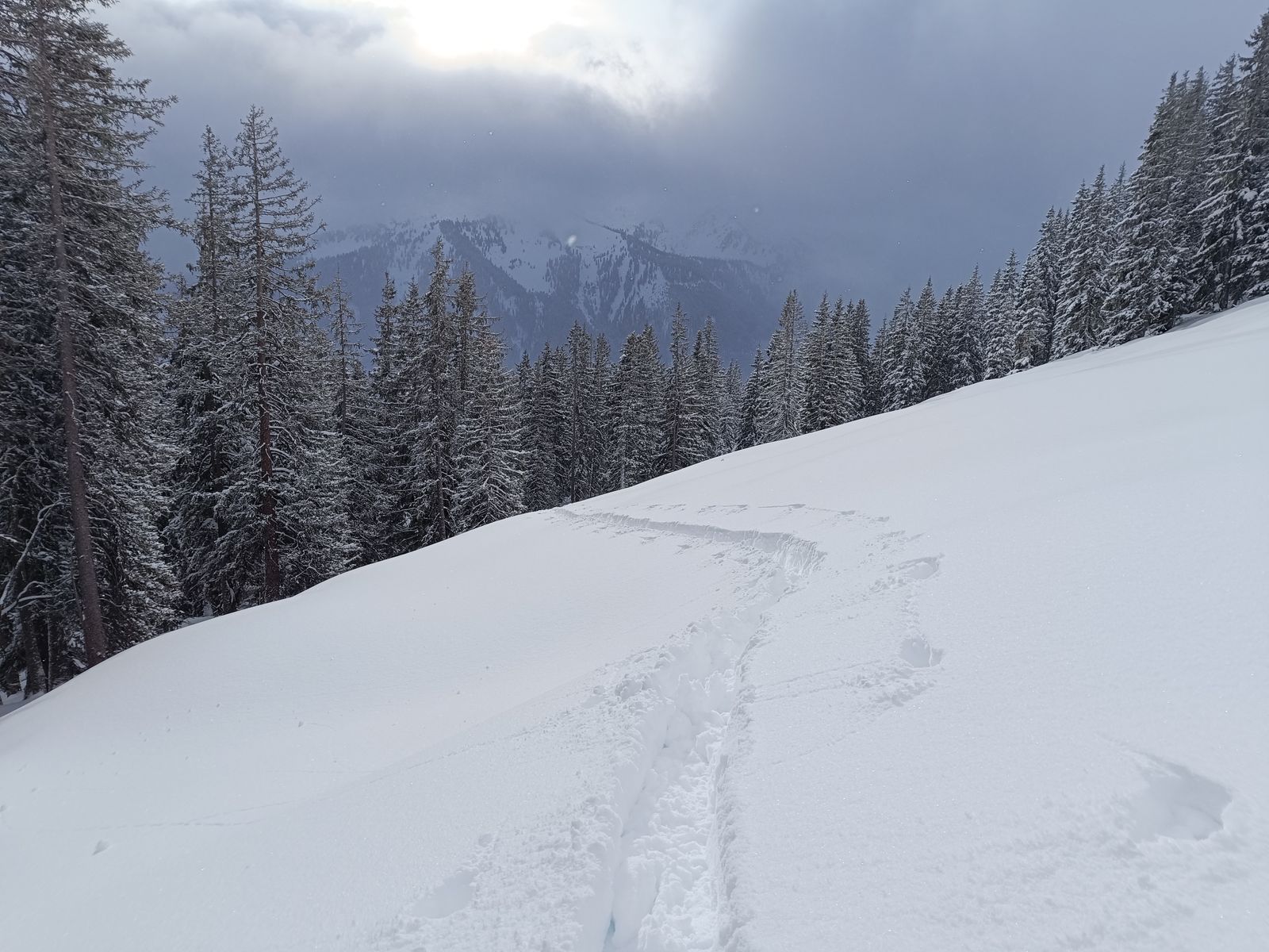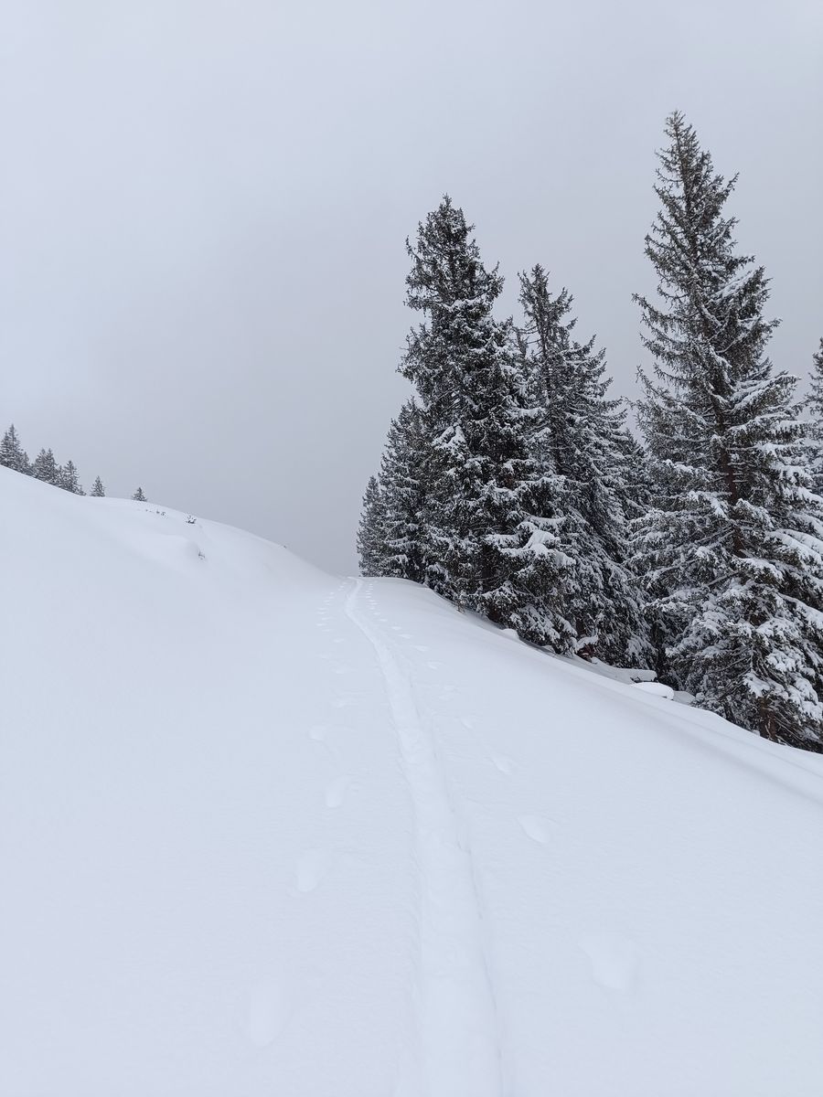 Lawinengefahr: Ich bin nicht ganz zum Gipfel, sondern nur bis etwa 1900 Meter aufgestiegen. Erstens war der Gipfel nämlich immer im Nebel und zweitens wäre mir das, ganz allein zumals, zu gefährlich gewesen. Auf dem Plateau vor der Gipfel war es sehr stürmisch (die ganze restliche Tour aber kein Wind) und der 3er oberhalb der Waldgrenze im LLB ist absolut zutreffend. Als ich an einer kleinen Kuppe entlangfuhr, hat sich gleich ein Mini-Schneebrett gelöst. Ohne Gipfel ist die Tour aber grundsätzlich so gut wie lawinensicher. Ich würde morgen, wenn das Wetter besser ist, wirklich zu großer Vorsicht raten, da die Eindrücke der letzten beiden Tage deutlich gezeigt haben, dass die Verhältnisse oberhalb der Waldgrenze kritisch sind.