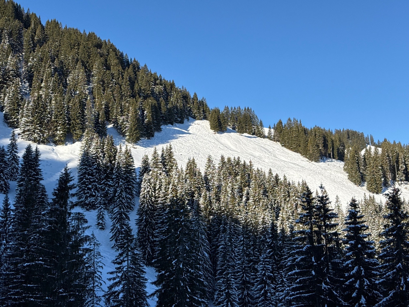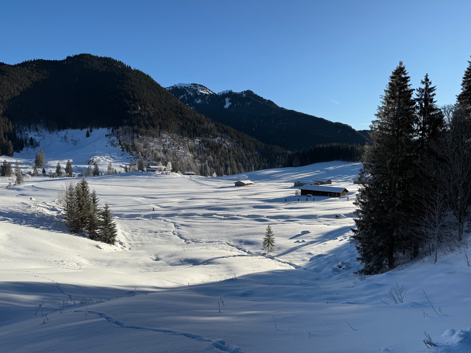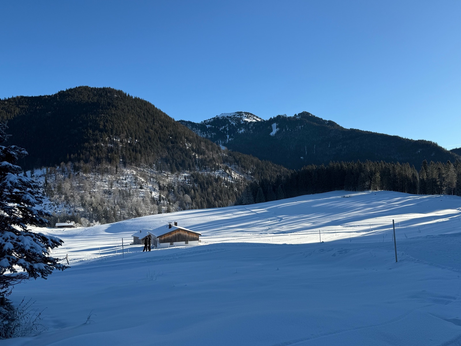 Kurz vor neun hoch zum Spitzingsee, vom Parkplatz Stümpfling die kurze Abfahrt runter Richtung Albert Link Hütte und dann abseits der Pisten hoch zum Grünsee und über den MNG Hang