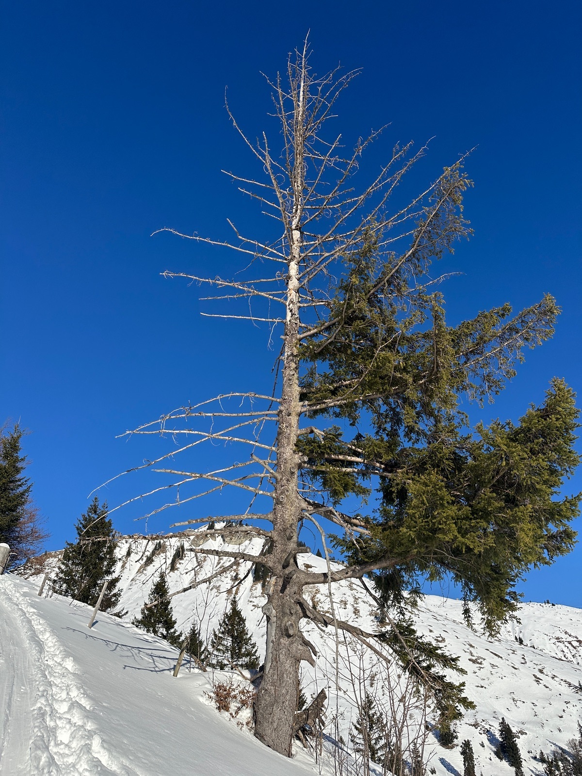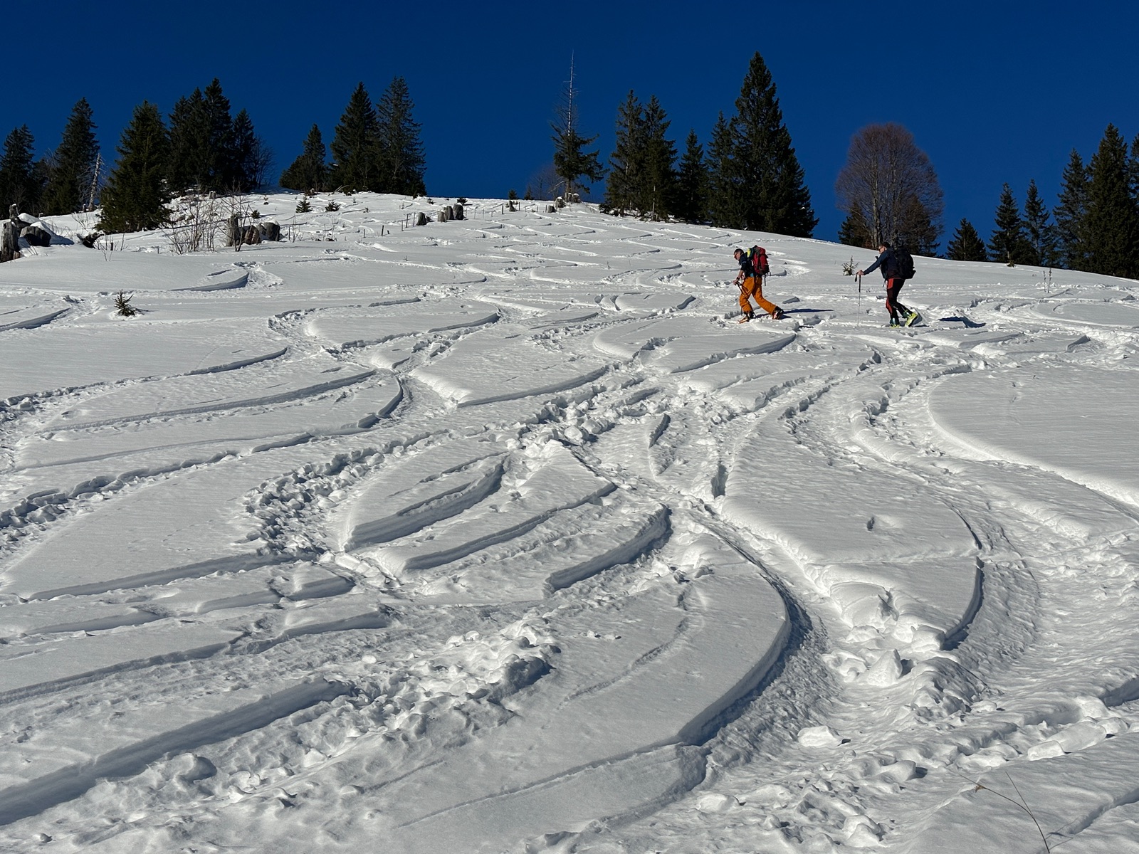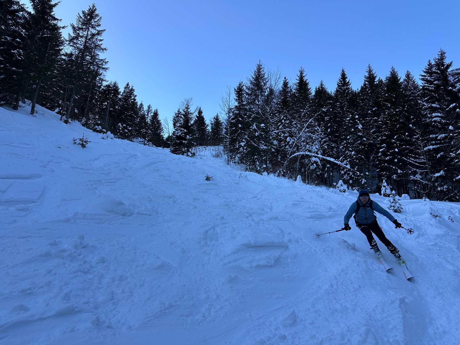 Mit 45 Minuten Verspätung aufgrund einer Materialpanne (Spezl hatte Skitourenschuhe in Lenggries vergessen und bemerkte dies erst unterwegs) ging es los - zunächst durchs eisige Unterautal bei minus 9 Grad, dann der Sonne entgegen. Beim Ombrometer bogen wir rechts ab (geradeaus führt der einfache Klassiker zum Gröbner Hals), hinüber zur Großzemmalm und ich einem Bogen mit recht lawinensicherer Spur durch nun steiles Gelände hinauf bis gut 100 Höhenmeter unterhalb vom Gipfel. Den haben wir uns gespart, da spät dran, und lieber Brotzeit gemacht, bis die Sonne entschwand. Nun in schönem Pulver auf der Anstiegsroute retour. Am Grat Richtung Gröbner Hals einige Schneemäuler, bei guter Routenwahl aber überschaubares Risiko. Kein Steinkontakt heute.