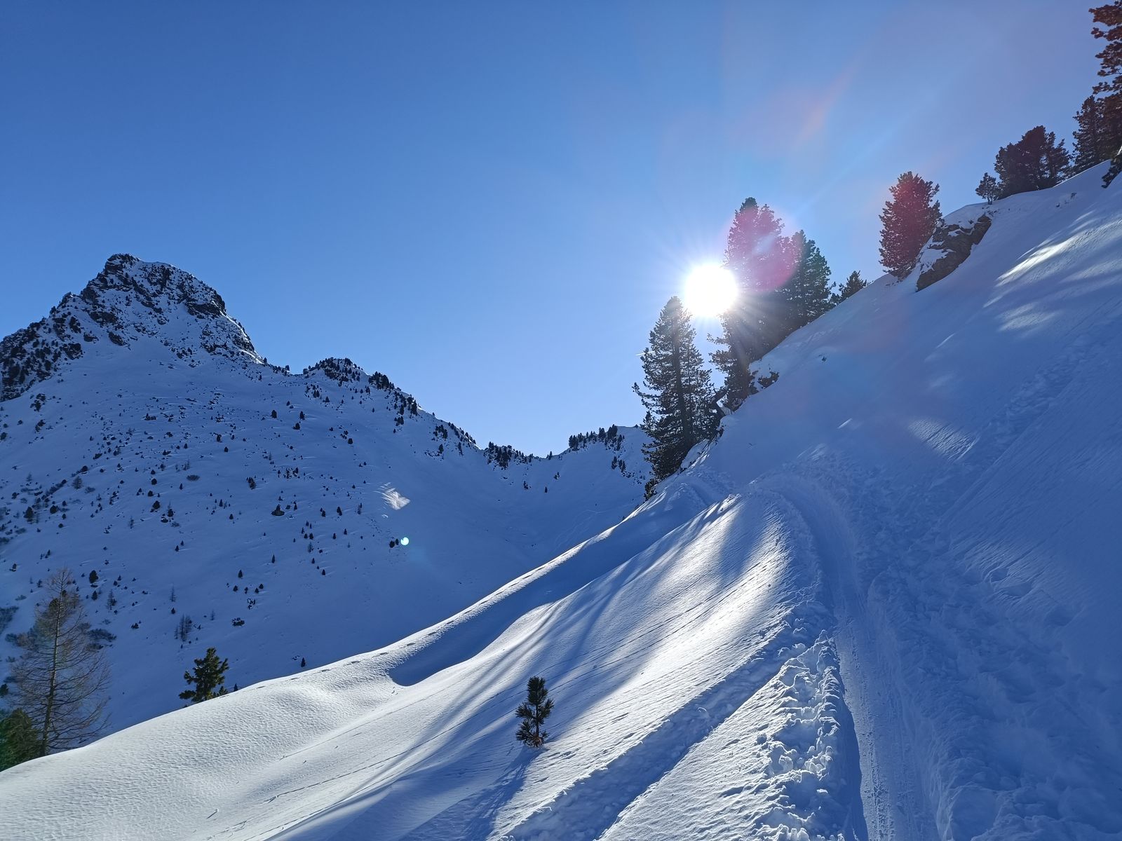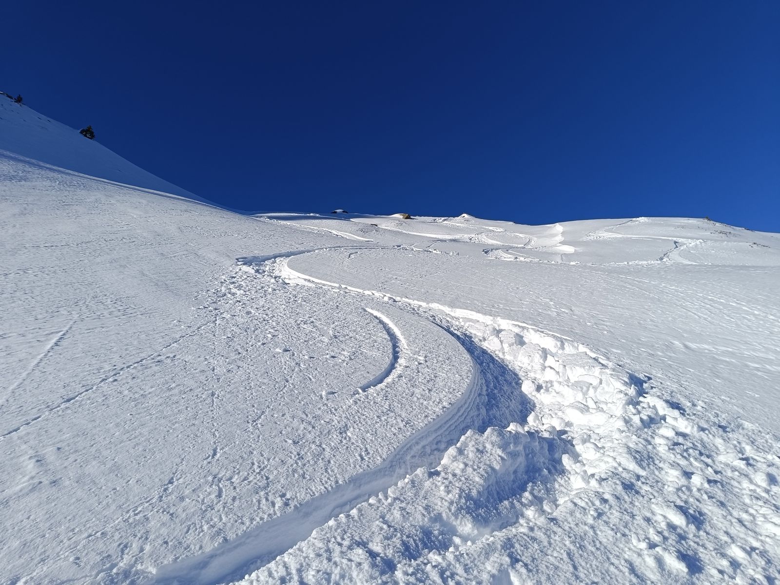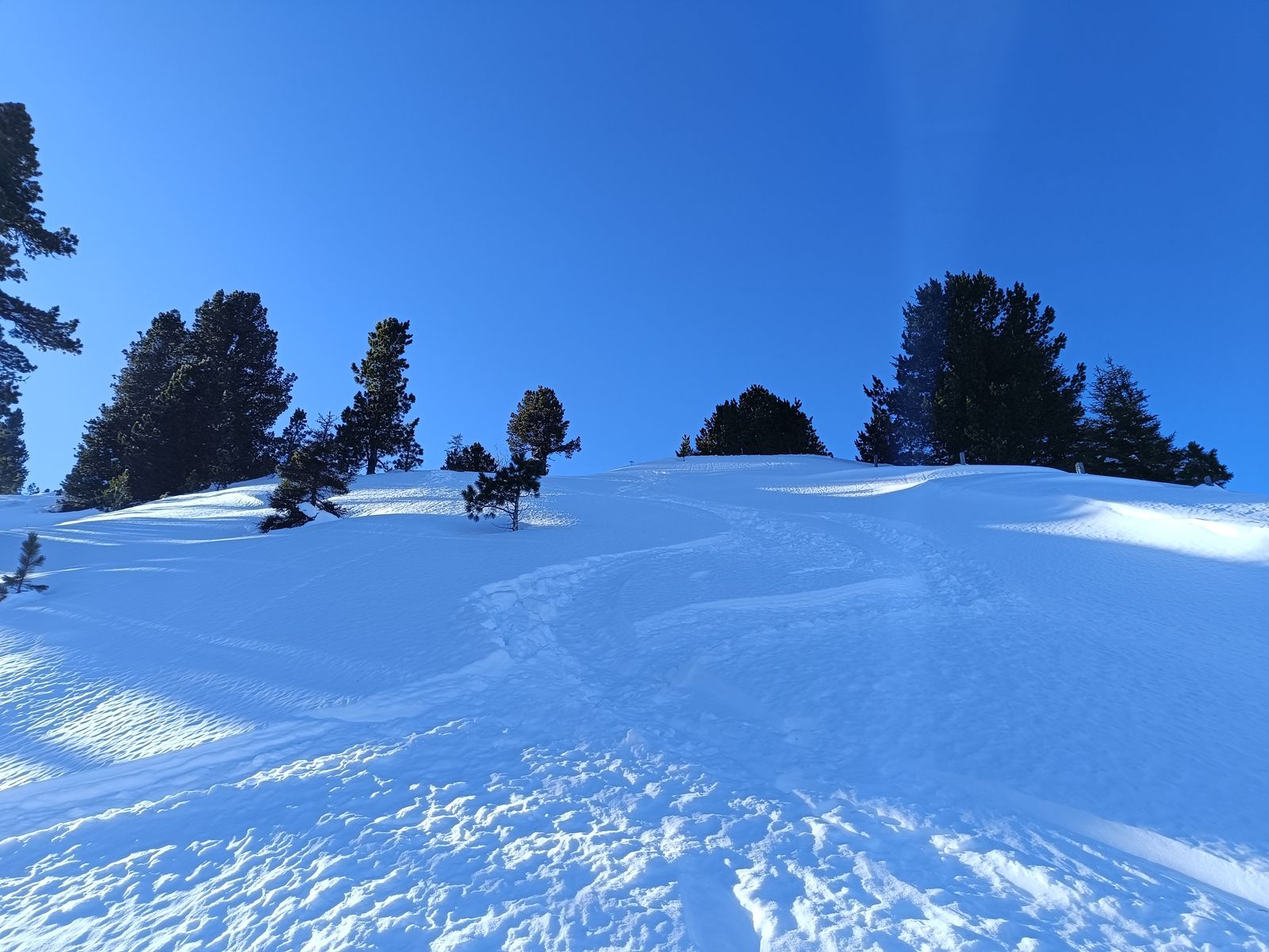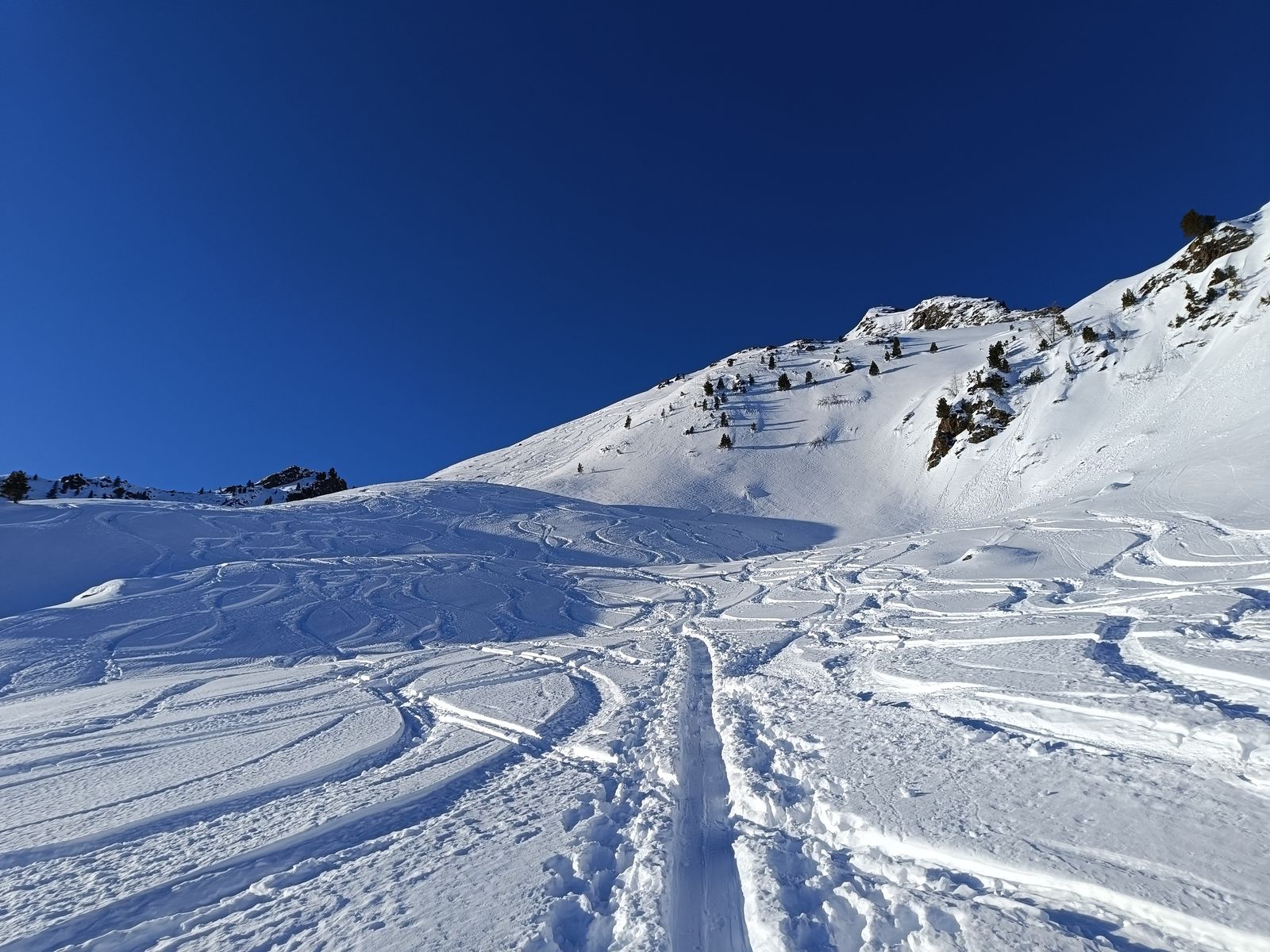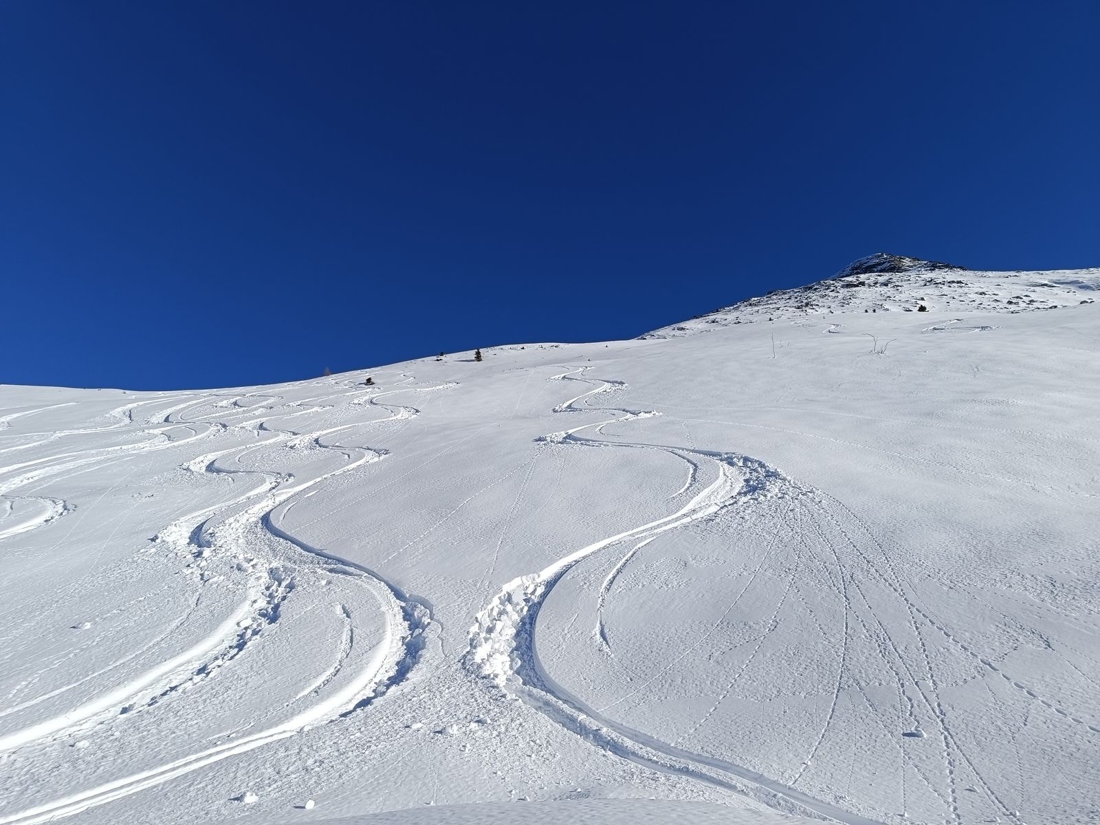 Ich habe den Eindruck, dass die Verhältnisse durch die Setzung des Neuschnees jeden Tag besser werden, weil man eigentlich gar nicht mehr auf Steine kommt bzw Bodenkontakt hat. Da hätte ich heute auch das gute Material verwenden können.