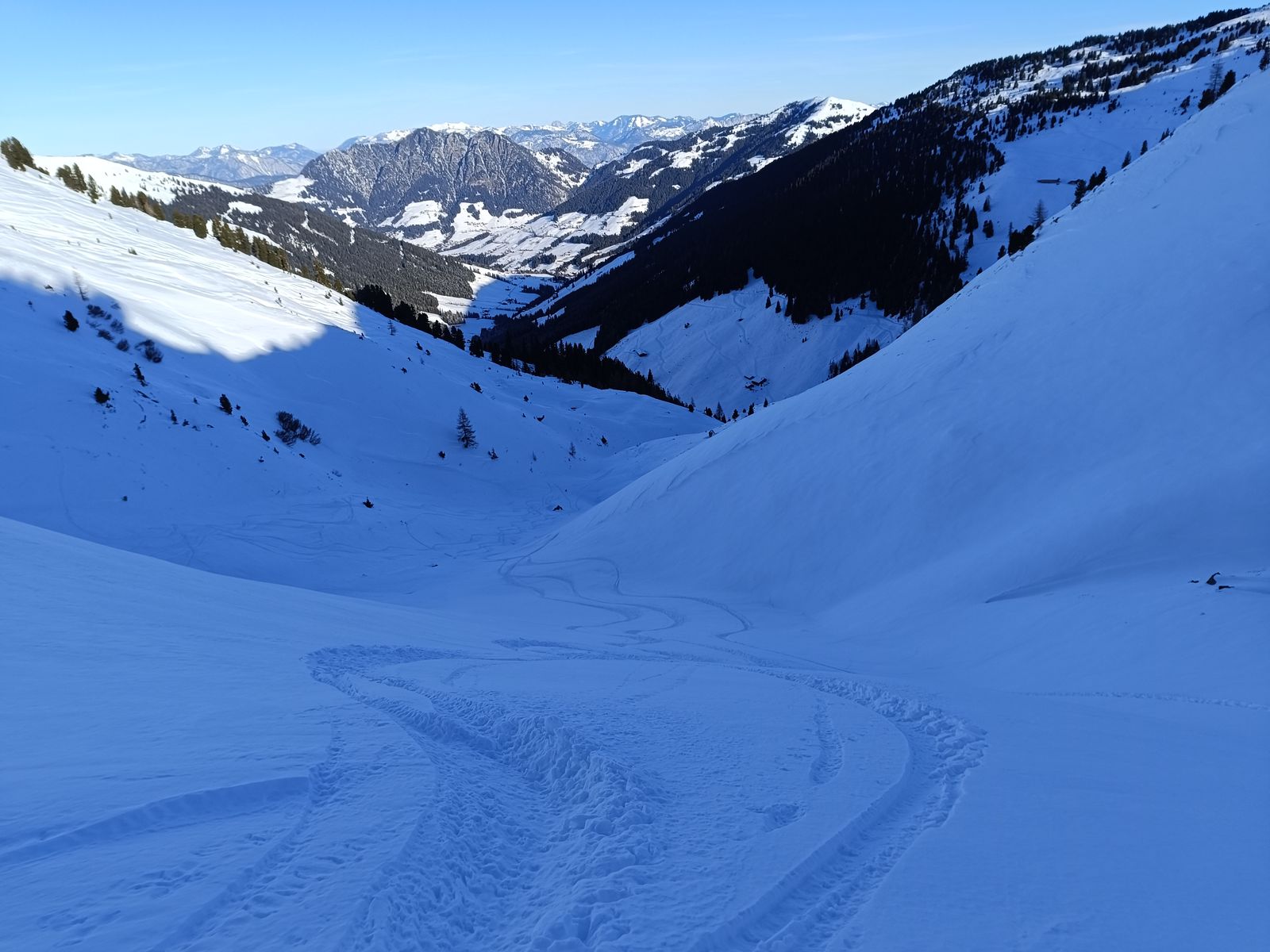 Grundsätzlich sind alle Touren im Gebiet schon gemacht worden, auch die südseitigen Abfahrten Richtung Zillertal. Die Osthänge zwischen Wiedersberger Horn und Sagtaler Spitzen sind so gut wie komplett verspurt und am Gamskopf wurde auch schon viel gefahren. Platz für eigene Spuren ist hingegen noch am Westhang des Gr. Galtenbergs. Dessen kleiner Bruder, der einige der besten Abfahrten in den Kitzbühelern bietet, wurde bisher erst sehr spärlich gemacht und mir persönlich sah es dort aus der Ferne noch zu steinig aus, weshalb ich da nicht hoch bin.