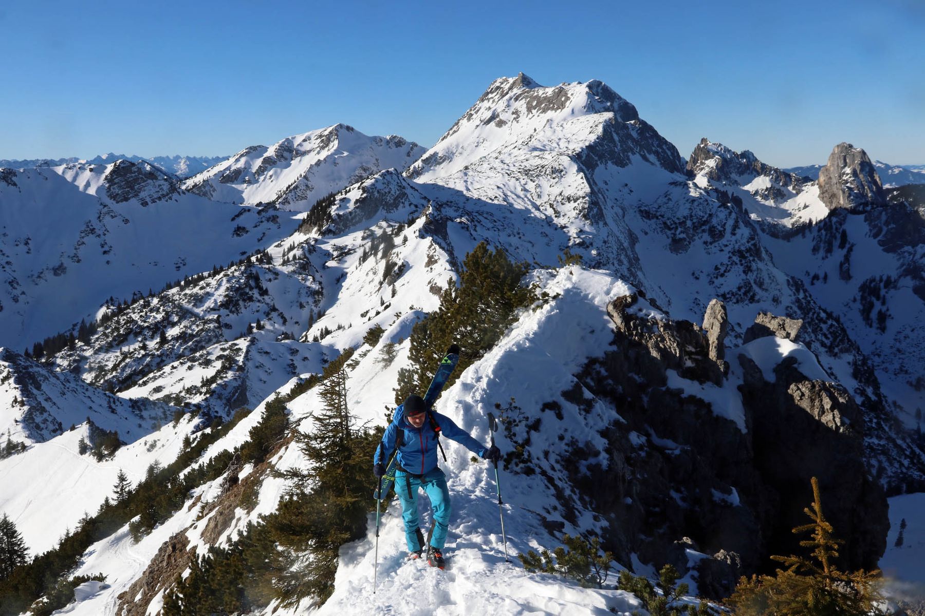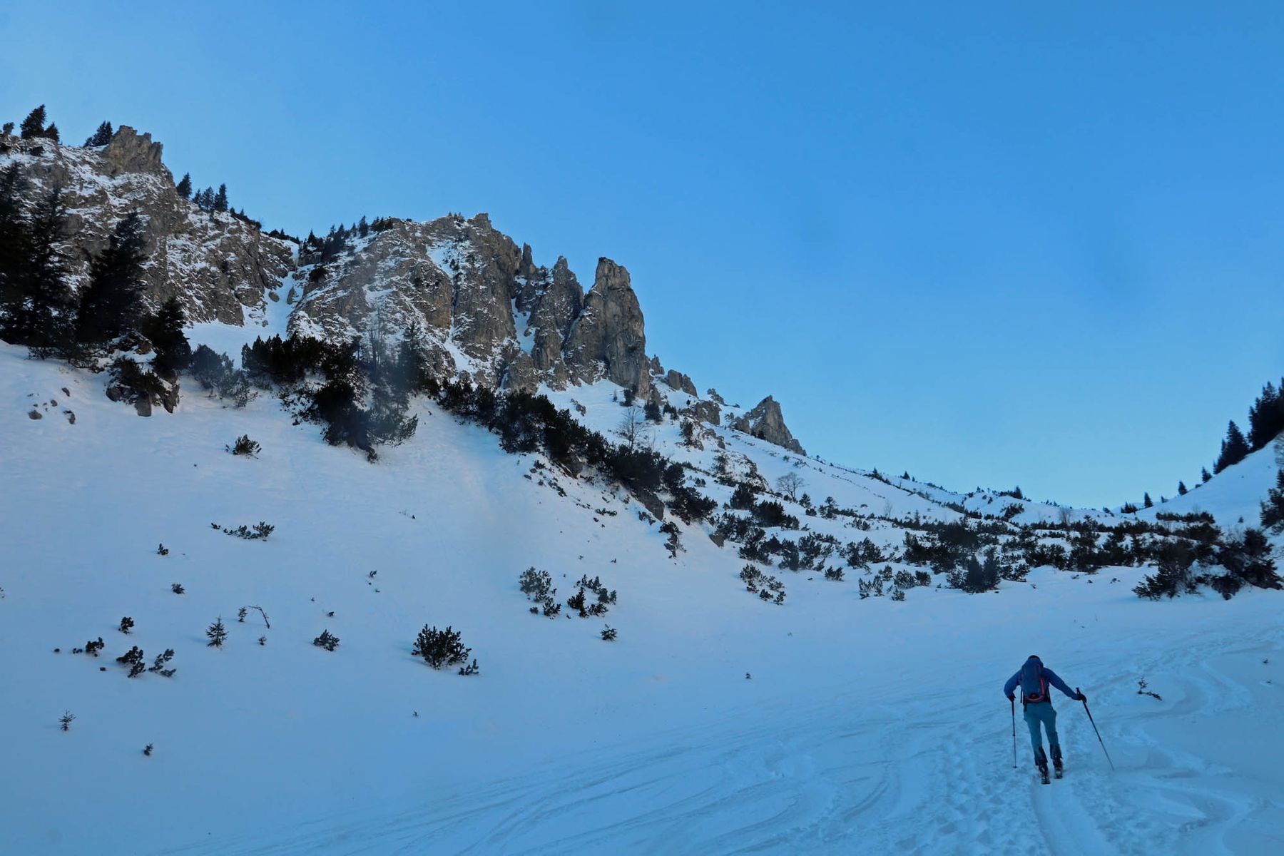 Tatsächlich lag in der „Kalten Ebene“, in die man vom Skidepot der Scheinbergspitz steil einfährt noch guter Powder. Allerdings muss man schon sehr gut auf den Ski stehen, da der Schnee in der Latschenzone gerade so ausreicht, d.h. man muss auch steile, schneegefüllte Rinnen ausnützten.