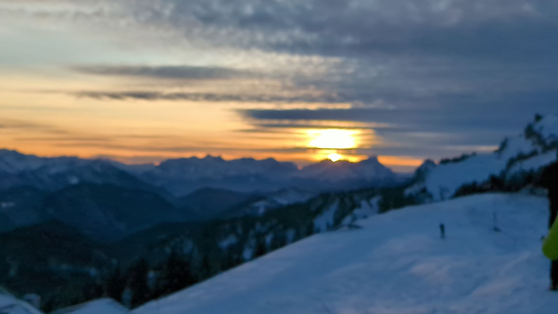 Die Aufstiegsspur ist wieder fahrbar. (im Wald teils nur wenig Schnee auf Herbstlaub) So gehts angenehm und zügig auf den Gipfel. Der späte Nachmittag hat auch seine besondere Stimmung.