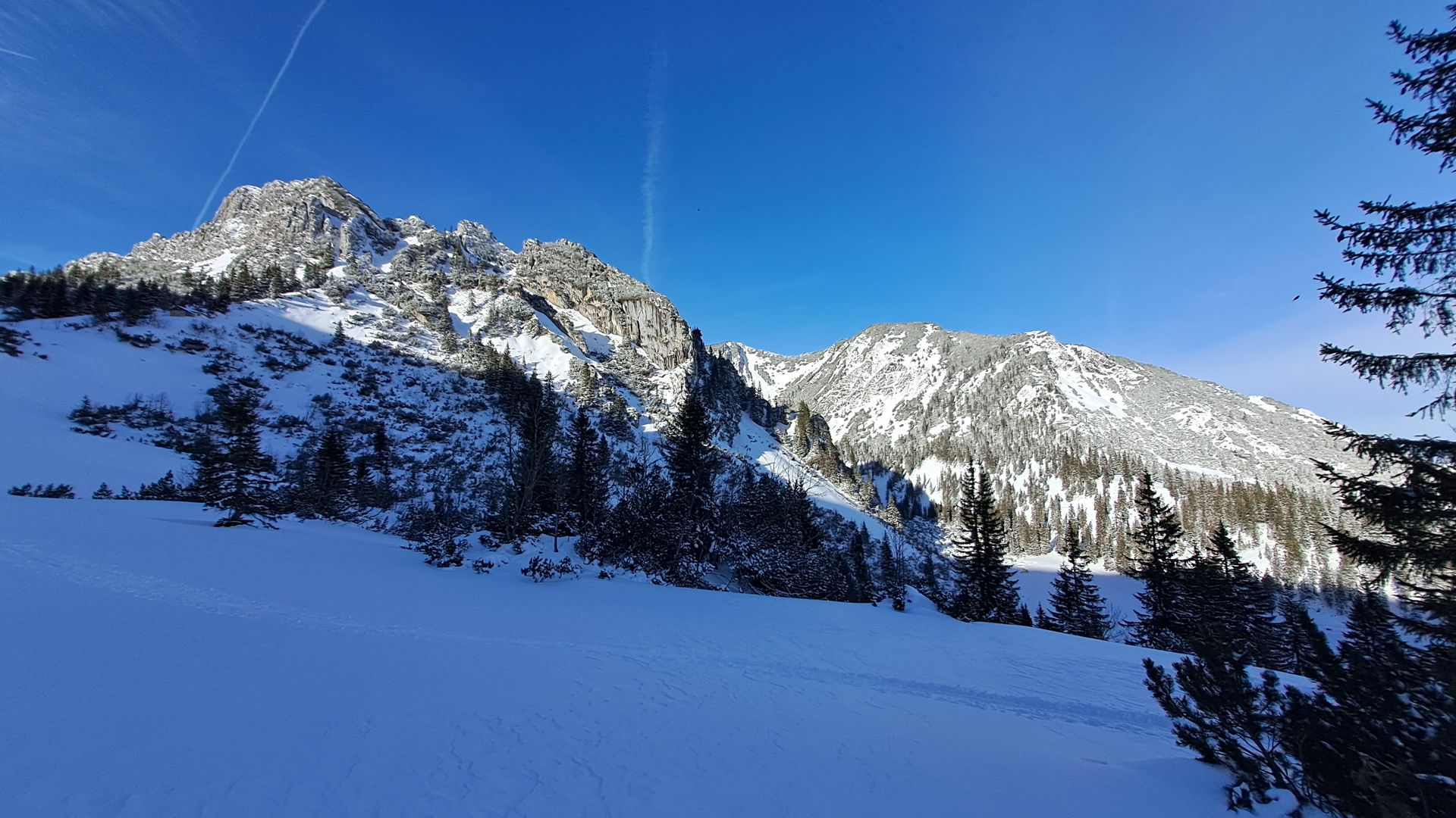 Los gings in Geitau, bei frostigen Temperaturen. Im Tal ist alles schön verschneit und so gleitet man über die lange Wiese Richtung Mieseben. Sobald man den Talboden verlässt wird die Schneeauflage extrem dünn. Hier war keine Abfahrt möglich.