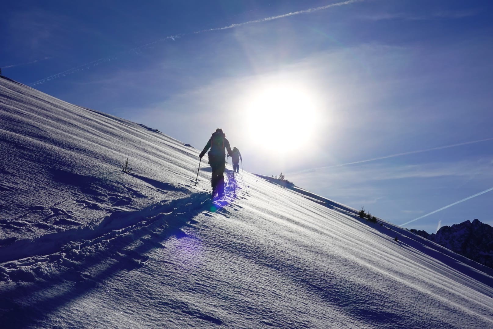 Start von Namlos - großer Parkplatz an der Kirche bei -16Grad gegen 8:30h. Um zum Ausgangspunkt der Tour zu kommen muss man entlang der Strasse Richtung Kelmen zurücklaufen (der direkte Parkplatz gegenüber dem Einstieg ist nicht geräumt) und läuft entlang dem Forstweg zum Amselboden und einer großen Wildfütterungsstelle. Schnee ab Straße - am Amselboden ist ein Wildschongebiet - der Weg ist aber für Skitourengeher klar bezeichnet und wird ziemlich schnell zum gut eingeschneiten Wanderweg. Nach einer Bachdurchquerung geht es immer in vielen Spitzkehren erst durch recht dichten (wenig gut eingeschneiten Wald) dann durch hohe Fichten (sehr viel Schnee) bis man auf dem sonnigen Rücken der Engelspitze landet. Durch den Wald ist schon etwas Wegfindung gefragt - speziell war dann die anschließende Latschenzone - leider noch lange nicht zugeschneit - wir haben uns ziemlich durchgekämpft. Wie in der Tourenbeschreibung beschrieben ist dann der obere Teil abgeblasen - aber für Spitzkehren mir Harscheisen hat es gerreicht. Herrlicher Blick und wenig Wind von der Spitze. Die Abfahrt war dann doch noch super - Pulverschnee - wenig Latschenkontakt und weiter unten - naja ab und an Zweige, wenige Steine und immer wieder recht eng durch den Wald --- aber mehr Schnee wäre natürlich gut. Heute ging die Tour gut - und keine andere Gruppe unterwegs... wir hatten sowohl den Austieg wie die Abfahrtshänge ganz für uns. Ca 1000 Höhenmeter Aufstieg und druch die vielen Spitzkehren durch Wald, hohe Bäume und dann die Latschen anstrengender als gedacht ... aber schon was besonderes als Skitour. Nur die Sonne ist natürlich weiter unten gegen 15h schon wieder weg und Namlos liegt im Schatten. Auf der Hinfahrt waren die Straßen noch schneebedeckt - zurück leider unendlicher Stau...