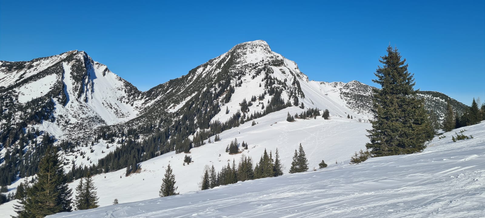 Blick auf das Sonntagshorn: da kommt man wohl entlang des Sommerweges ganz gut durch die Latschen, aber viel Schnee hat es da nicht. Siehe Bild 2.