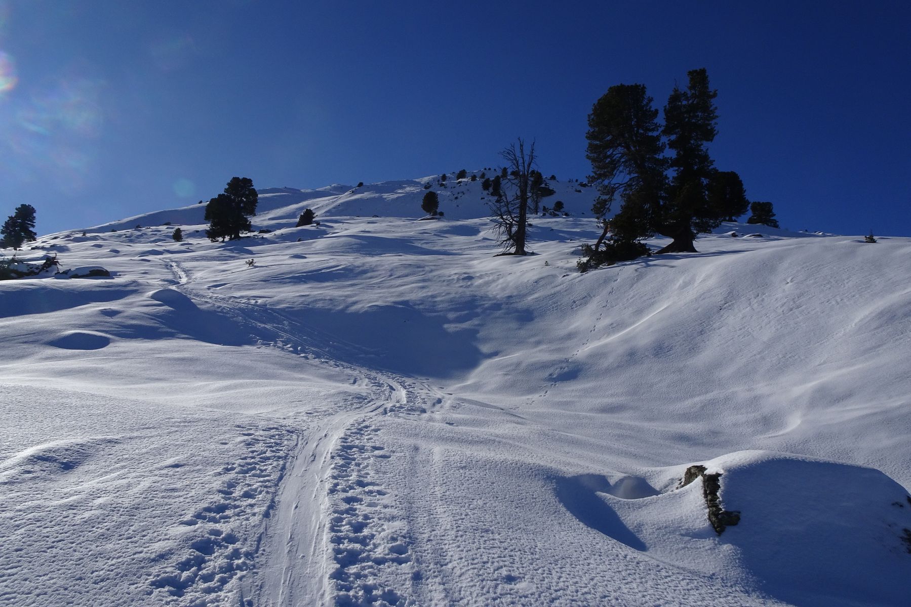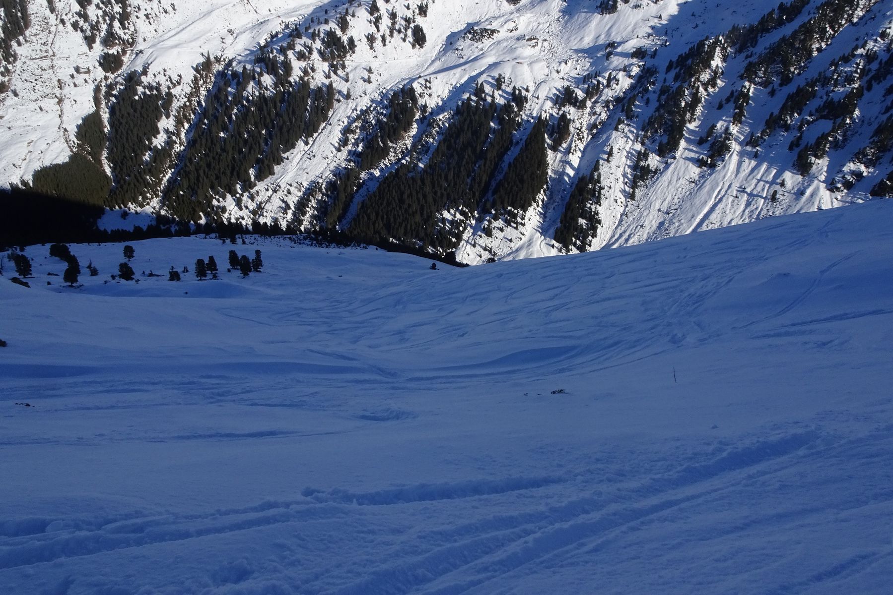 Oberhalb Frommalm Schneelage dann überall ausreichend, teils vor allem im Schatten (Nordhänge) beginnende Deckelbildung. Der ist aber überall noch ganz dünn und lässt sich bei der Abfahrt gut durchfahren. Drunter alter Pulver. Also nicht mehr ganz so fluffig wie im Bericht vom Donnerstag (Pallspitze), aber viel besser als im Bericht von gestern (Fünfmandling). Alles in allem eine gute Abfahrt, vor allem in Anbetracht der allgemeinen aktuellen Schneelage. Die ostseitigen Touren weiter hinten im Langen Grund (Niederjoch etc.) sehen aus der Ferne eher schlechter aus (stark verspurt, wenig Schnee)