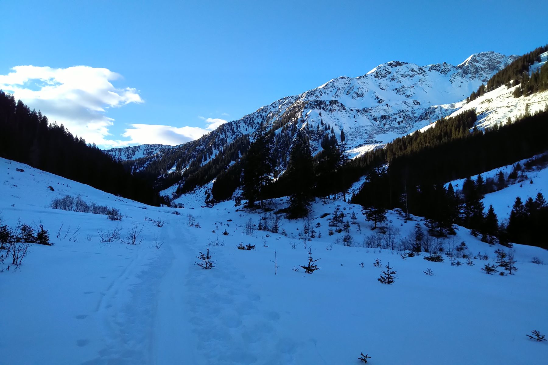 Beim Start bei der Schönangeralm war es relativ mild, aber weniger Wind als vorhergesagt - zum Glück sollte es so bleiben! Jedenfalls bzgl. Triebschnee, von der Temperatur her hätte es auf der Sonnenseite ruhig etwas durchziehen können ;)