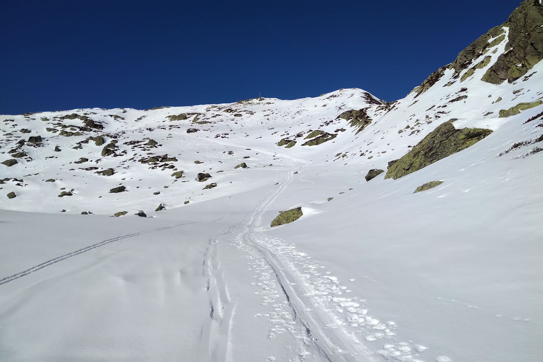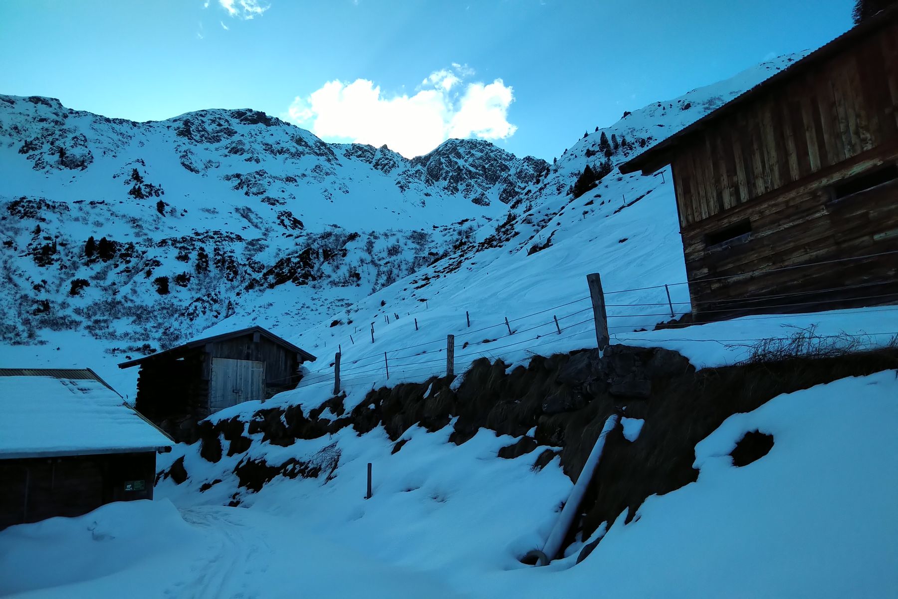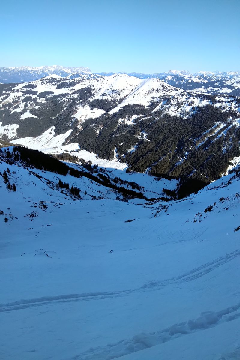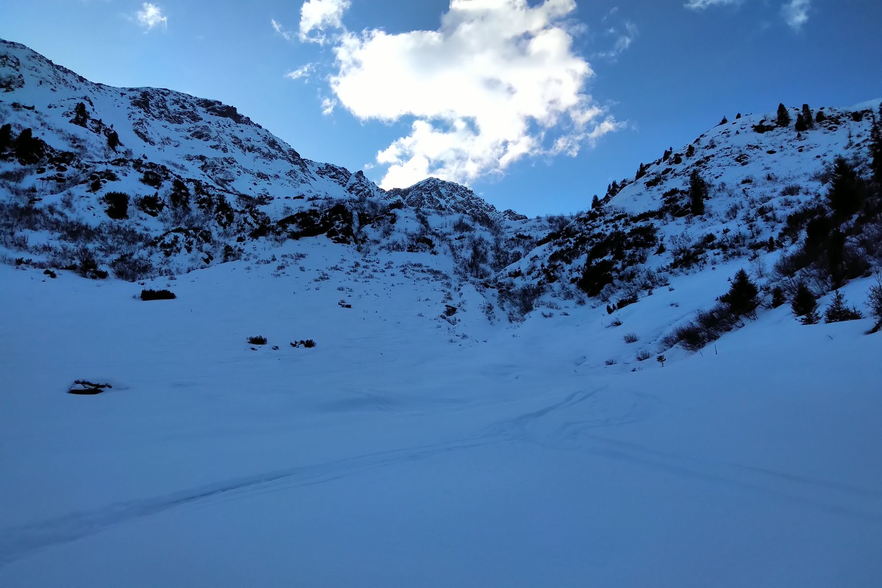 DIe Schneequalität war besser als erwartet! Natürlich kein Pulvertraum, aber ganz brauchbar. Die untere Steilstufe auf 1700m war etwas mühsam (Slalom durch die Sträucher wegen geringer Schneelage), aber es ging ohne Abschnallen oder Flurschäden.