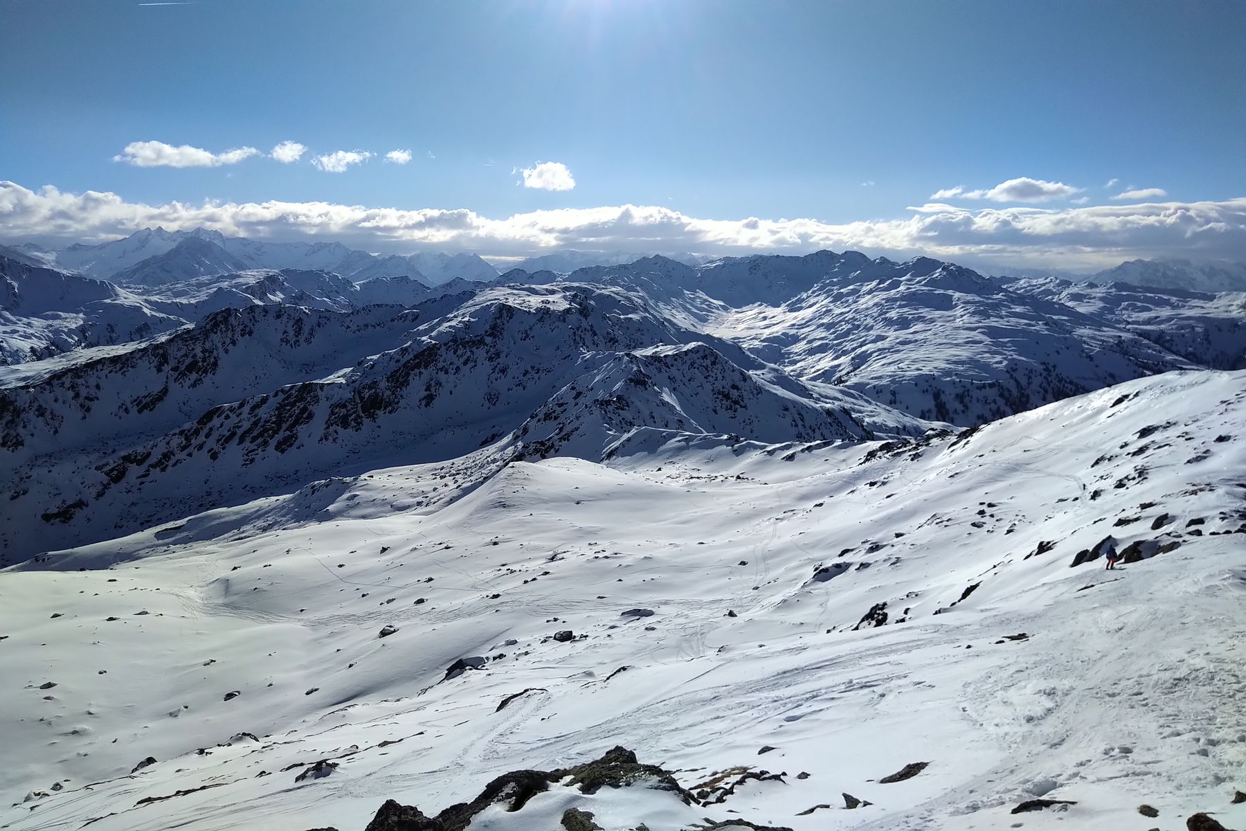 Blick zurück zum ersten Abfahrts-Teil, der Einstieg ist am tiefsten Grat-Einschnitt: