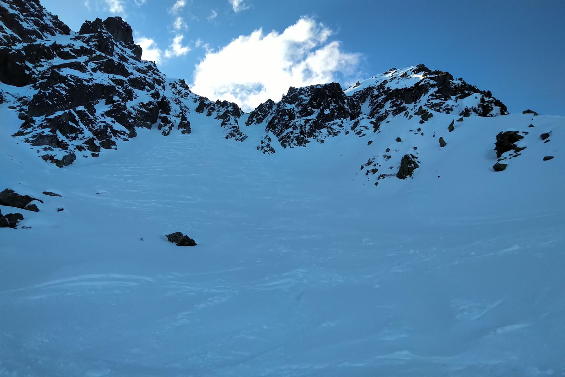Einstieg zur Nordost-Rinne. Wir sind bei den Anschnall-Spuren noch etwas weiter ums Eck gegangen und haben dann die Ski in der rechten Rinne angeschnallt:
