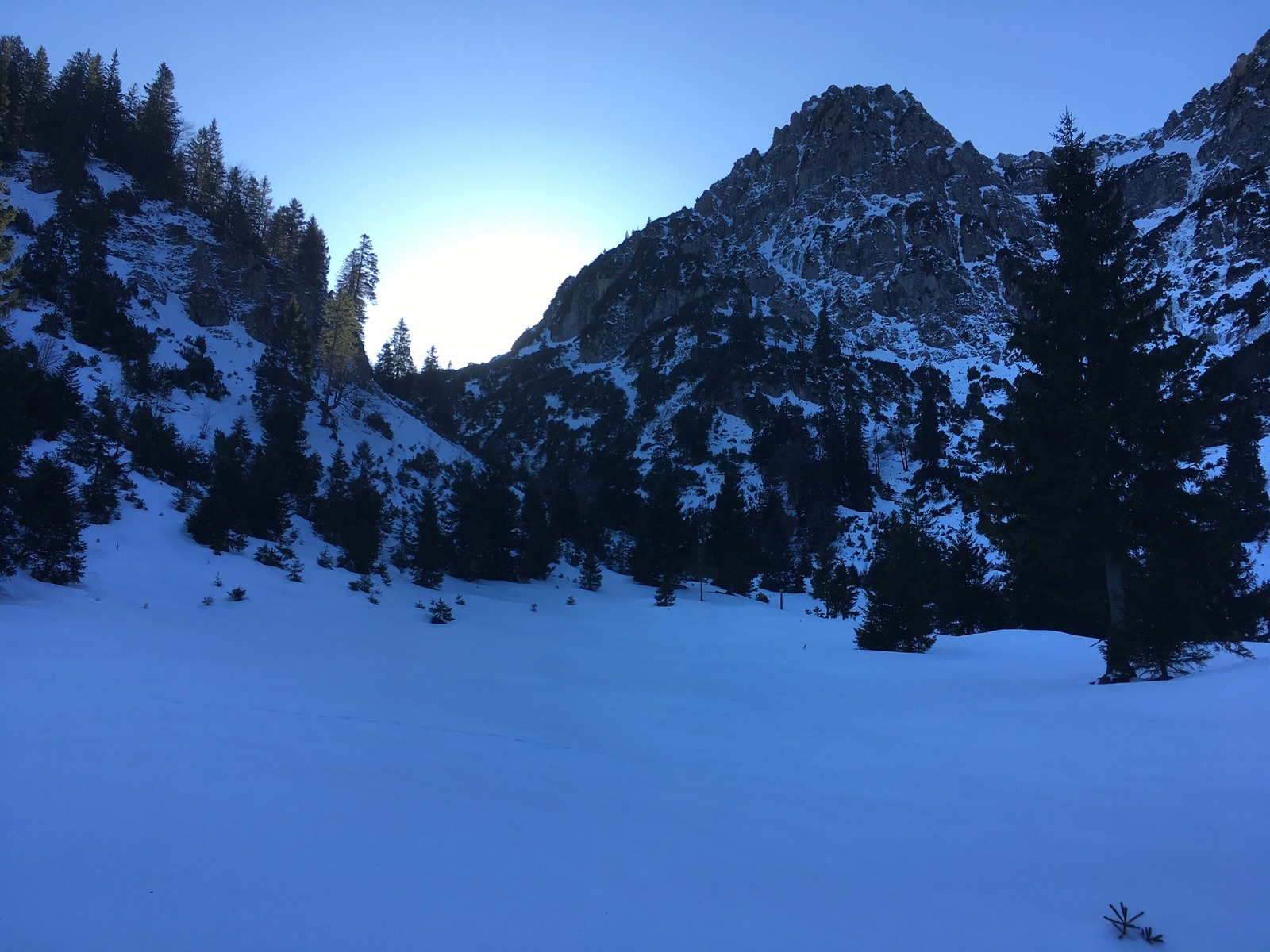 Und der Blick hinüber zum Demeljoch (auch eine schöne Skitour, allerdings vom Sylvensteinsee mit ewig flachem Start und einigen Schikanen im Mittelteil):