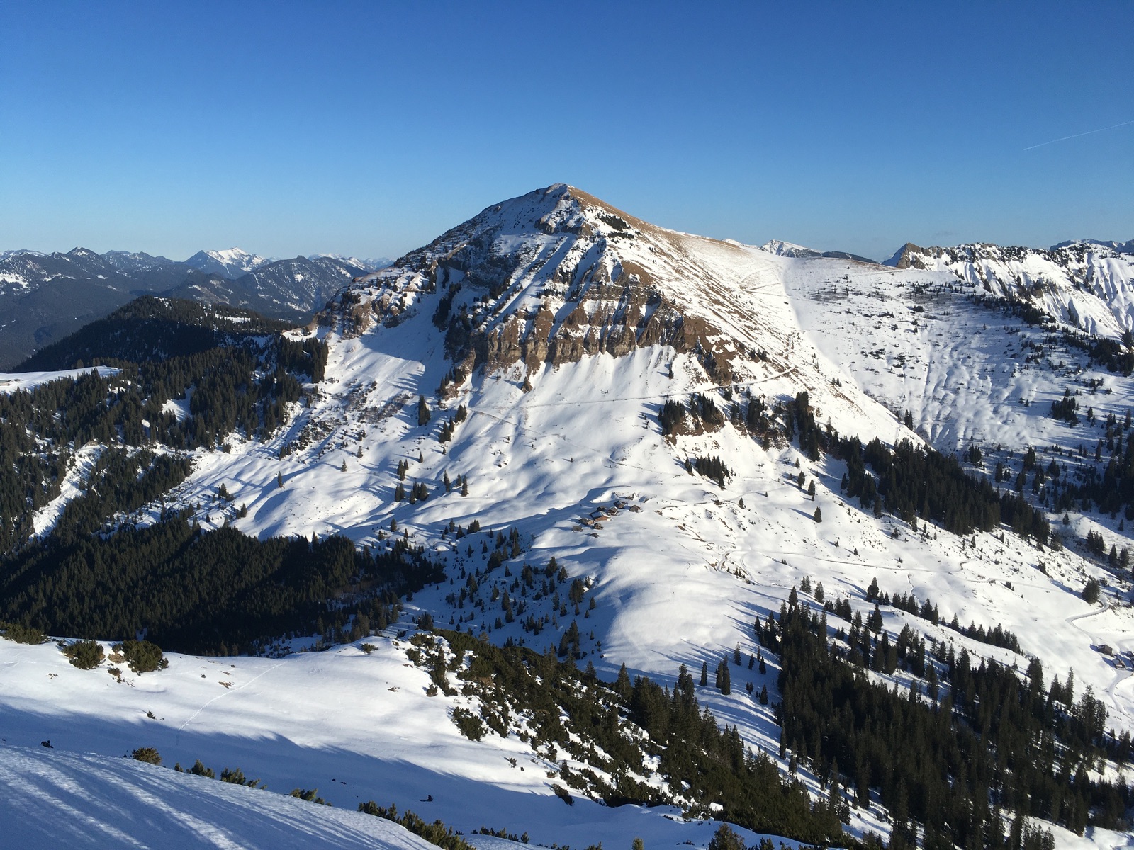 Blick von der Abfahrt hinüber zum Juifen mit dem Rotwand-Hochleger darunter: