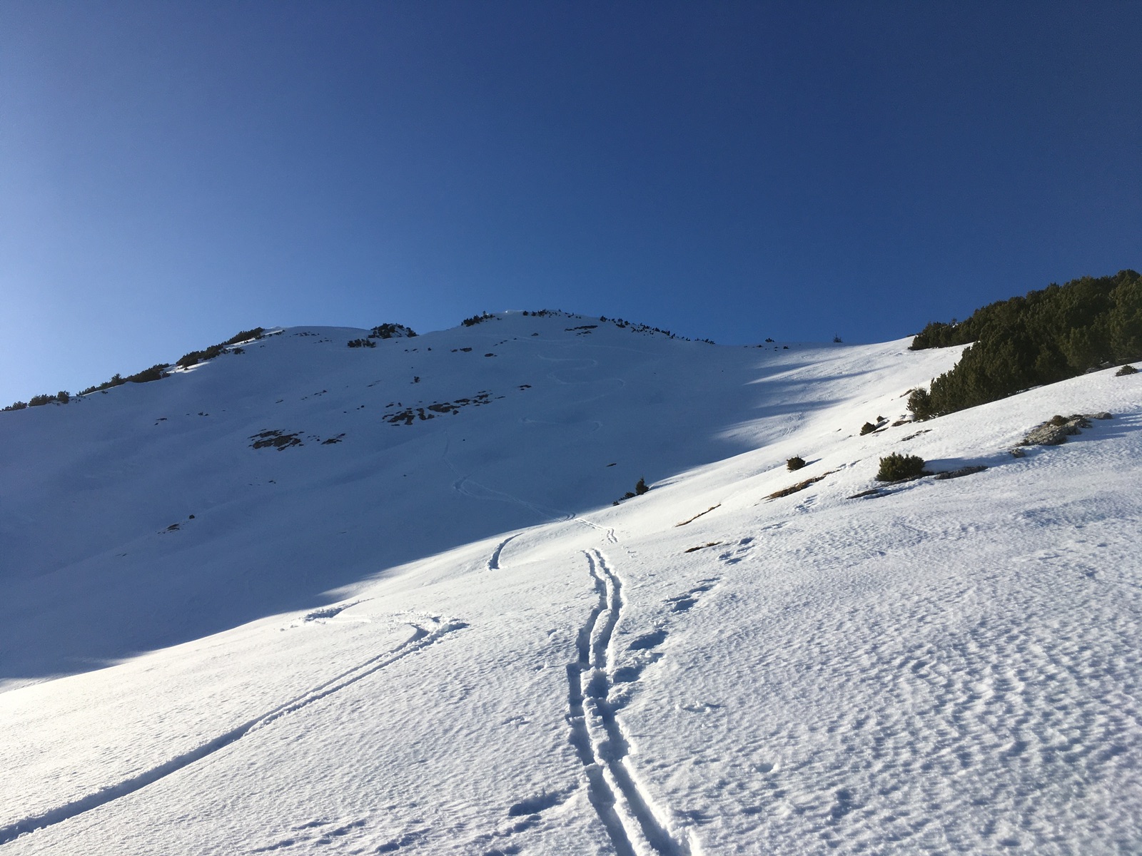 Die Abfahrt bot dann zwar keinen Idealpulver, war aber deutlich besser als gedacht. Allerdings nur oben schöne Hänge, ansonsten gilt es sich durchzumogeln durch den Bewuchs und das Forststraßensystem zu nutzen (auf den Forststraßen gab es auch schon die eine oder andere Stelle, wo es dünn wird - meistens wo die Sonne hinkommt oder die Bäume abschirmen; an sich aber gut ohne ohne Materialschäden - bei weiterer Erwärmung wird man schauen müssen, ob es noch durchgehend geht). Steinski sind dringend anzuraten, auch wenn ich nur einmal im Gipfelhang heftigeren Stein-/Bodenkontakt hatte.