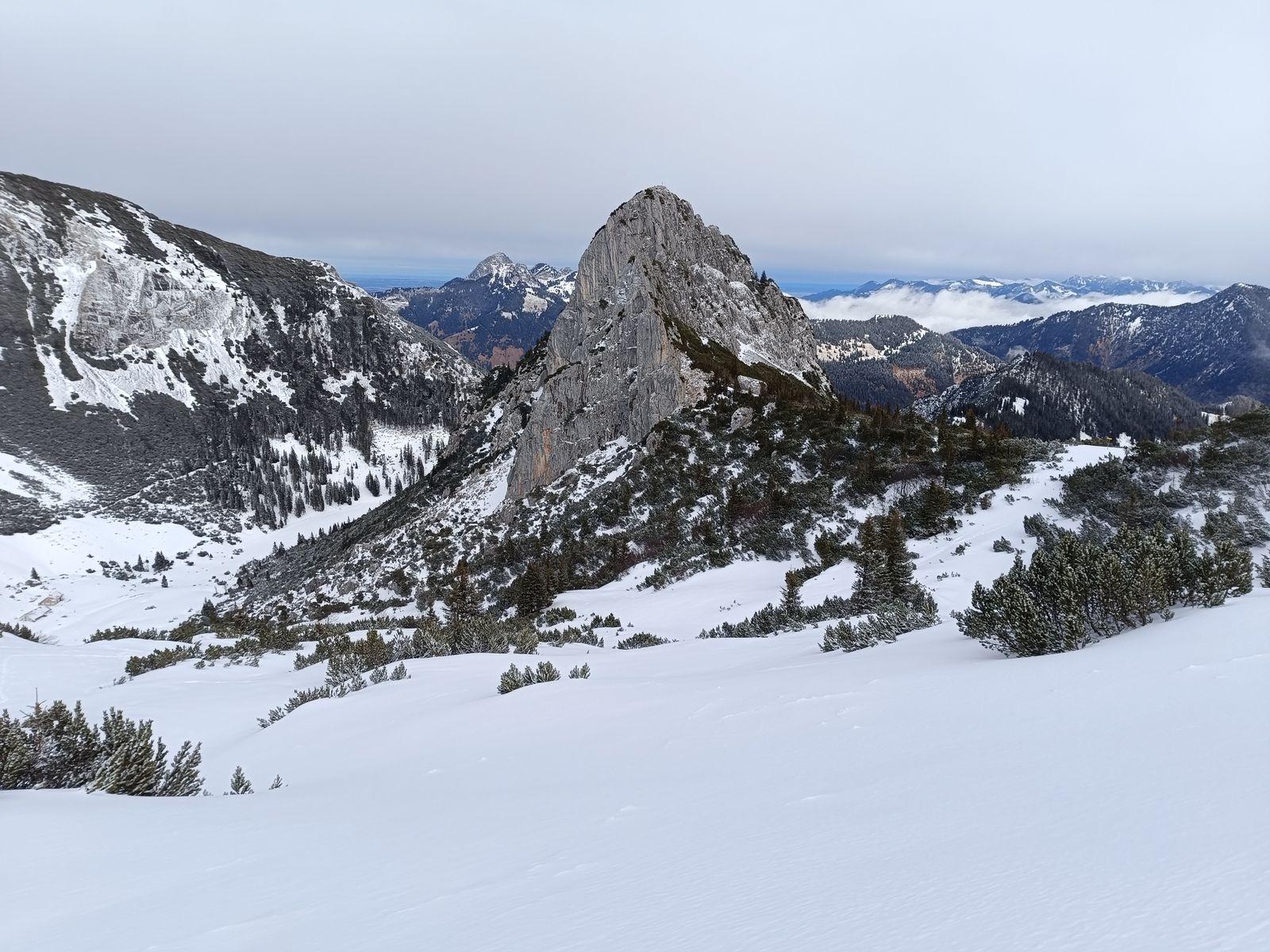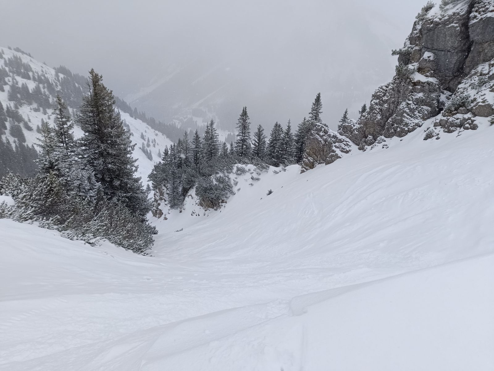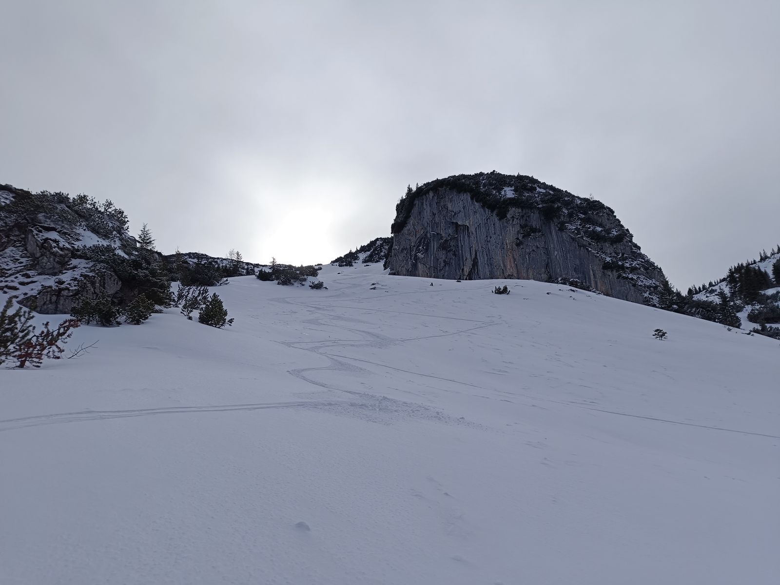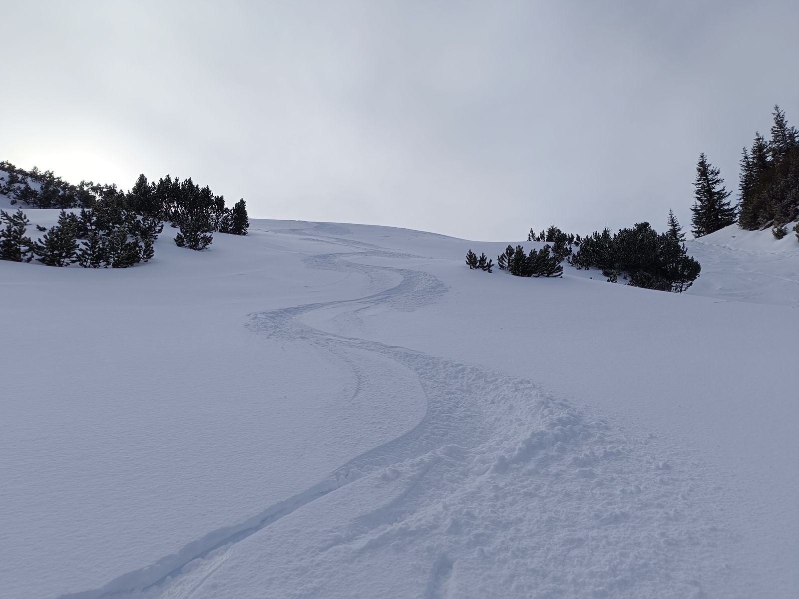 Und dabei sind die Bedingungen wirklich brauchbar, teilweise sogar gut. Da hab ich am Spitzing schon deutlich mehr Leute bei viel schlechterem Schnee getroffen. Es hat am Vormittag etwa 5cm Neuschnee gegeben. Dieser fiel auf eine zwar geringmächtige, aber sehr kompakte Altschneedecke und ließ sich wirklich schön fahren. Natürlich fehlt weiterhin ein Meter Schnee, aber Spaß machts trotzdem. Kein Steinkontakt.