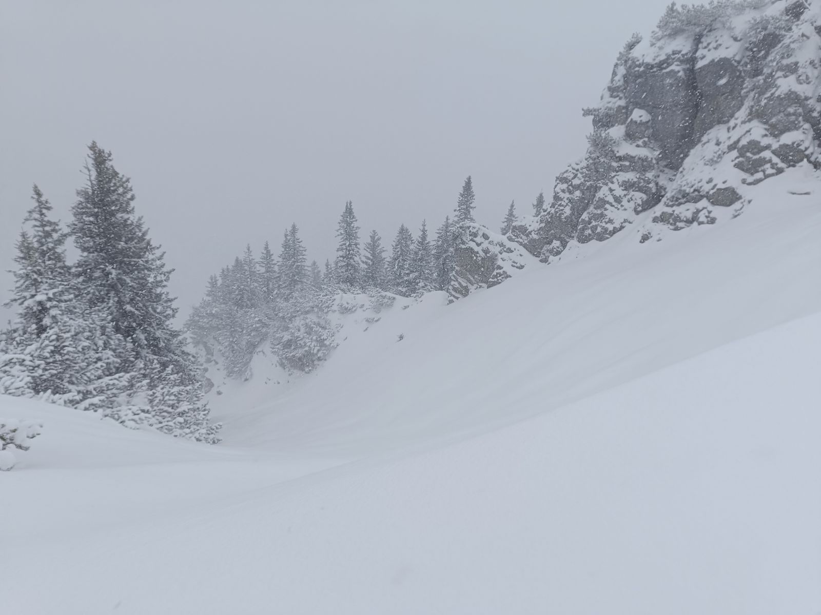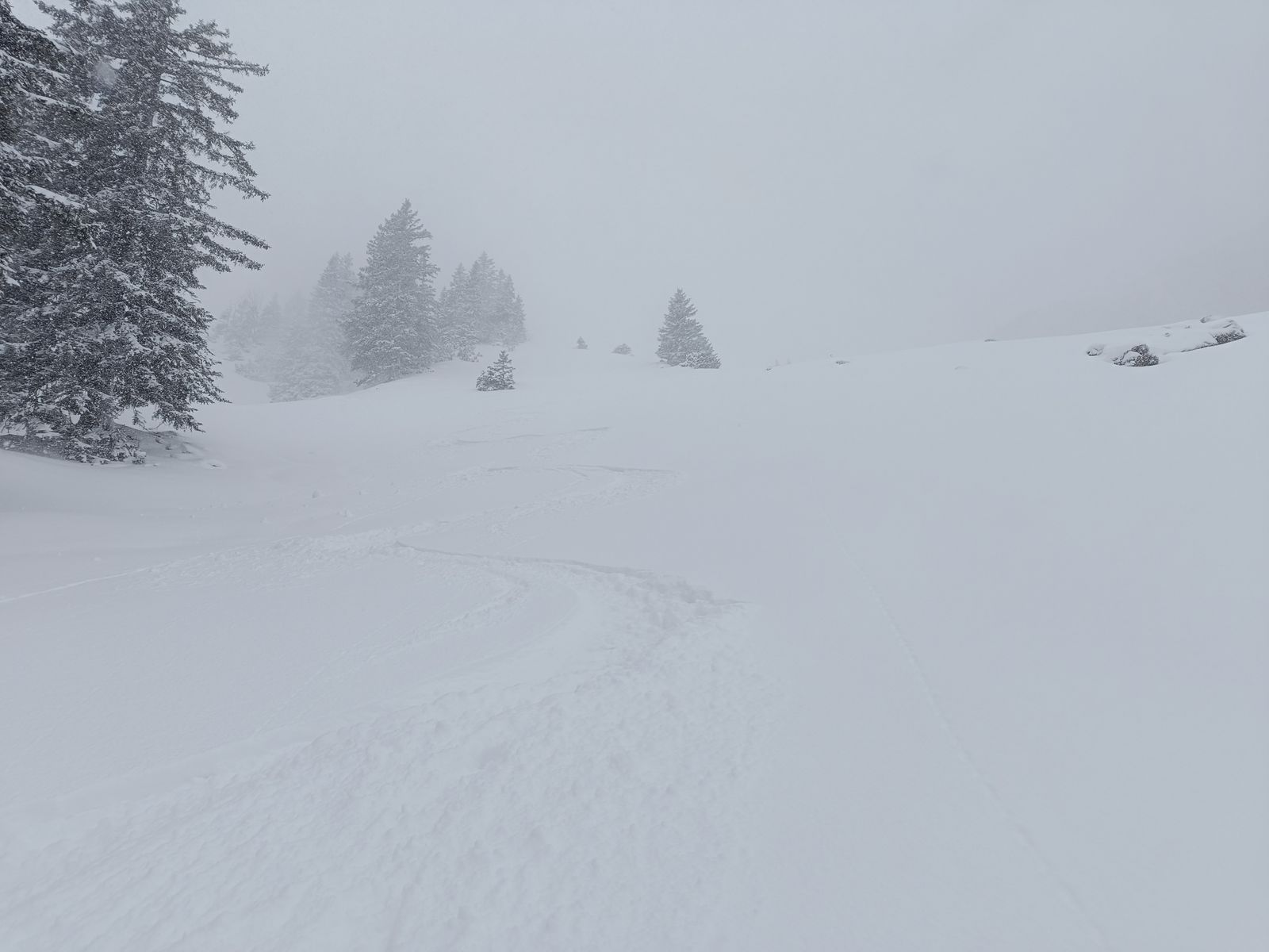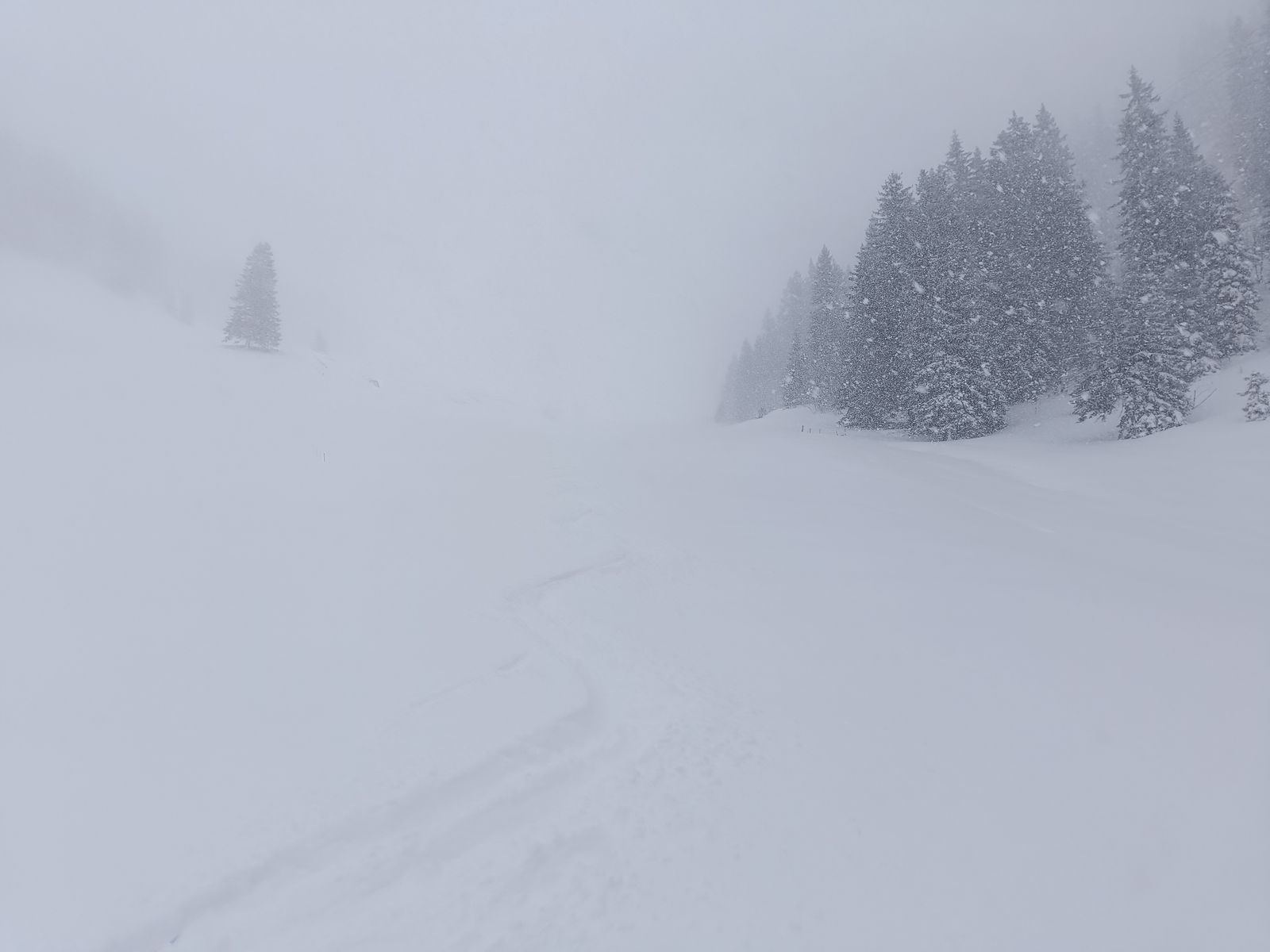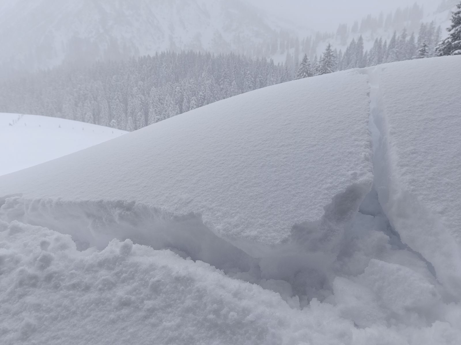 Lawinengefahr: Spannende Sache; schätze ich definitiv höher ein als der LLB, der für morgen 1-2 sagt. Interessant war heute, dass gegen Mittag die Windrichtung von West auf eher Nord gedreht hat und sich auch die Temperatur des Schnees geändert hat, sodass auf dem Neuschnee vom Vormittag eine Art Kruste entstanden ist (siehe Bild). Wenn da jetzt Triebschnee draufkommt, könnten das evtl die Zutaten für ein Schneebrett sein. Bei einer klaren Strahlungsnacht könnte sich die Kruste (eh nur sehr dünn) aber auch wieder auflösen. Dieses Phänomen war nur in Ost- und Nordhängen oberhalb von 1500 Metern zu beobachten. In Süd und West ist es wegen des Windes nicht vorhanden.