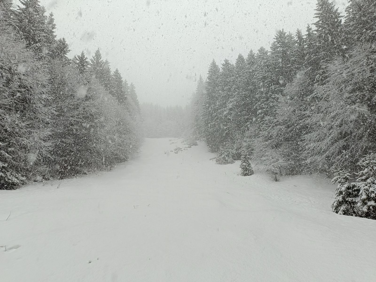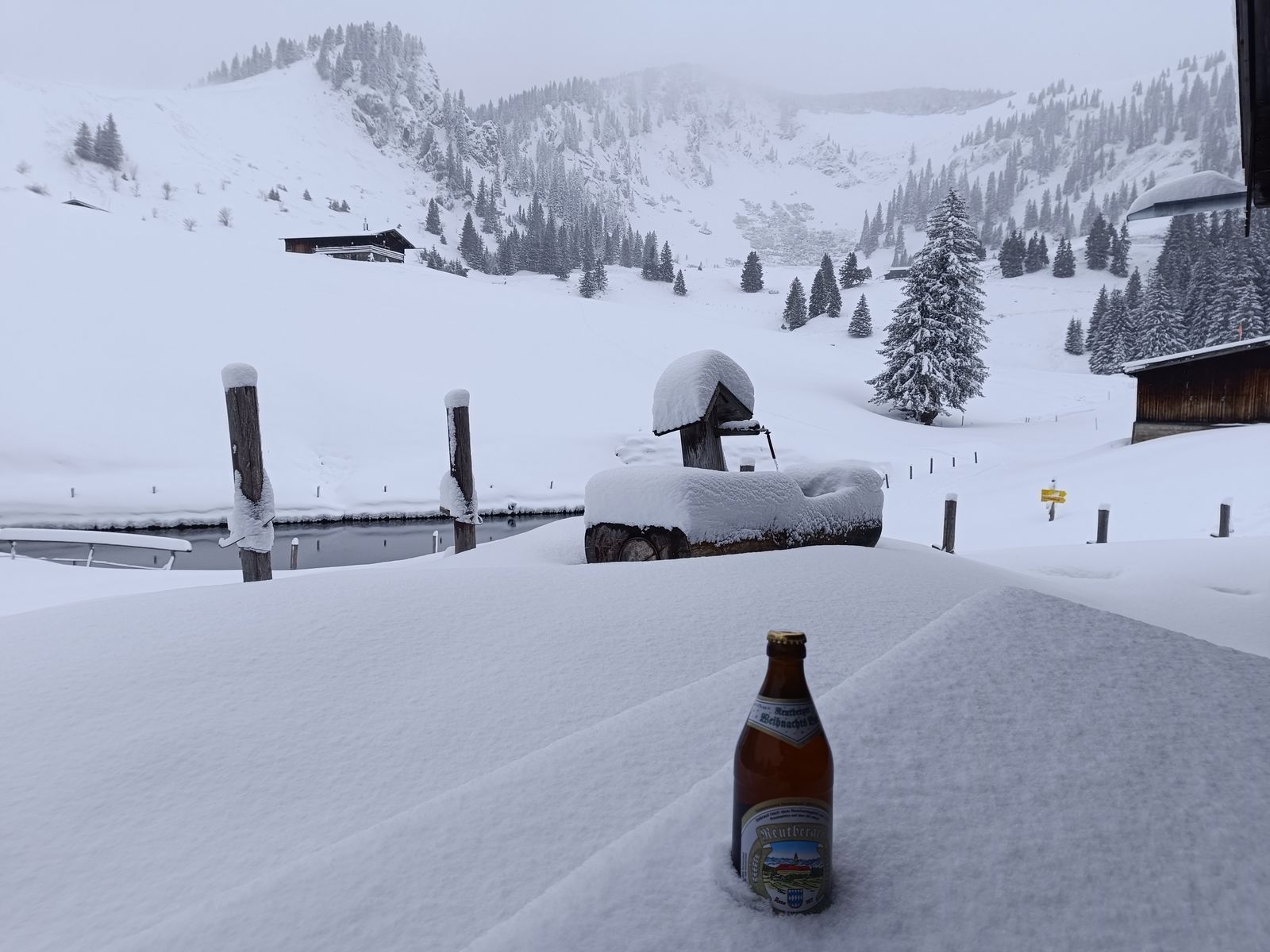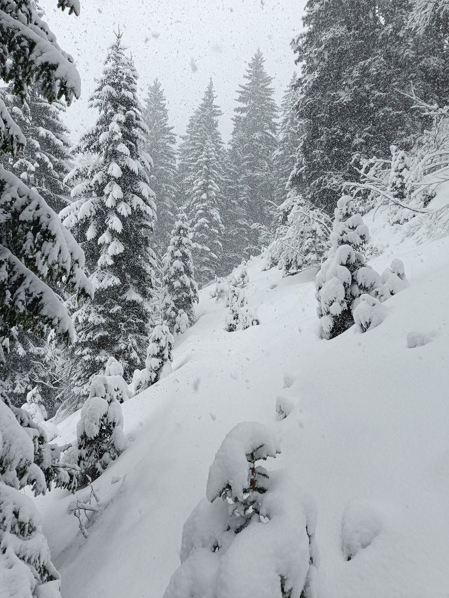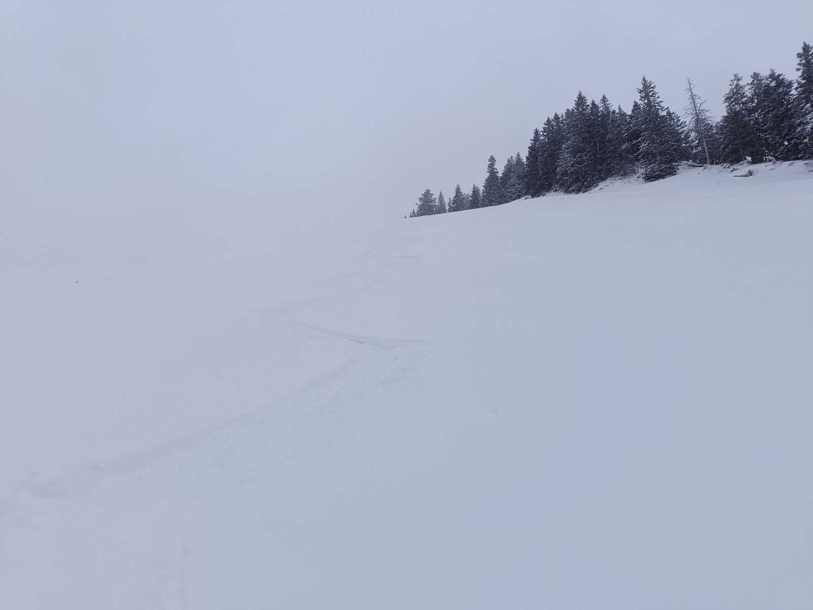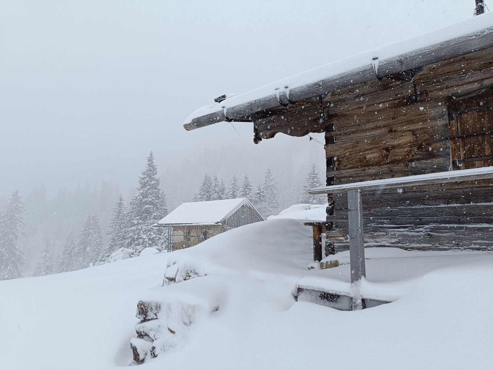 Lawinengefahr: Spannende Sache; schätze ich definitiv höher ein als der LLB, der für morgen 1-2 sagt. Interessant war heute, dass gegen Mittag die Windrichtung von West auf eher Nord gedreht hat und sich auch die Temperatur des Schnees geändert hat, sodass auf dem Neuschnee vom Vormittag eine Art Kruste entstanden ist (siehe Bild). Wenn da jetzt Triebschnee draufkommt, könnten das evtl die Zutaten für ein Schneebrett sein. Bei einer klaren Strahlungsnacht könnte sich die Kruste (eh nur sehr dünn) aber auch wieder auflösen. Dieses Phänomen war nur in Ost- und Nordhängen oberhalb von 1500 Metern zu beobachten. In Süd und West ist es wegen des Windes nicht vorhanden.