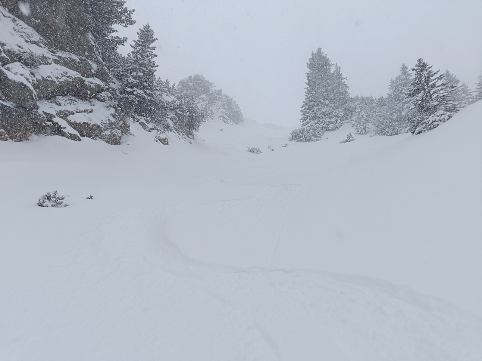In der Früh hatte ich schon die guten Skier in der Hand, mich dann aber gottseidank für den Stoaski entschieden. Mit dem Neuschnee ist die Gefahr, Steine zu erwischen, viel größer als noch am Sonntag, wo man die ja alle gesehen hat. Heute hat's drei Mal gerummst. Tanzeck- Süd (, die ich nur aufgestiegen bin, ) hat zum Beispiel lediglich direkt in der Mulde eine 5-10 Meter breite Unterlage; am Jägerkamp gibt es gar keine.