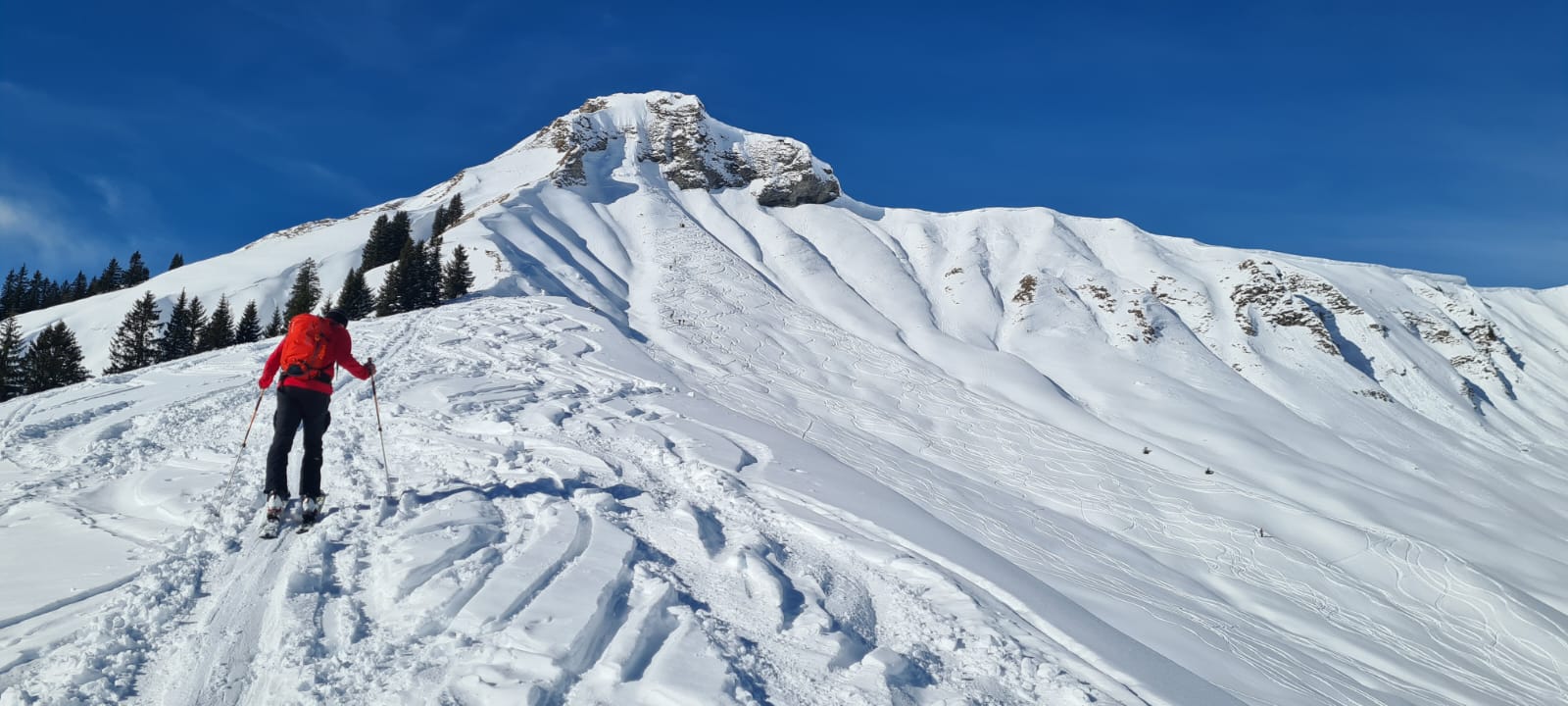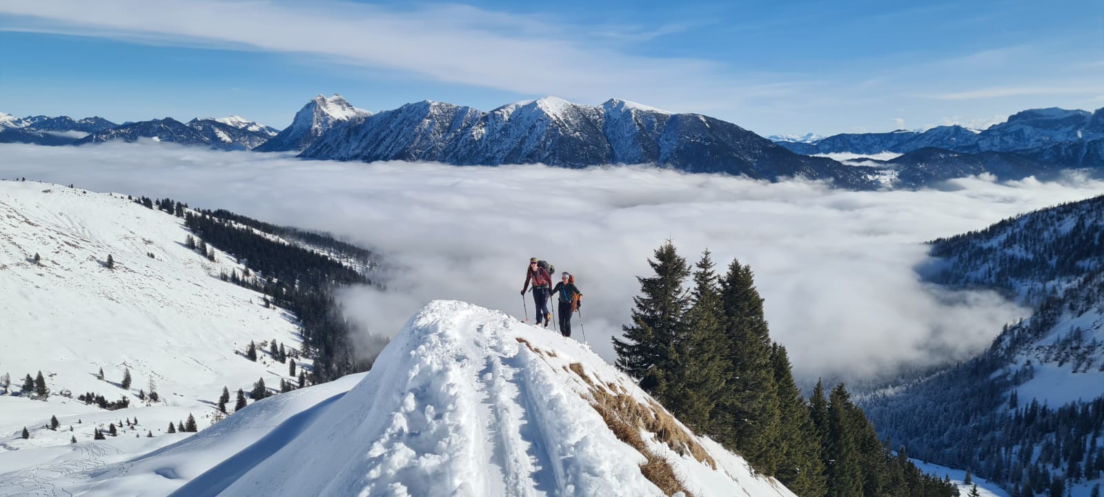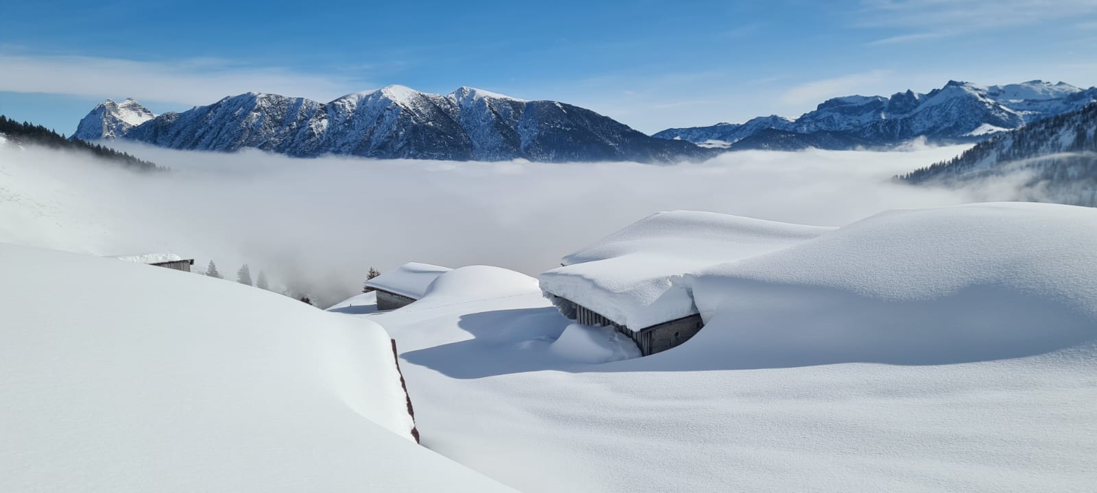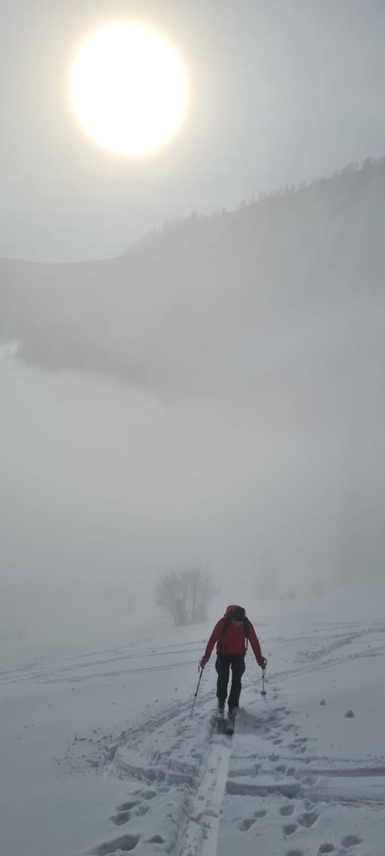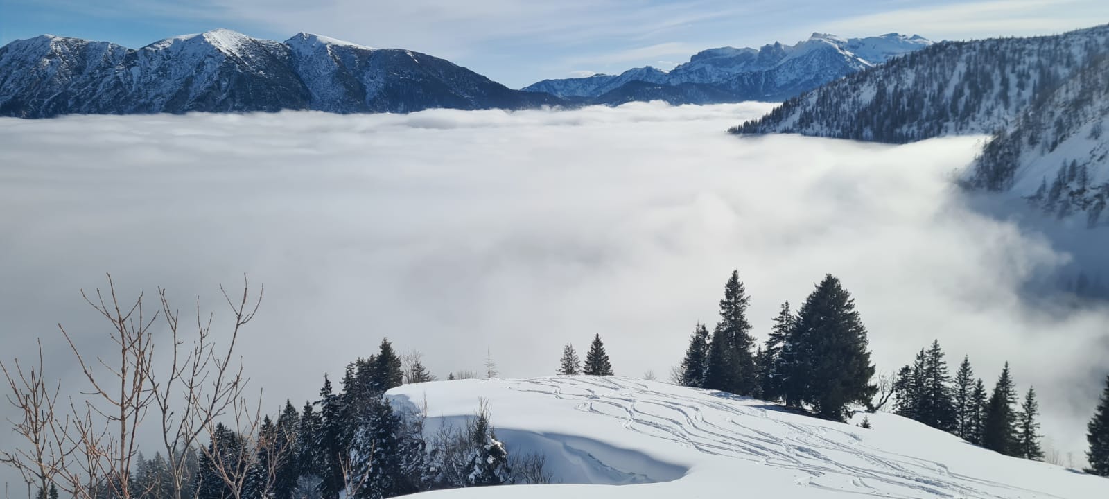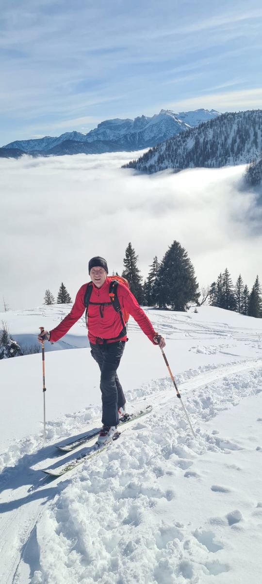 Auf beiden Routen heute sehr gute Bedingungen, noch nicht alles verspurt und bis auf die sonnenexponierten Stellen auch sehr schöner Pulverschnee. Kein Wind und herrliches Wetter. Unten waberte der Hochnebel, oben Sonne pur!