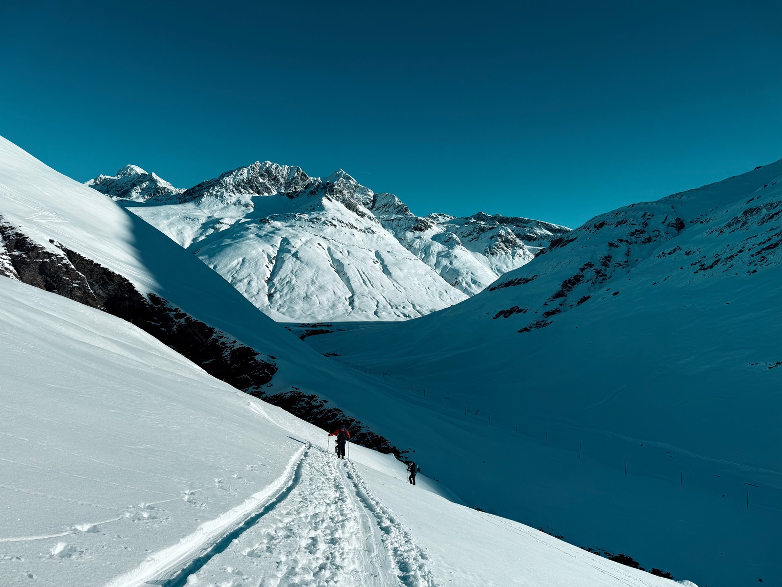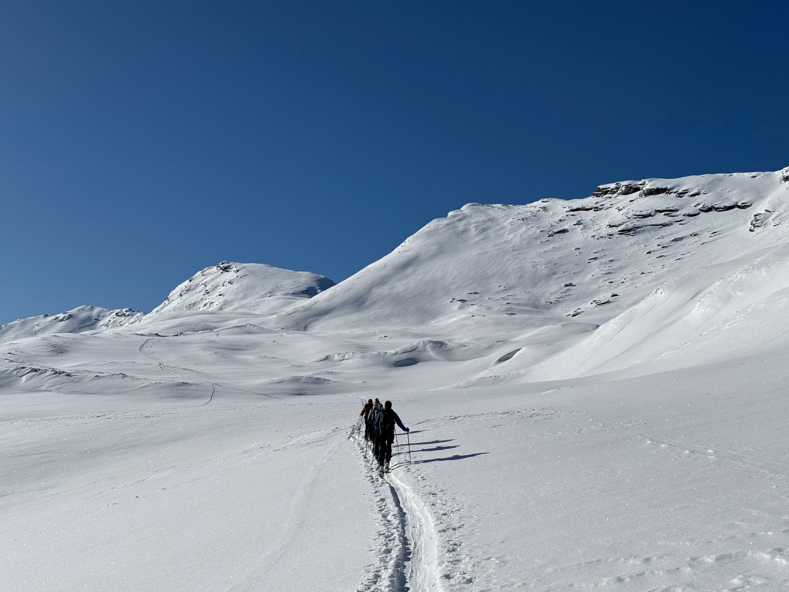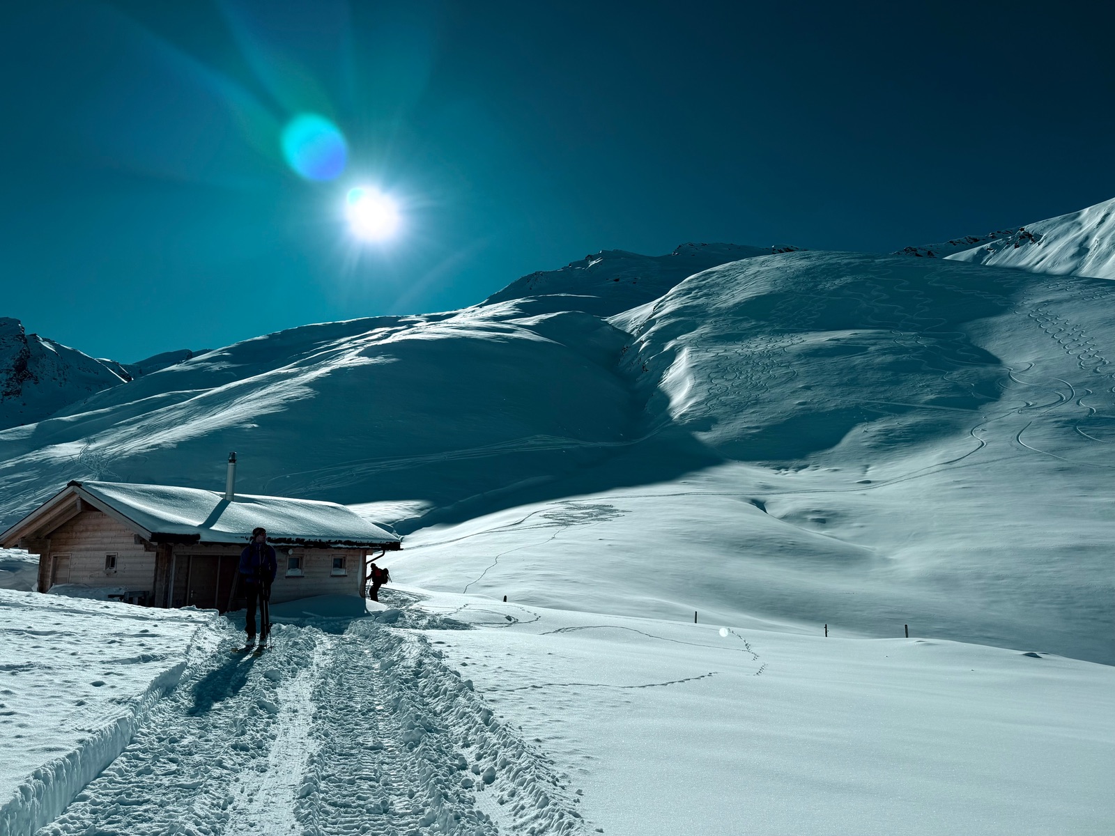 Die Bedingungen bleiben bei anhaltendem Hochdruck sicher die nächsten Tage gut, und mit Abnahme der Lawinenstufe sind dann wohl auch bald die anspruchsvolleren und bisher wenig verspurten Routen möglich.