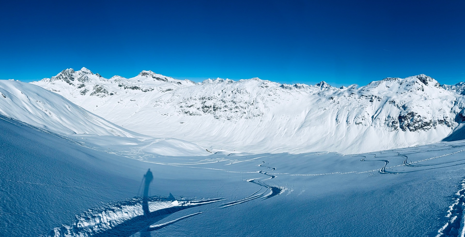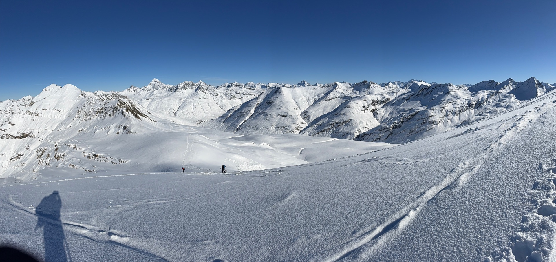 Die Lawinenlage war mit einem 3er recht angespannt, so dass das Angebot an machbaren Touren eingeschränkt war. Aber es gab trotzdem noch ausreichend sanft geneigte Hänge an denen man sich ausgiebigst austoben konnte. Am Samstag starteten wir mit dem Großhora. Aufgrund der diffusen Sicht war hier noch etwas Zurückhaltung angesagt. Bei strahlendem Sonnenschein boten dafür am Sonntag die Hänge am Bödagrat unbeschwertes Powdervergnügen. Ganz oben in den Gipfelbereichen gab es noch etwas Risiko für Feindkontakt, doch dann erwartete uns ungetrübter Abfahrtsspaß über 800 Tiefenmeter. Das Gelände war nicht übermäßig aber vollkommen ausreichend eingeschneit, und der Schnee fluffig und weich. Am Montag folgte dann das Wengahorn, und der untere, flachere Teil hoch zum Jufenhorn. Abermals wurde Powder vom Feinsten geboten, mit Ausnahme des Gipfelhangs vom Wengahorn der noch nicht ausreichend eingeschneit war.