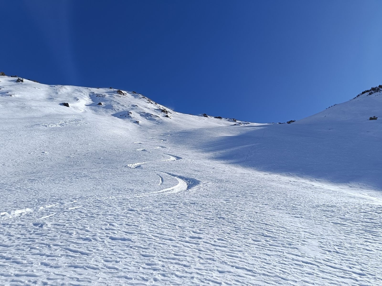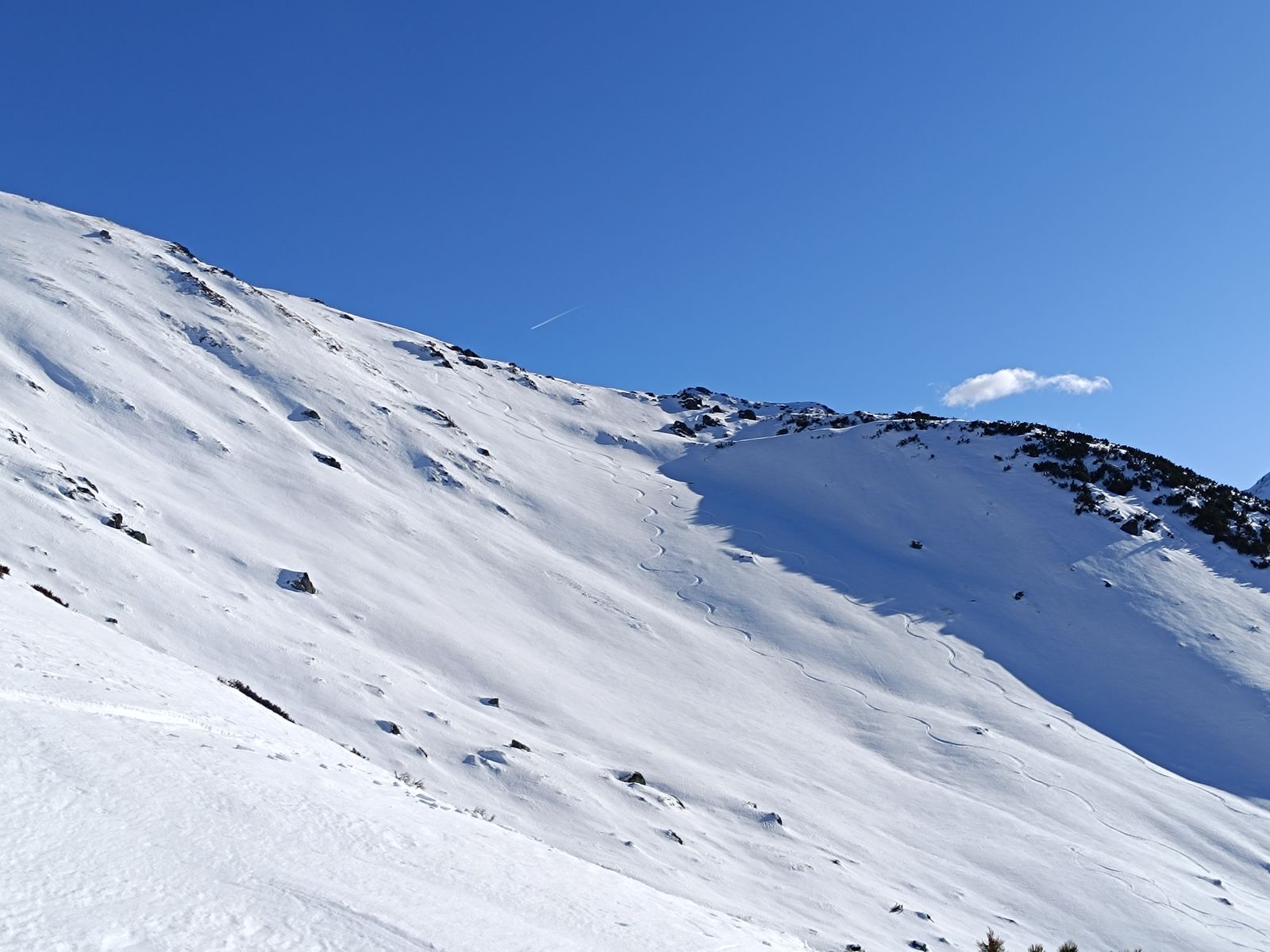 Route: Zunächst auf dem Normalweg zum Gerstinger Joch. Auf den obersten 200 Hm sind Harscheisen hilfreich. Wegen des schlechten Schnees (meist Bruchharsch) in der Abfahrt wohl eher unspaßig. Es sei denn, man fährt über die sehr steile Nordflanke ab - das sieht super aus! Da das heute aber nicht in meinen Plan passte, bin ich nun über den Südhang zur Einsattelung vor den Tanzkogeln hinab (je nach Geschmack mit oder ohne Felle) und jenseits hinauf. Nach einer schönen Zwischenabfahrt vom Tanzkogel (Nord) wieder hoch und weiter zum Schwarzkarkogel. Dessen Nordwestseite Richtung Miesenbachalm war bis auf meine eigene Spur vom Sonntag noch völlig unberührt und hat besten Pulver (wenn man auf die Feinexposition achtet). Also gleich wieder hoch, aber dieses Mal nicht zum Schwarz, sondern zu einem namenlosen Gupf südlich davon mit schöner Nordwestmulde. Geile Abfahrt! Gleich nochmal! Als ich dann zum dritten Mal auf dem Gupf war, ging es (mit Fellen) in den Sattel vor dem Westerachkopf und schließlich zu diesem hinauf. Talabfahrt (Nordost, leicht windgepresst) zur Karalm und durch den Unteren Grund zum PP zurück.