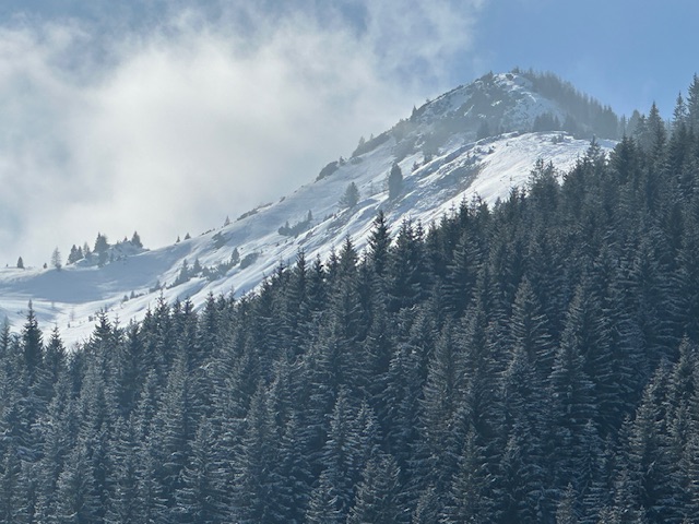 Zu den Verhältnissen: Im Aufstieg musste ich auf dem Waldwegstück ein paar Minuten tragen, ansonsten durchgehend Schnee. Aber halt superwenig, manchmal zwei Zentimeter. Dort, wo keine Bäume den Schneefall stoppen, ist es besser und mehr. Insgesamt eine knappe, aber robuste Unterlage mit einem Hauch Neuschnee. Aufstieg problemlos, Abfahrt mit dem frischen Pulver auch ganz gut - aber Obacht auf der Forststraße unterhalb der Falkenmoosalm, da gibt es 1-2 steinige Stellen (eine hab ich zu spät gesehen…).