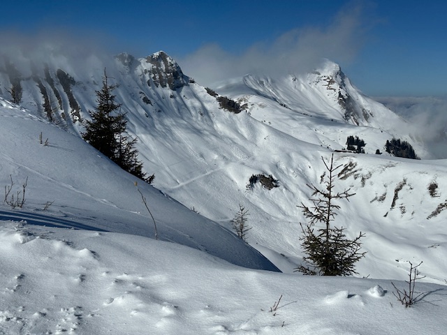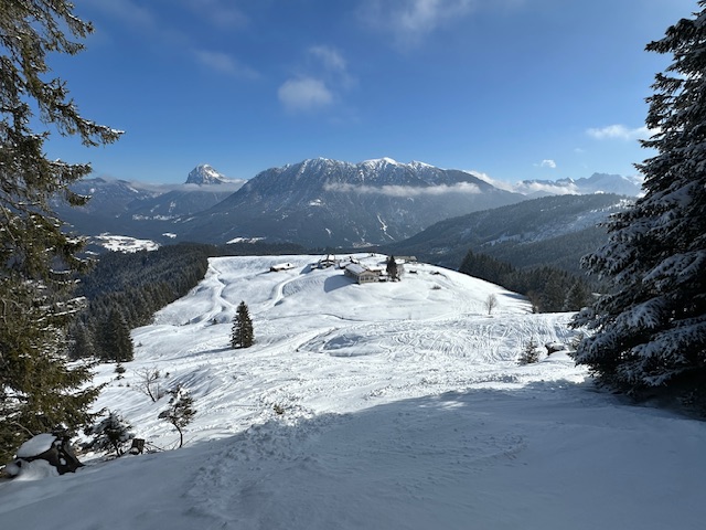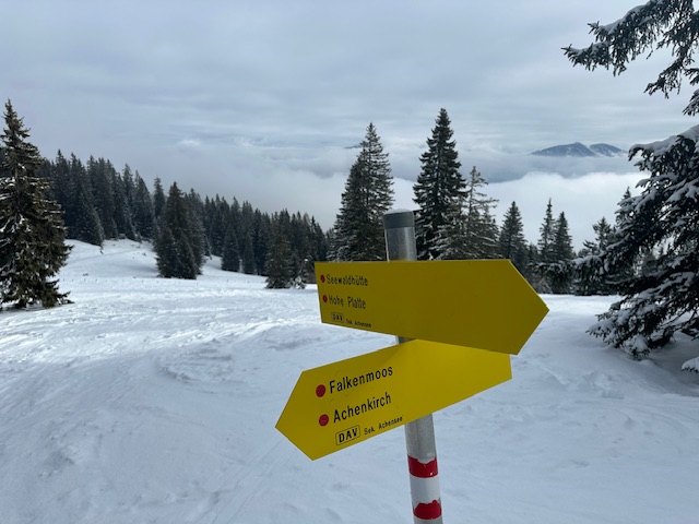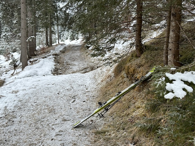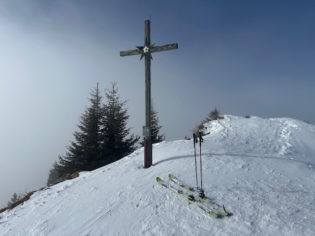 Zu den Verhältnissen: Im Aufstieg musste ich auf dem Waldwegstück ein paar Minuten tragen, ansonsten durchgehend Schnee. Aber halt superwenig, manchmal zwei Zentimeter. Dort, wo keine Bäume den Schneefall stoppen, ist es besser und mehr. Insgesamt eine knappe, aber robuste Unterlage mit einem Hauch Neuschnee. Aufstieg problemlos, Abfahrt mit dem frischen Pulver auch ganz gut - aber Obacht auf der Forststraße unterhalb der Falkenmoosalm, da gibt es 1-2 steinige Stellen (eine hab ich zu spät gesehen…).